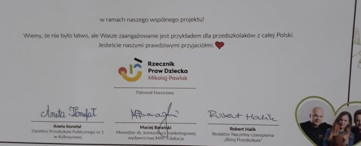 W roku szkolnym 2019/2020 przedszkolaki brały udział w projekcie ,,Mały miś w wielkim świecie literatury”. Doświadczyły jak rozwijające i przynoszące wiele radości może być czytanie książek. Dzieci w przedszkolu realizowały 6 modułów, a w domu gościły codziennie misia o imieniu ,,Bruno”, któremu czytały ulubione polskie bajki. W każdym module pojawił się wątek promujący czytelnictwo wśród […]