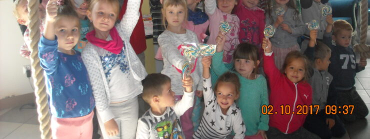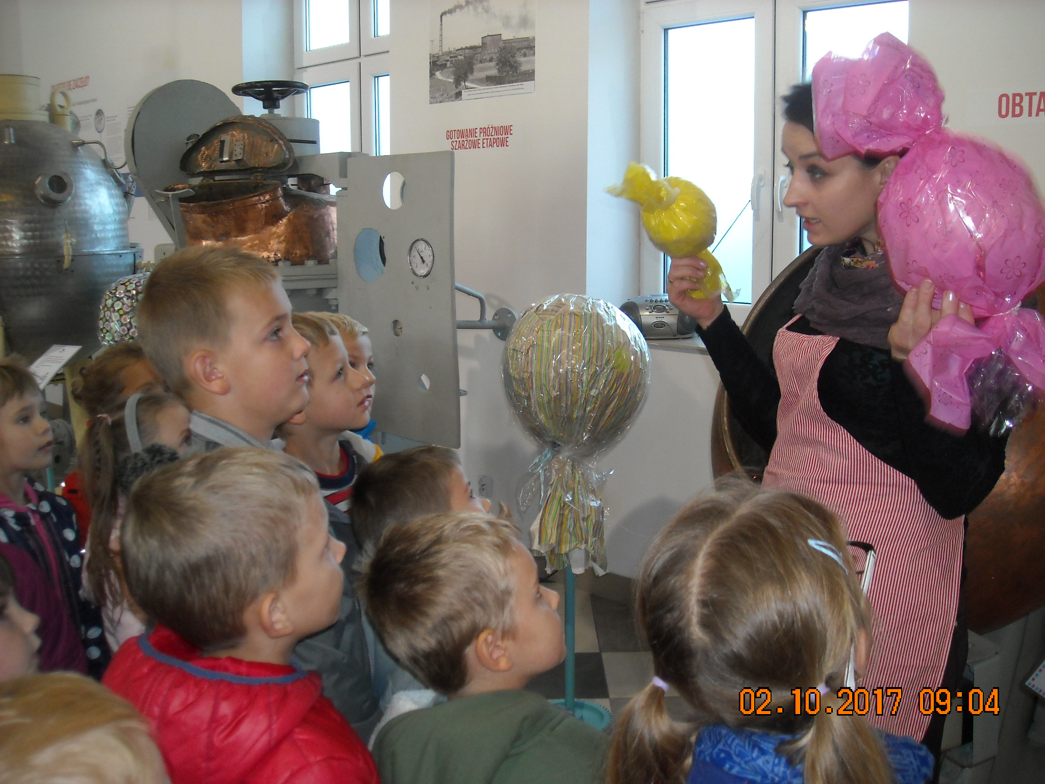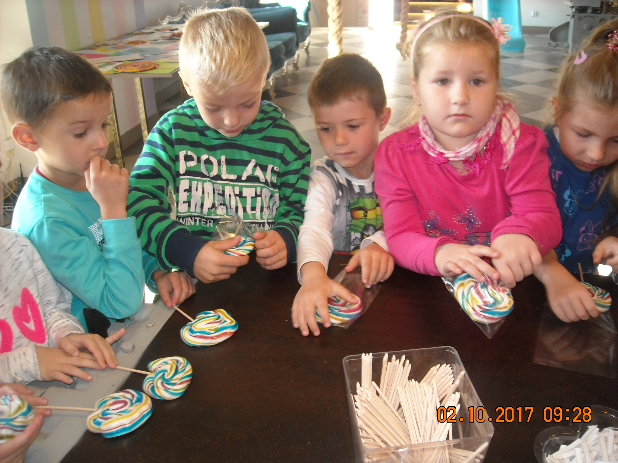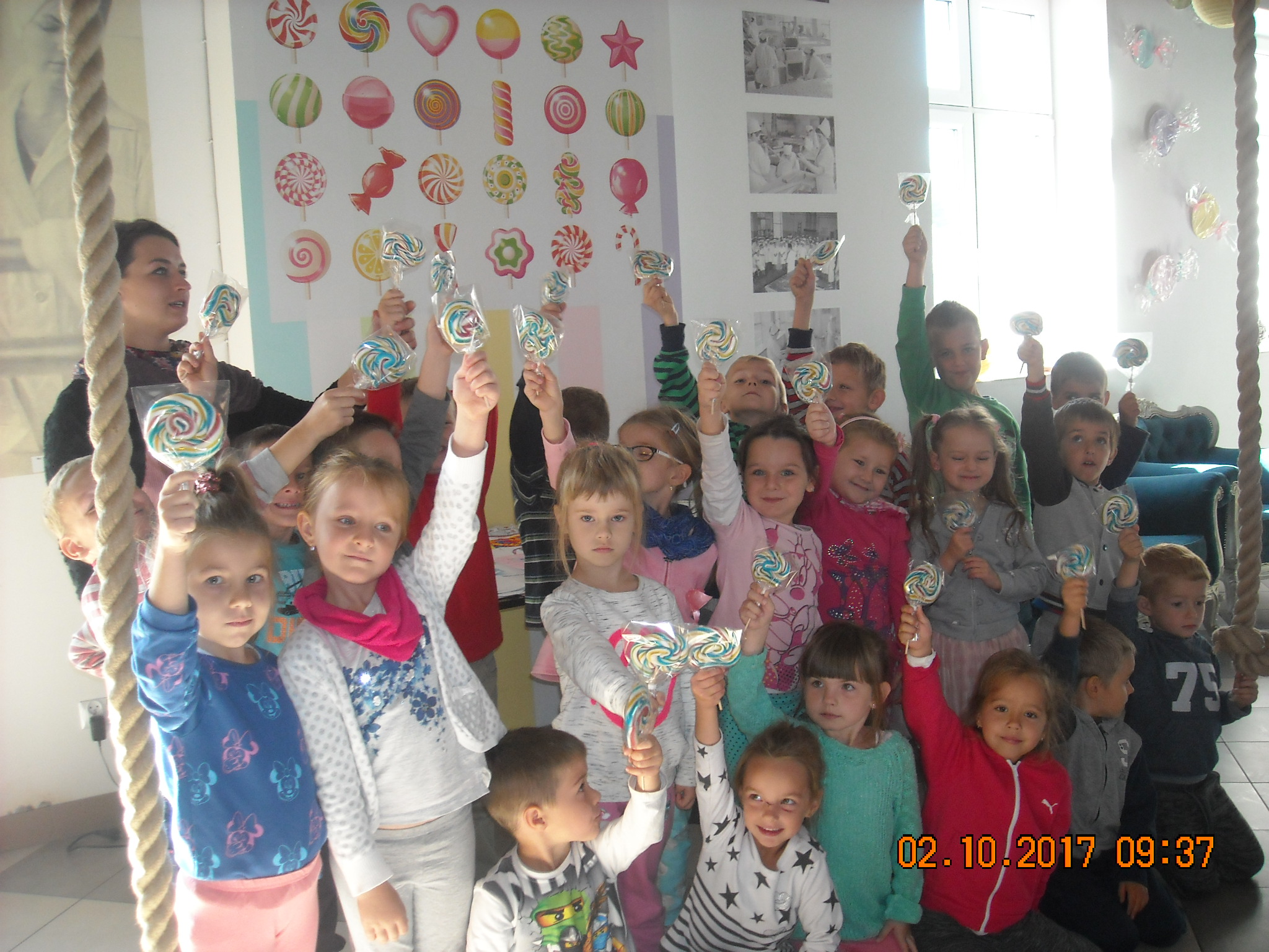 W dn. 02.10.2017r. dzieci 5,6-letnie udały się na wycieczkę do Muzeum Lizaka w Jaśle. Przedszkolaki mogły w muzeum powąchać, dotknąć i posmakować różnego rodzaju cukrów, które są wykorzystywane do produkcji słodyczy. Główną atrakcją była możliwość zobaczenia z bliska całego procesu powstawania lizaka, a także bezpośredni udział w nim. Odwiedzając Muzeum Lizaka dzieci mogły stworzyć lizak według własnego pomysłu.