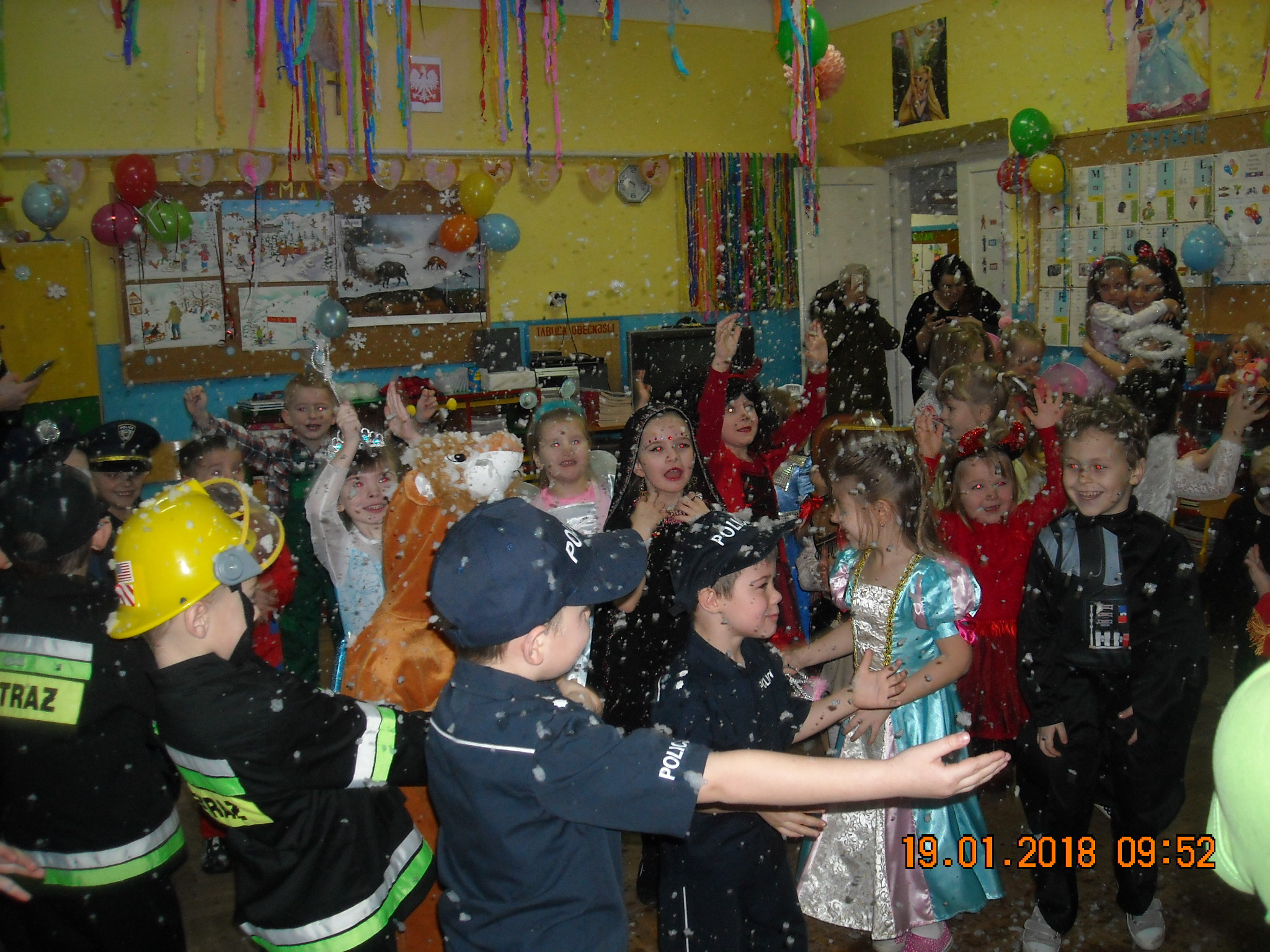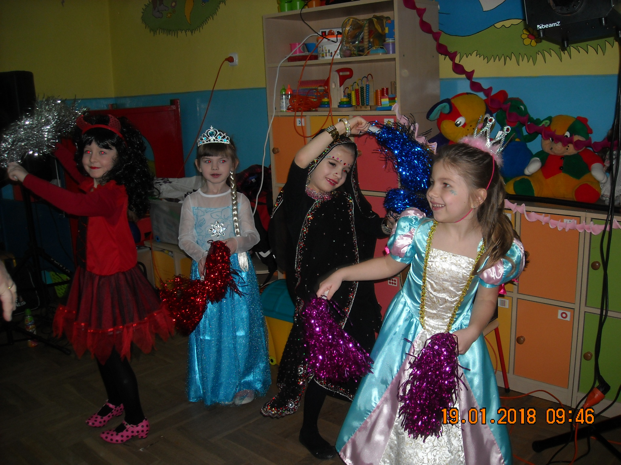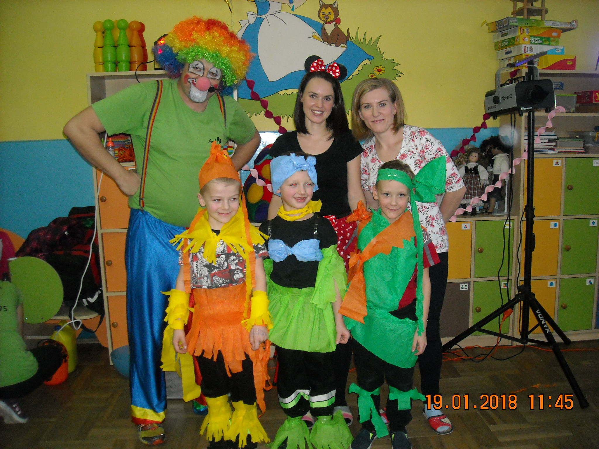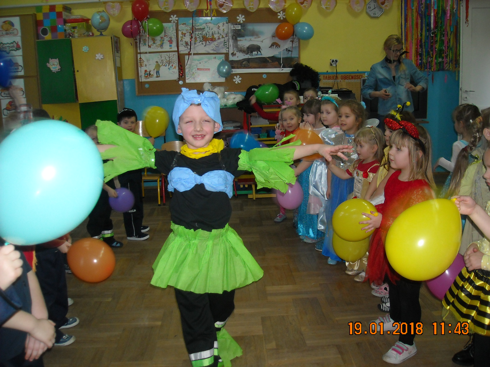 W dniu 19.01.2018r. w naszym przedszkolu odbył się bal karnawałowy. Tego dnia od rana pojawiały się kolorowe postacie. Dzieci przebrane były za bohaterów znanych bajek. Wystrój sali wprowadził w radosny nastrój oraz zachęcał wszystkich do wesołej zabawy. Na tę wyjątkową okazję zaprosiliśmy Klauna Roberto i Minionka. Dzieci świetnie się bawiły uczestnicząc w wielu konkursach, pokazie mody ekologicznej, wybrano również najpiękniejszy strój karnawałowy. Po poczęstunku muzyka znów porwała wszystkich do tańca wśród sypiącego śniegu. Na zakończenie odbył się pokaz baniek mydlanych w wykonaniu Klauna Roberto. Wspólna zabawa przyniosła wiele radości naszym wychowankom.