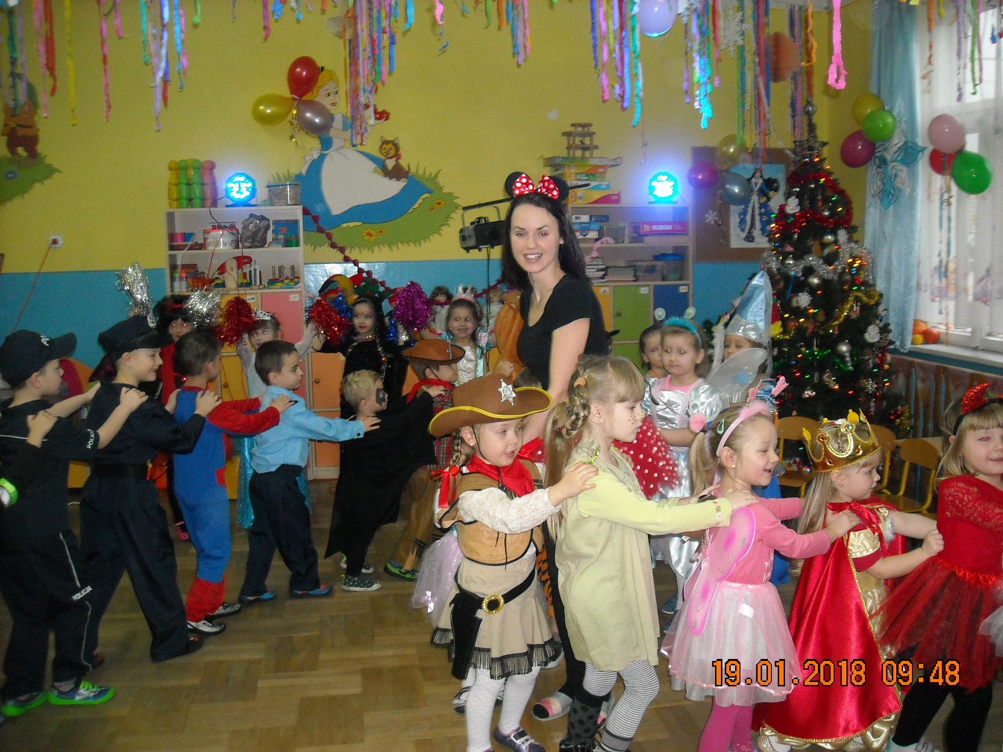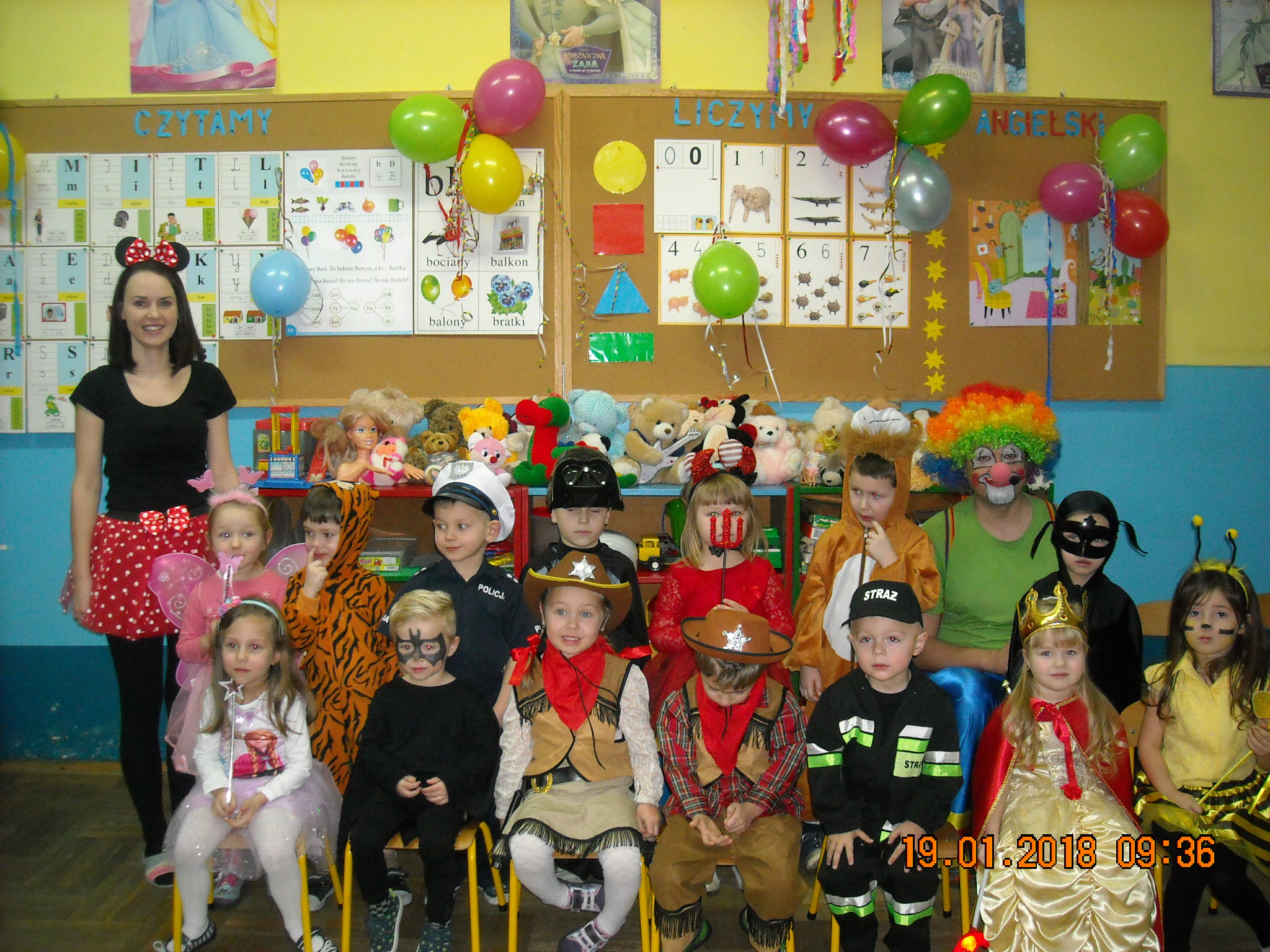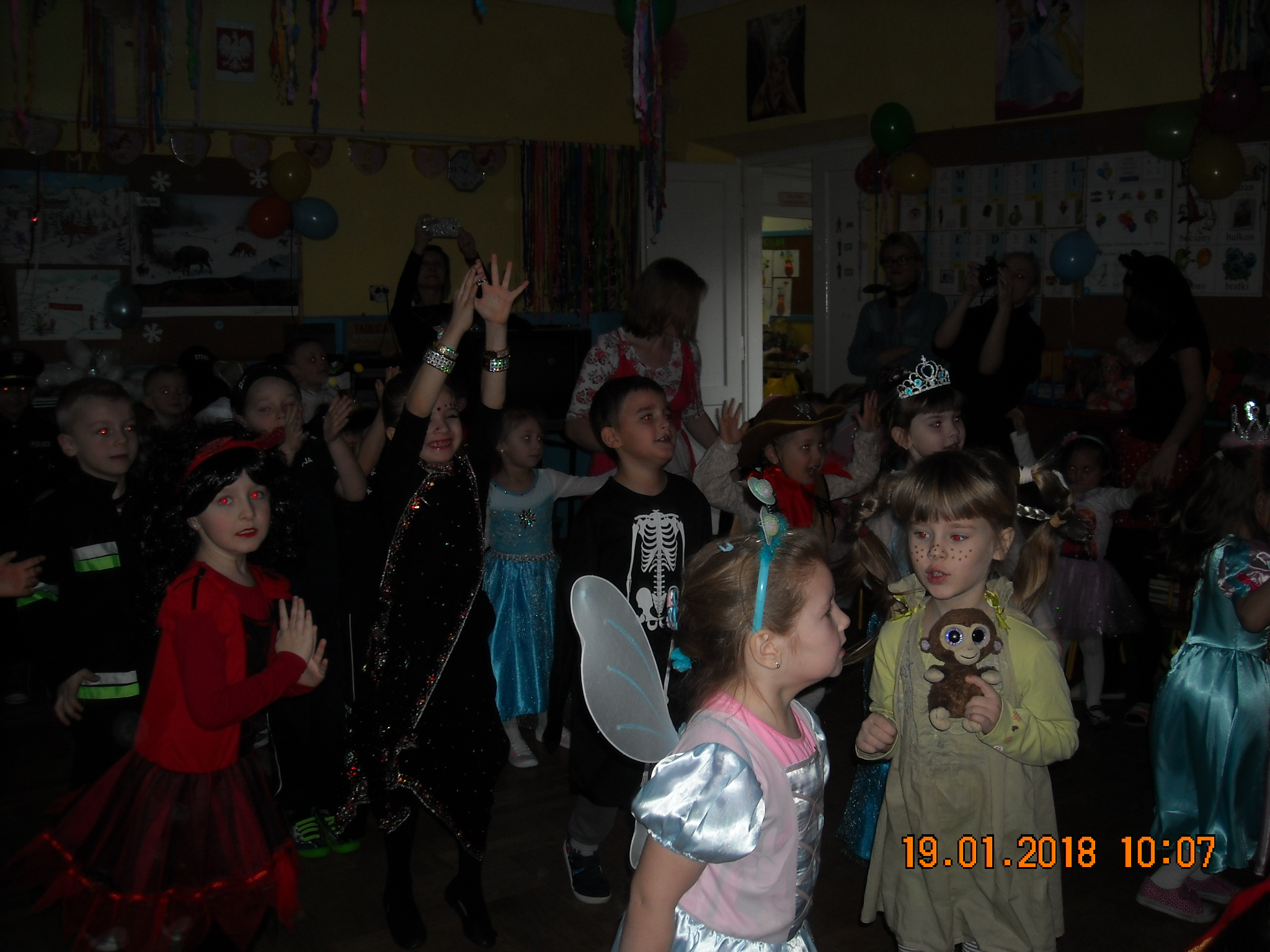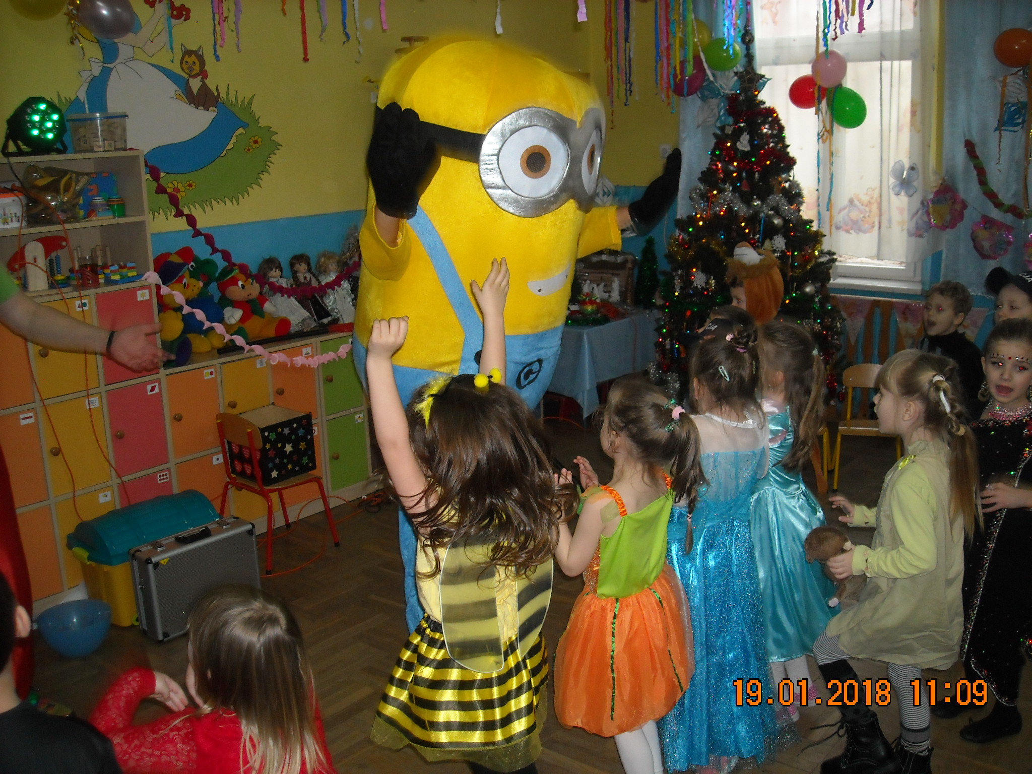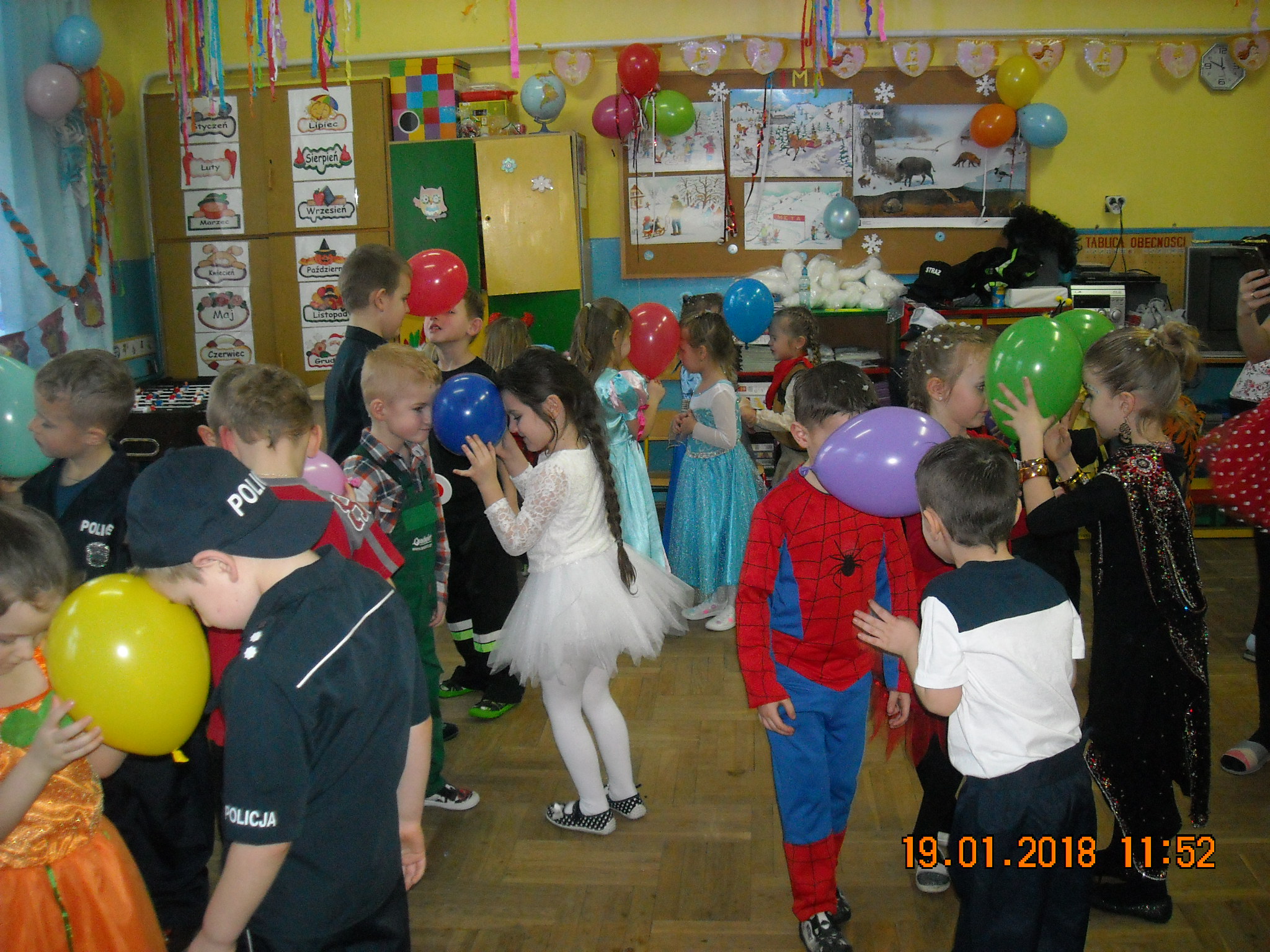 W dniu 19.01.2018r. w naszym przedszkolu odbył się bal karnawałowy. Tego dnia od rana pojawiały się kolorowe postacie. Dzieci przebrane były za bohaterów znanych bajek. Wystrój sali wprowadził w radosny nastrój oraz zachęcał wszystkich do wesołej zabawy. Na tę wyjątkową okazję zaprosiliśmy Klauna Roberto i Minionka. Dzieci świetnie się bawiły uczestnicząc w wielu konkursach, pokazie mody ekologicznej, wybrano również najpiękniejszy strój karnawałowy. Po poczęstunku muzyka znów porwała wszystkich do tańca wśród sypiącego śniegu. Na zakończenie odbył się pokaz baniek mydlanych w wykonaniu Klauna Roberto. Wspólna zabawa przyniosła wiele radości naszym wychowankom.