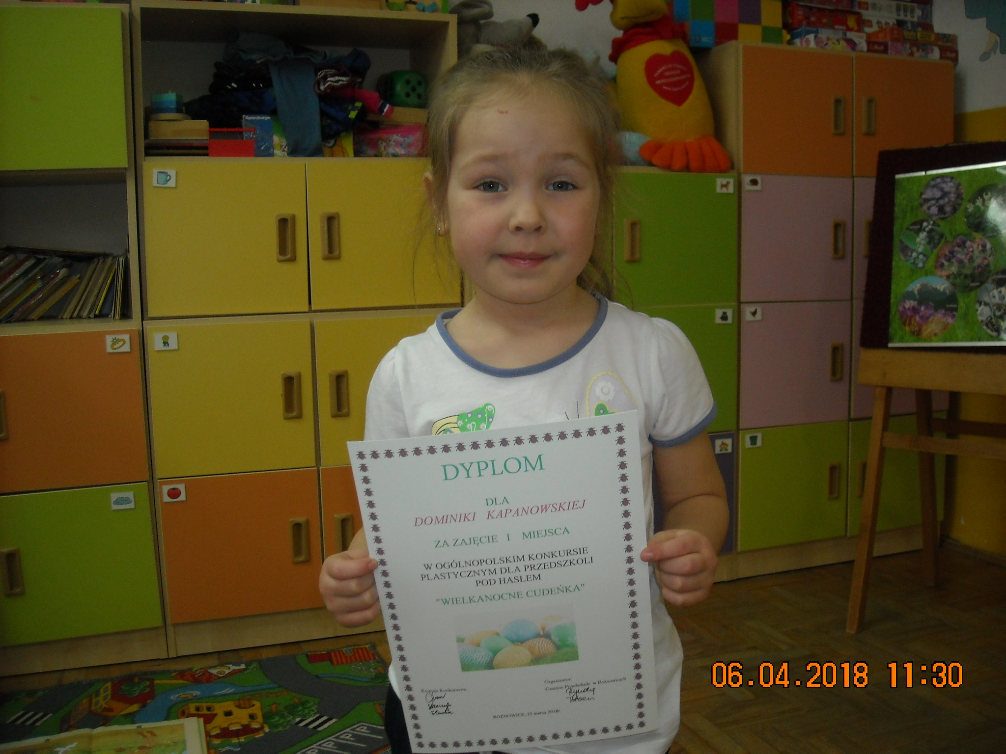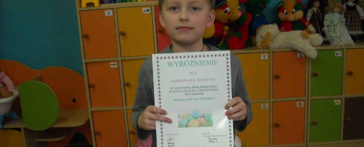 W dniu 23.03.2018 roku w Gminnym Przedszkolu w Rożnowicach został rozstrzygnięty konkurs plastyczny pt. „Wielkanocne cudeńka”. Celem konkursu było promowanie twórczości plastycznej dzieci, rozwijanie zainteresowań działalnością plastyczno – techniczną. Na konkurs wpłynęło 97 prac z całej Polski, w tym prace naszych przedszkolaków. Dominika Kapanowska z grupy 3-4 latków zdobyła 1 miejsce, a Przemysław Bochenek z grupy 5-6 latków otrzymał wyróżnienie. Dzieci otrzymały dyplomy oraz cenne nagrody rzeczowe.