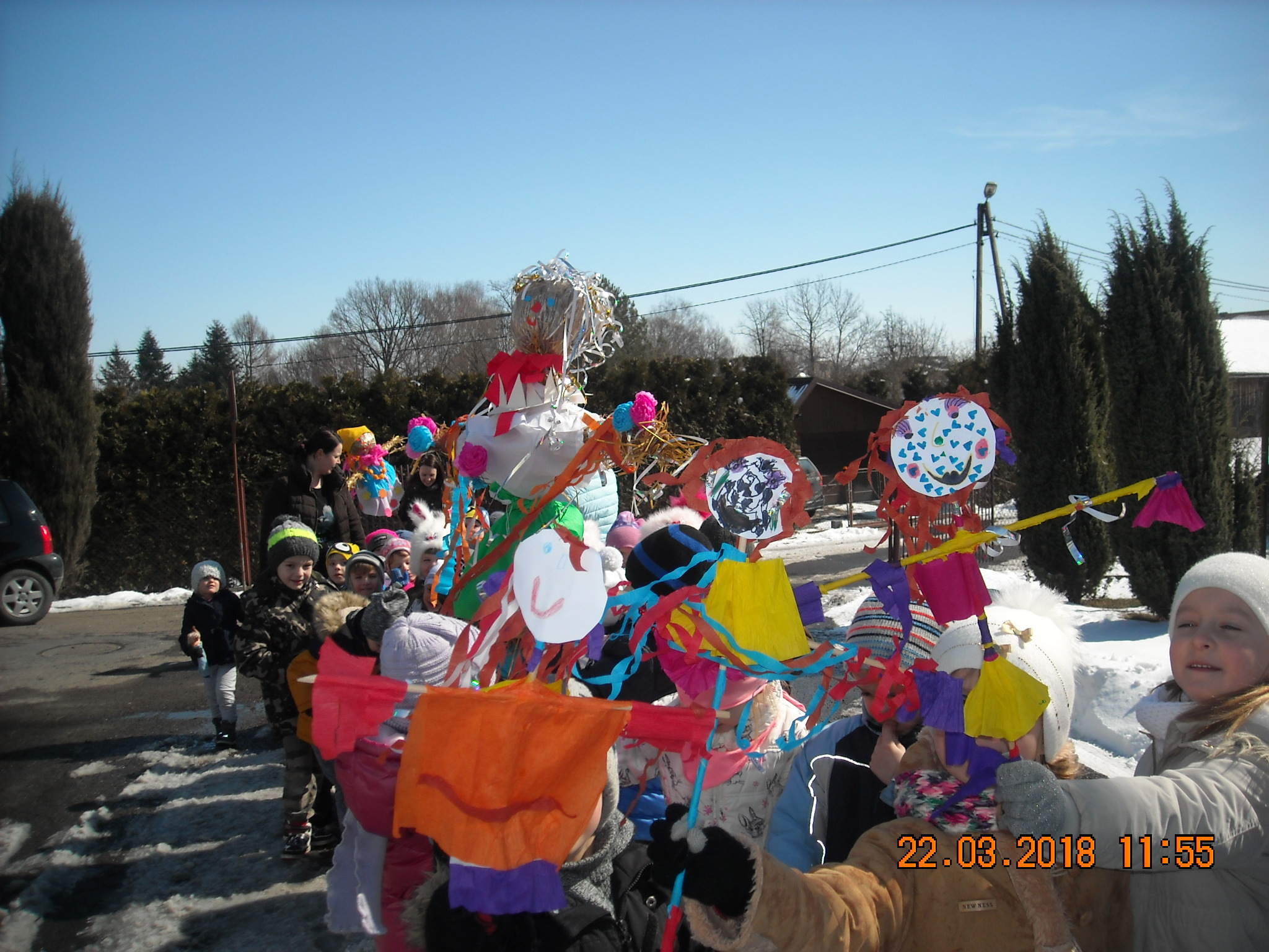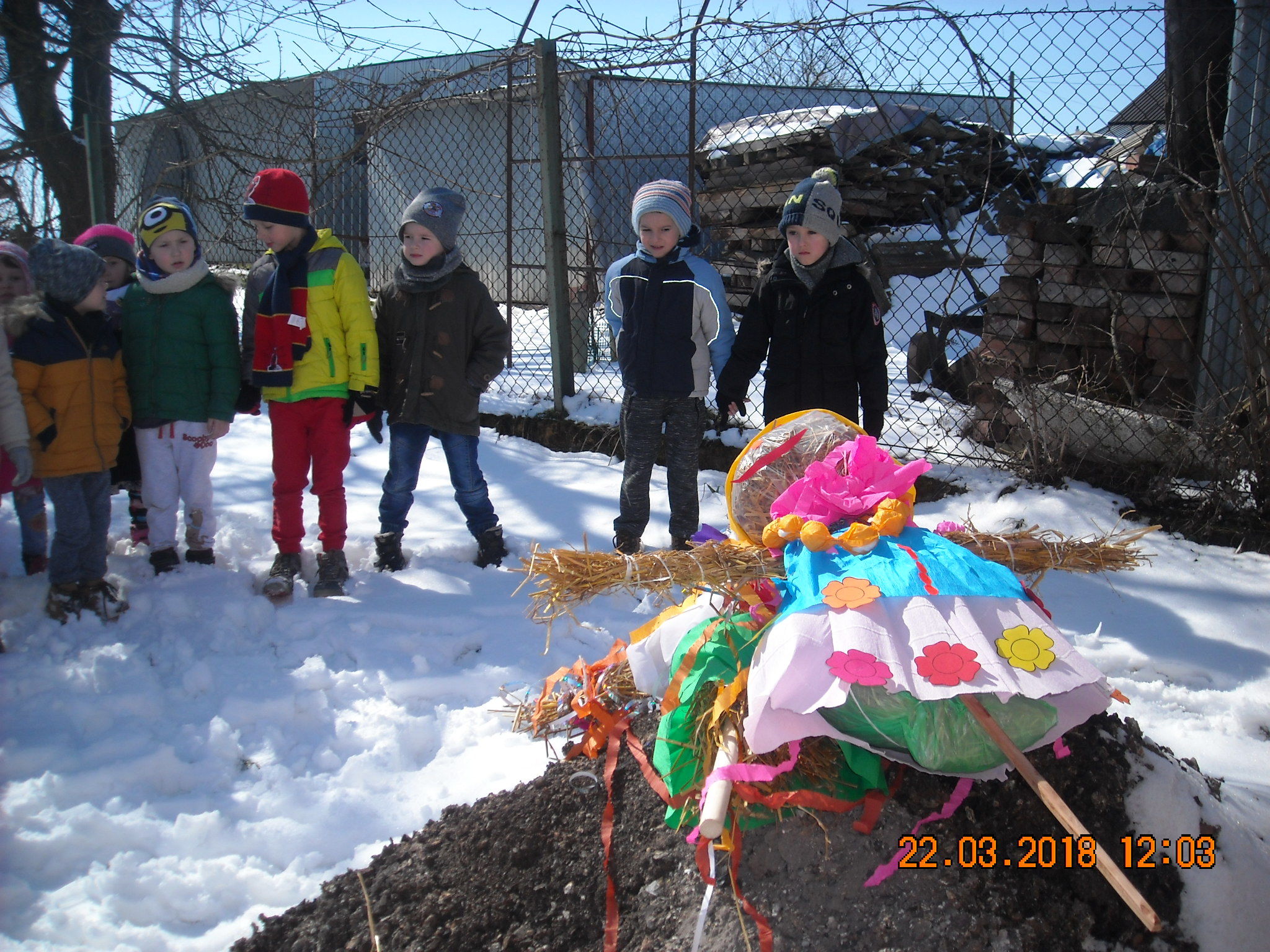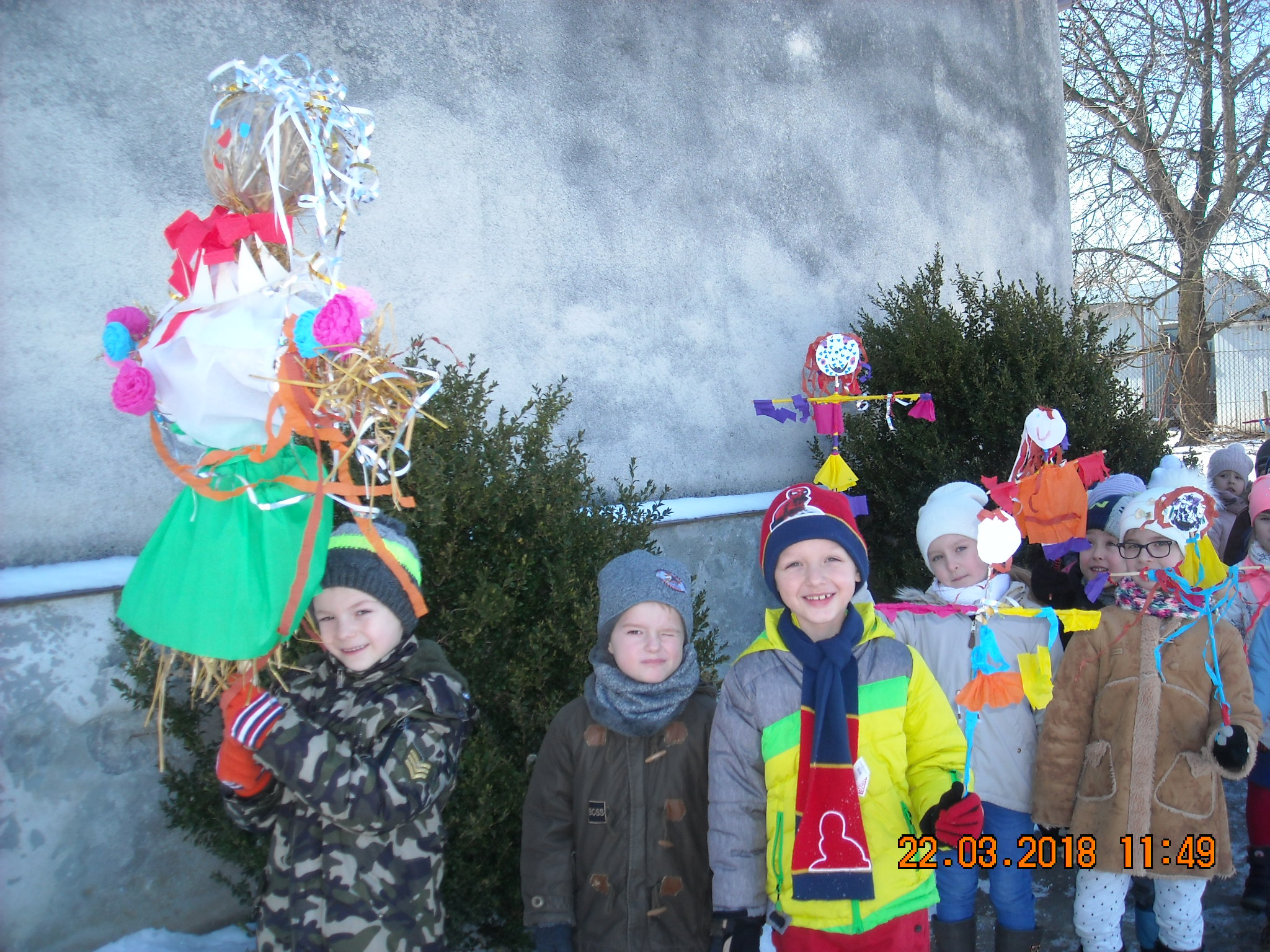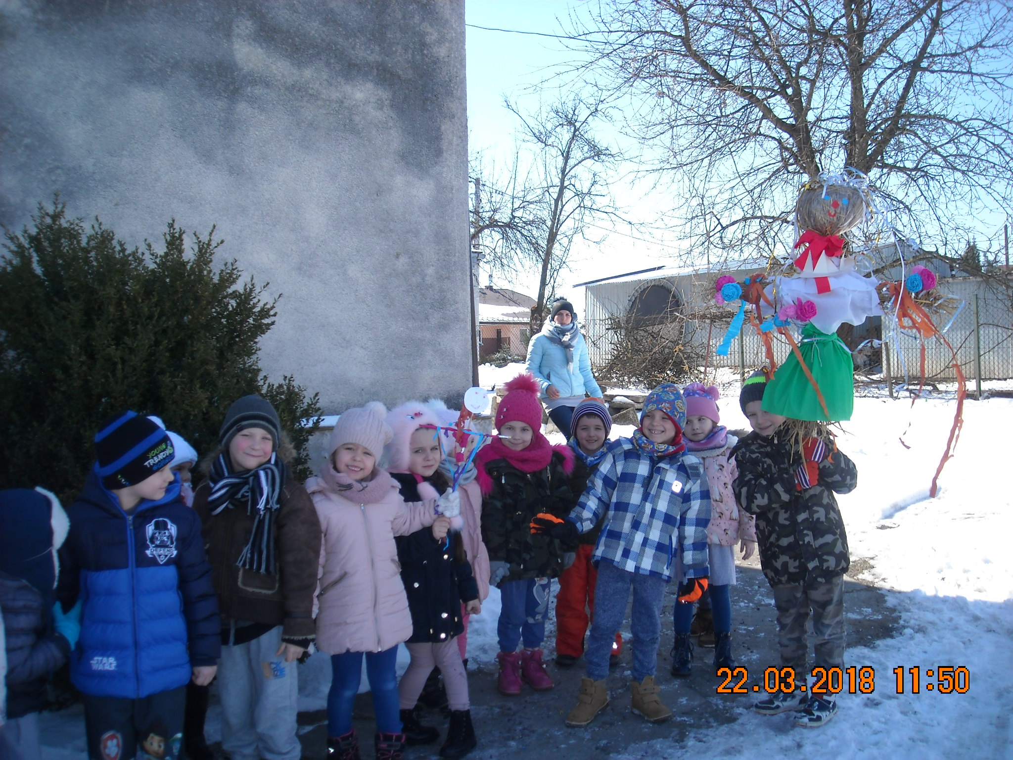 W dniu 22.03.2018 roku przedszkolaki zgodnie z tradycją postanowiły pożegnać zimę i przywitać długo oczekiwaną wiosnę. Wspólnie przygotowały z materiałów ekologicznych kukłę w kolorowym przebraniu. Po wspólnym spacerze z Marzanną dzieci otoczyły ją kołem i wierszem oraz piosenką przekonały zimę, aby odeszła i już nie wracała. Tym samym zaprosiliśmy wiosnę, by zajęła miejsce odchodzącej zimy.