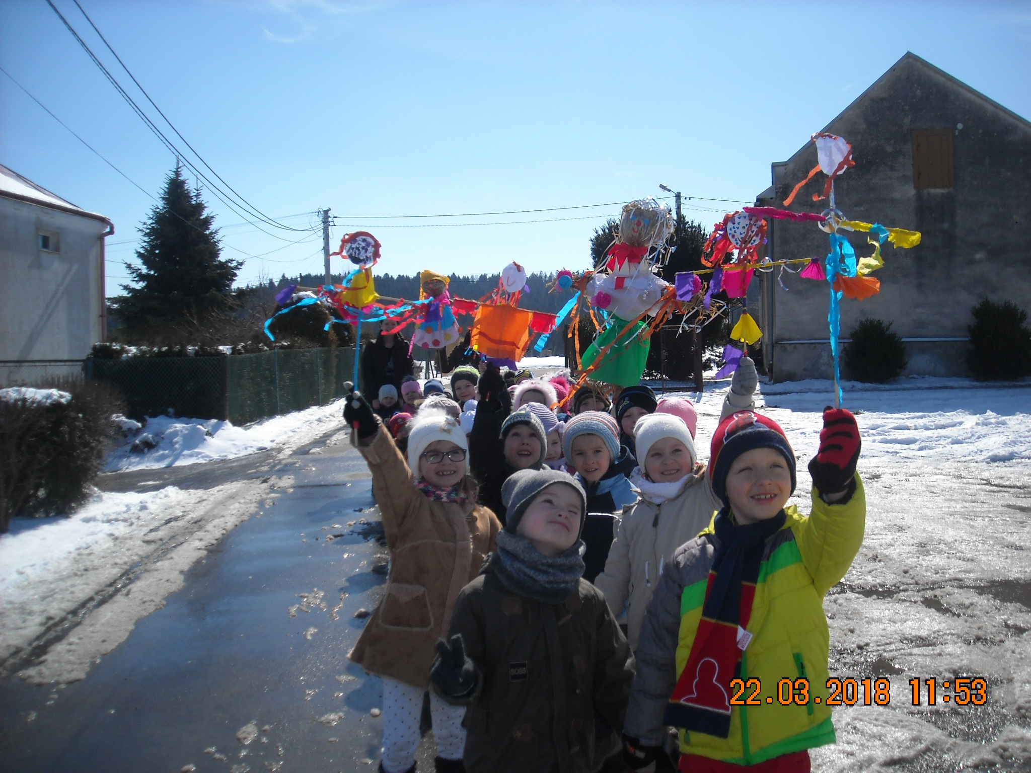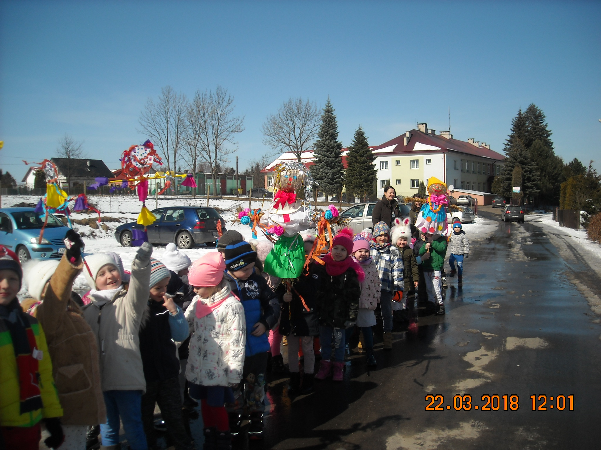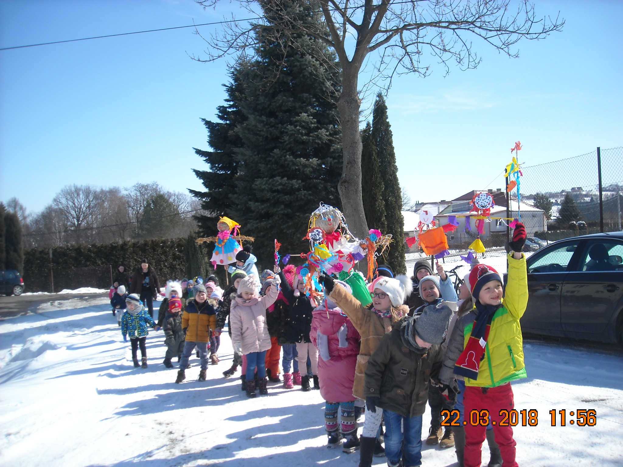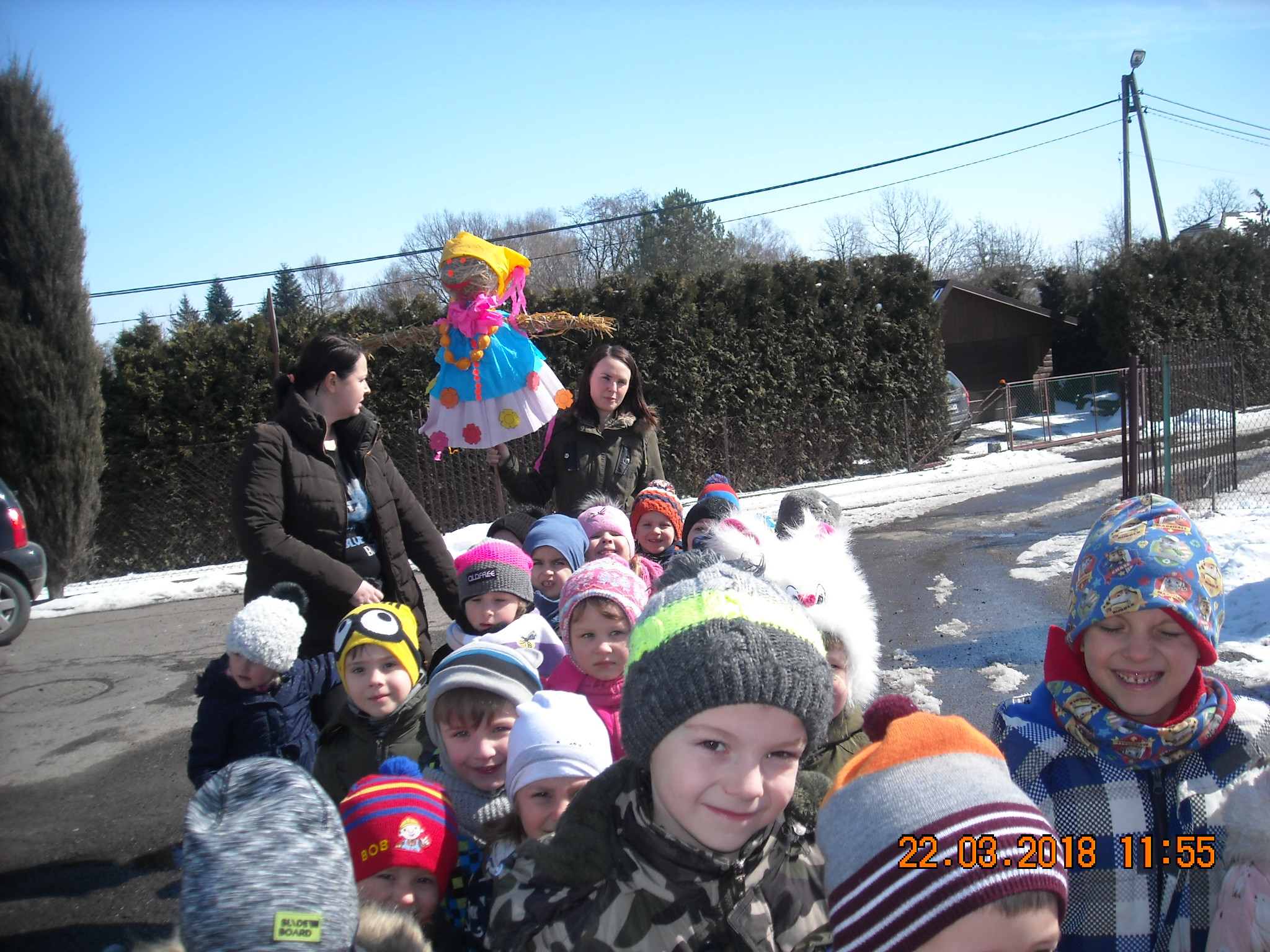 W dniu 22.03.2018 roku przedszkolaki zgodnie z tradycją postanowiły pożegnać zimę i przywitać długo oczekiwaną wiosnę. Wspólnie przygotowały z materiałów ekologicznych kukłę w kolorowym przebraniu. Po wspólnym spacerze z Marzanną dzieci otoczyły ją kołem i wierszem oraz piosenką przekonały zimę, aby odeszła i już nie wracała. Tym samym zaprosiliśmy wiosnę, by zajęła miejsce odchodzącej zimy.