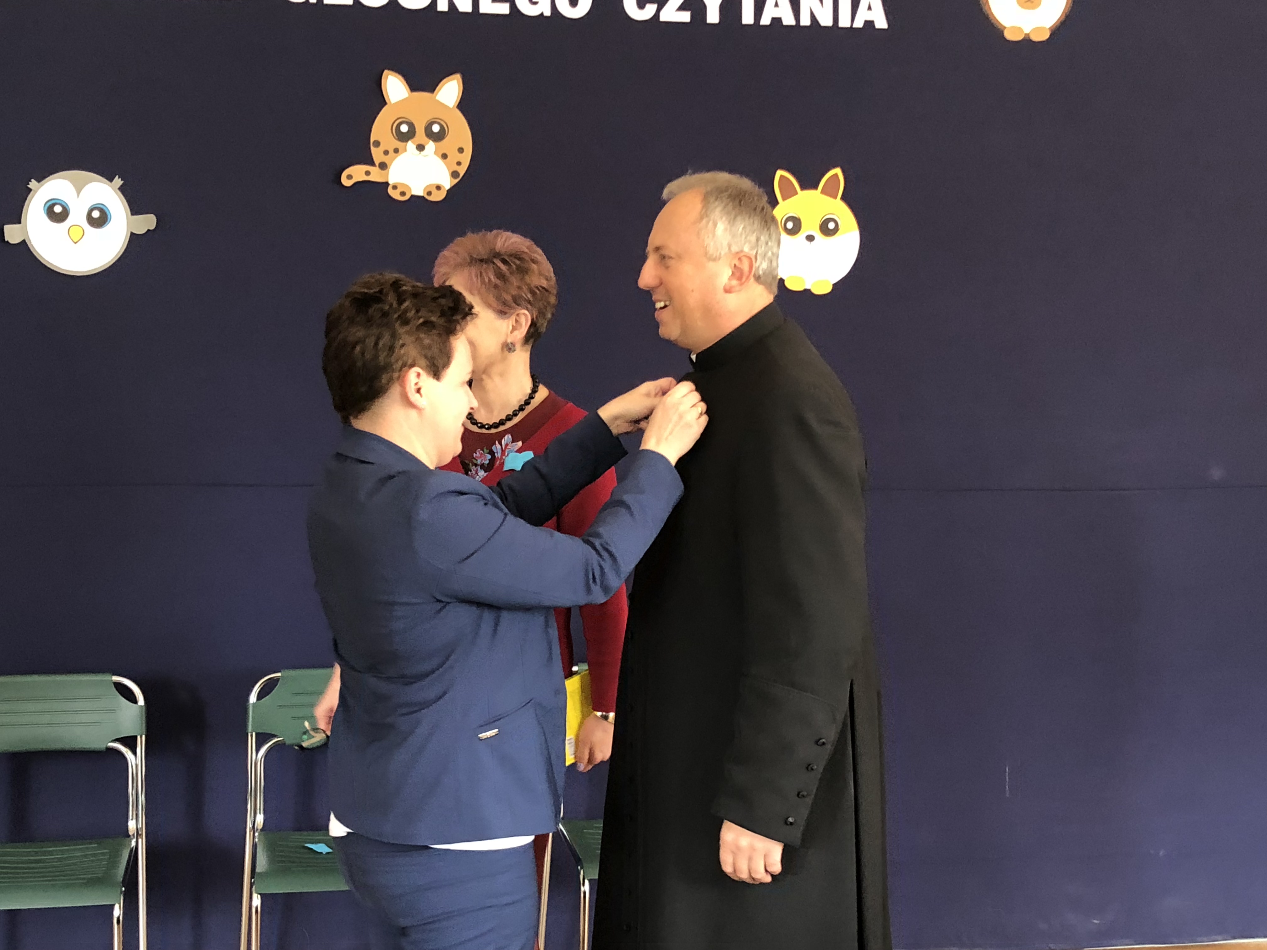 ks. Proboszcz Janusz Kurasz, Pani Dyrektor Jadwiga Szara i pani pedagog Dagmara Dżuła.