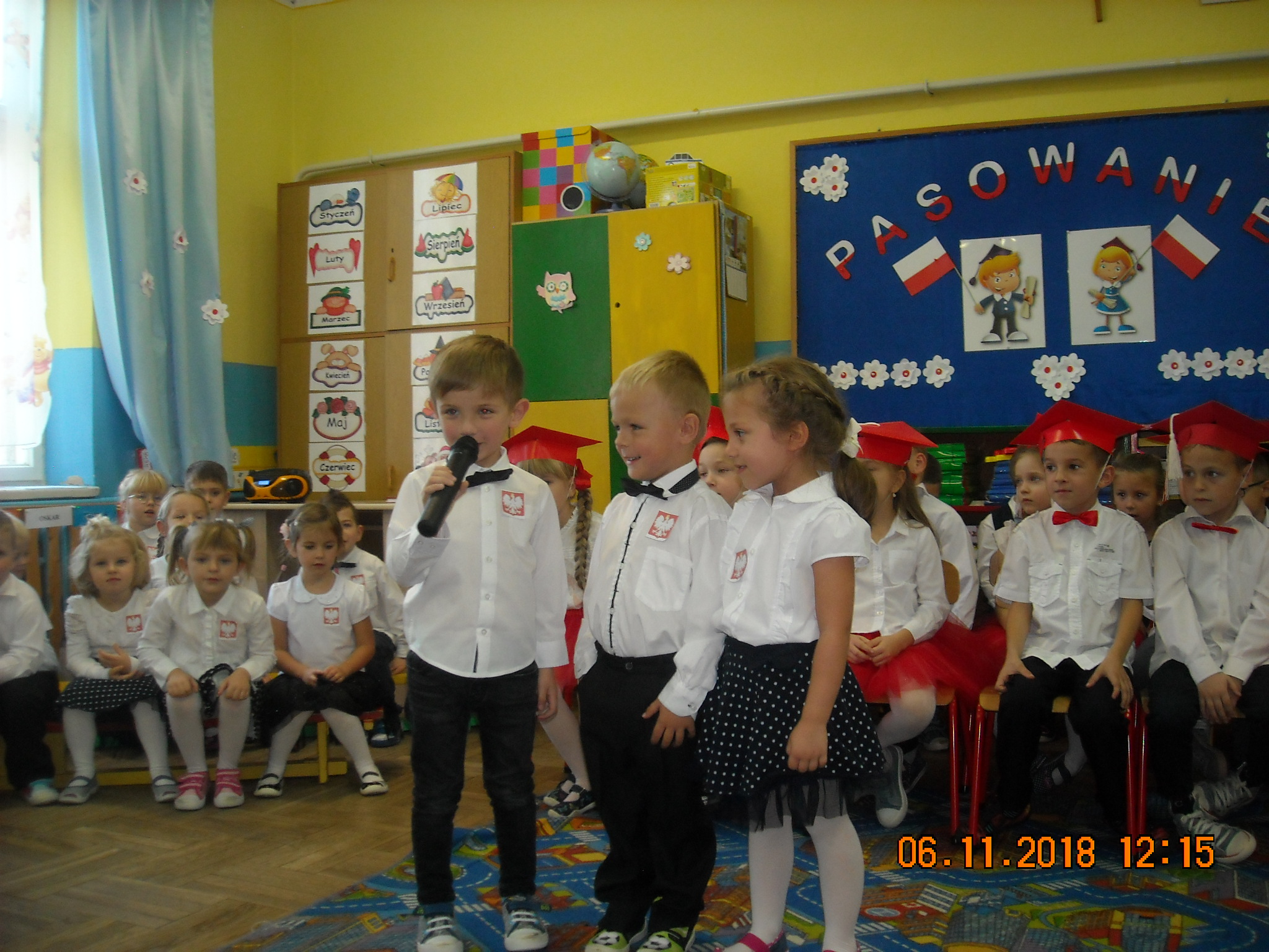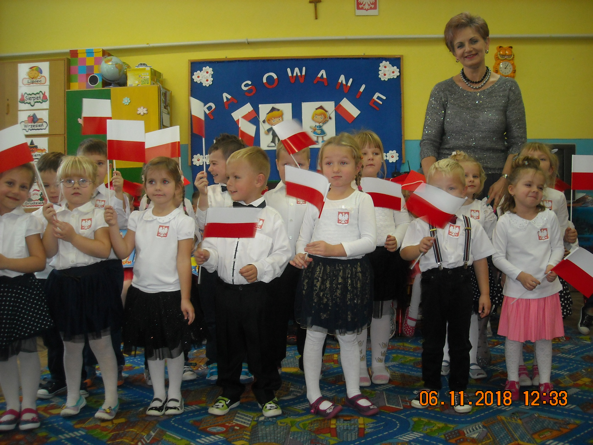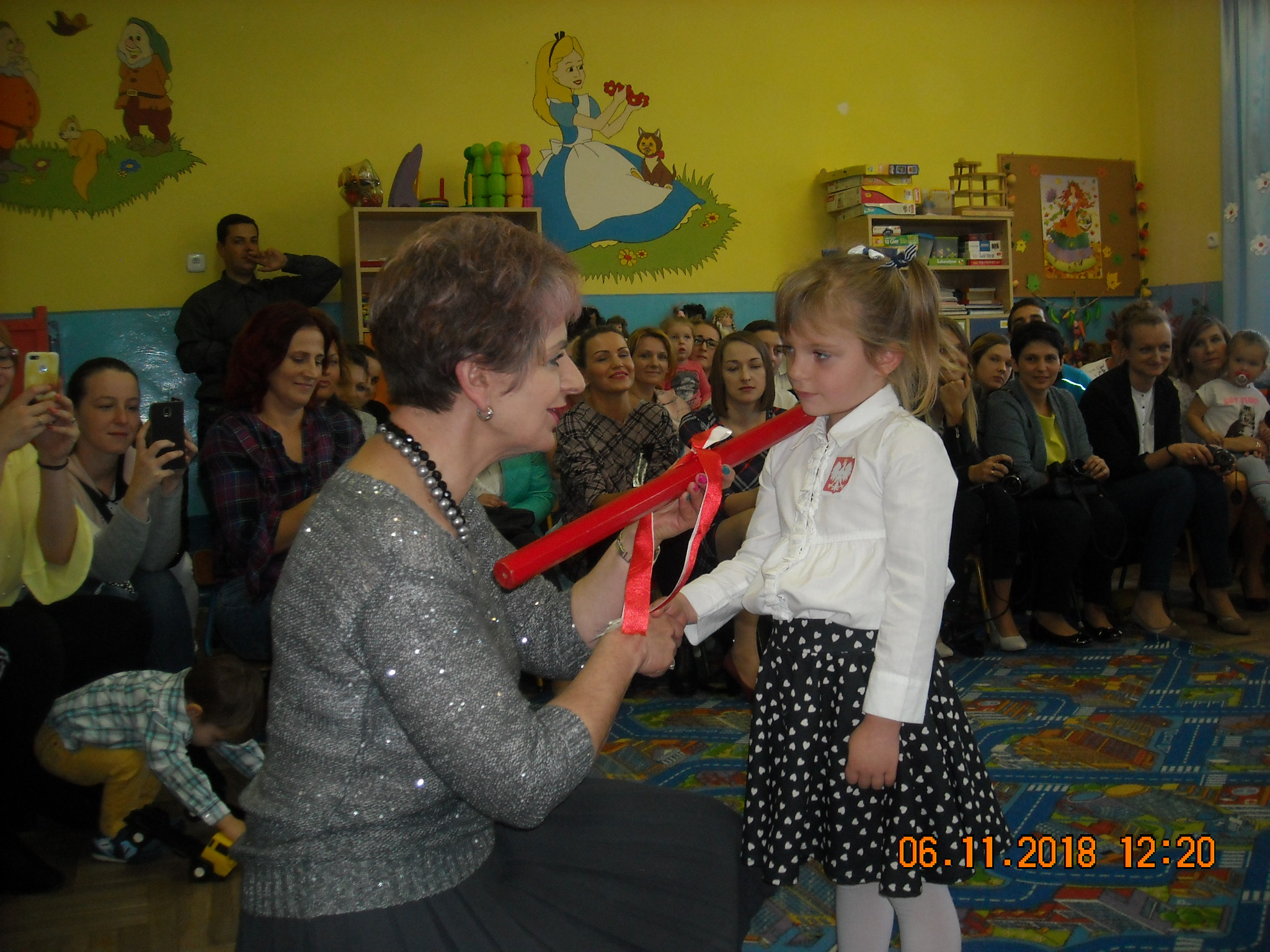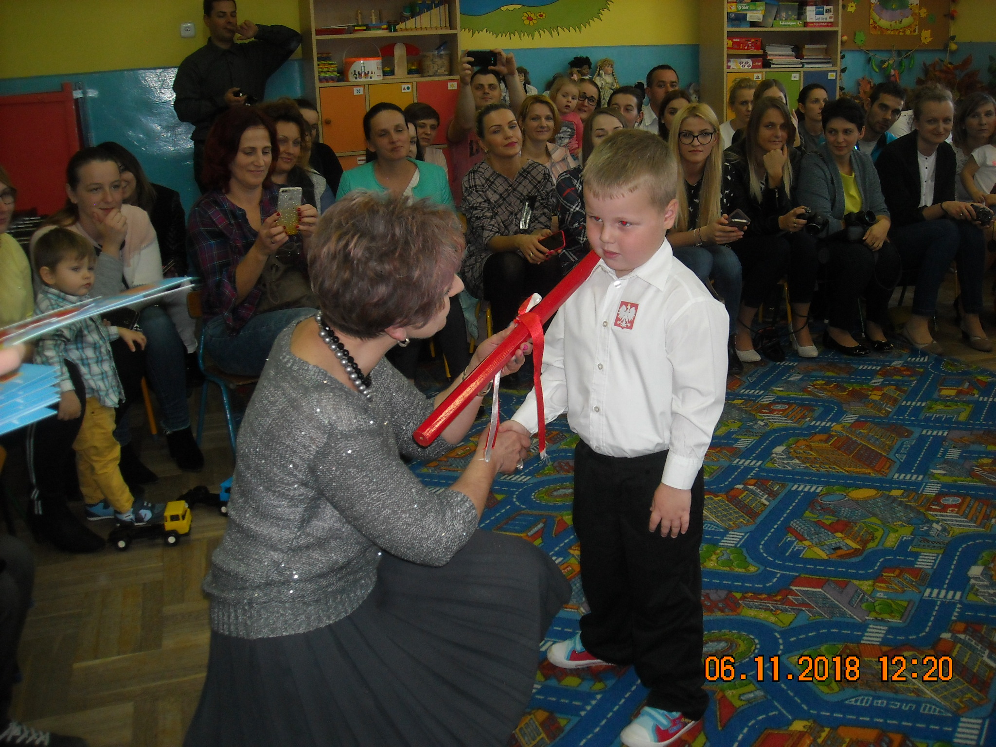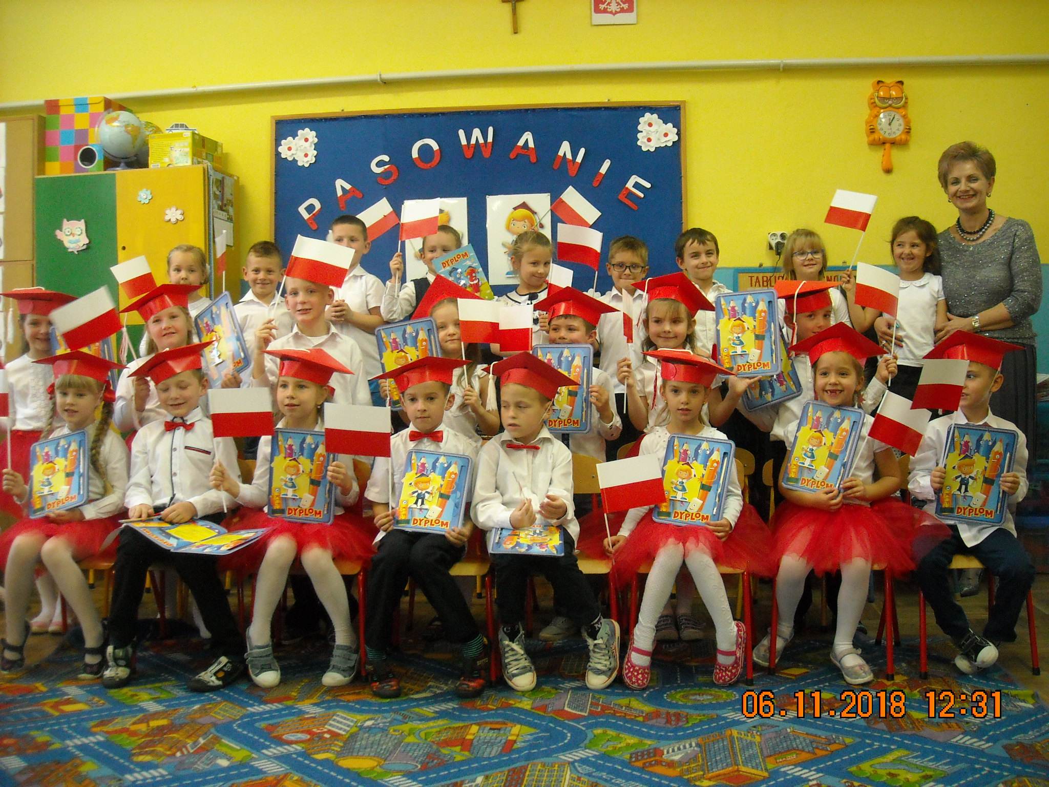 Dzień 06.11.2018 r. pozostanie na długo w pamięci dzieci z przedszkola i ich rodziców. Tego właśnie dnia odbyła się ważna przedszkolna uroczystość „Pasowanie Na Przedszkolaka i Starszaka”, którą połączono z 100- rocznicą odzyskania przez Polskę Niepodległości.