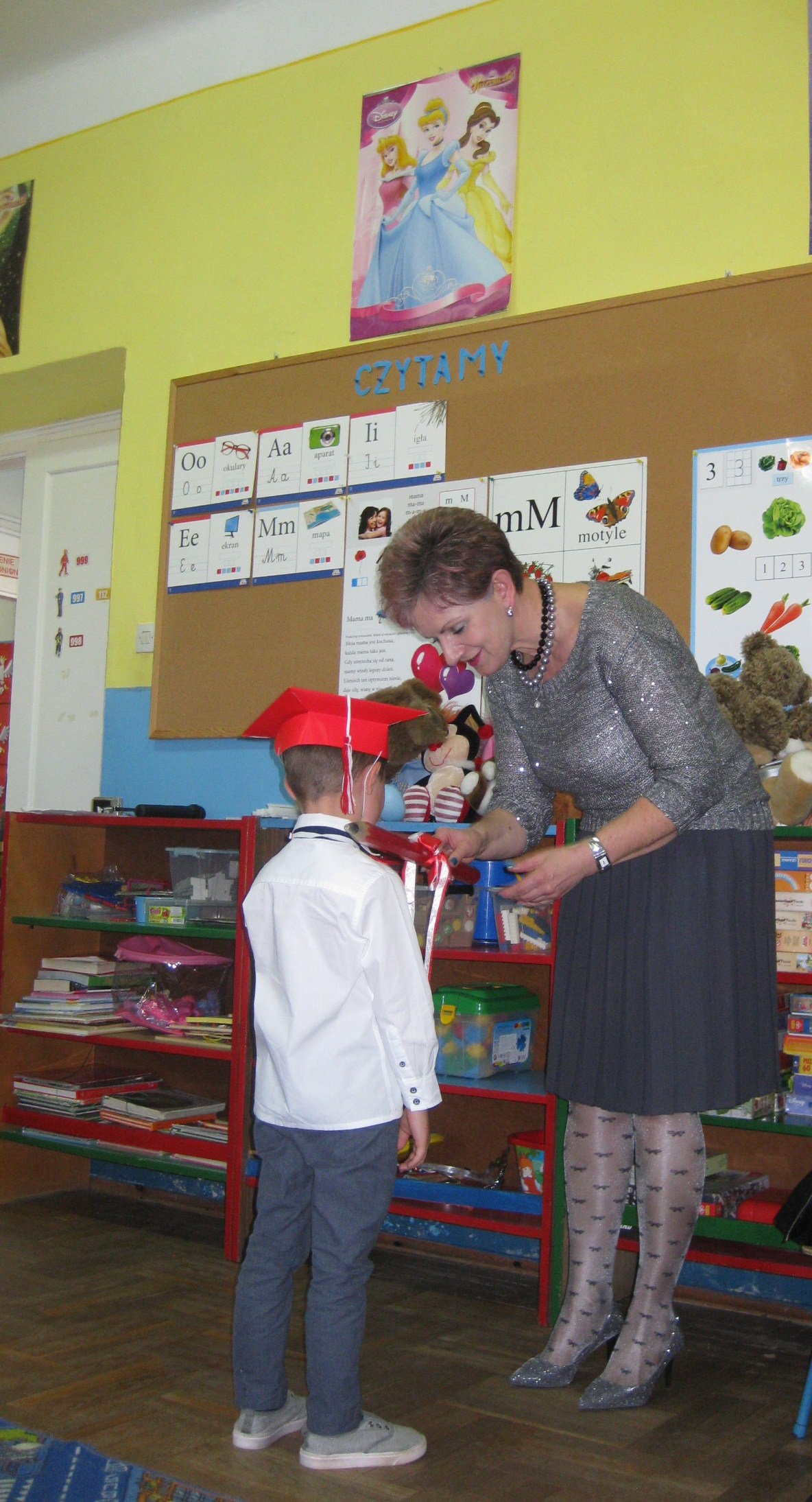Następnie pani dyrektor za pomocą „czarodziejskiego ołówka” dokonała uroczystego pasowania na przedszkolaka i starszaka.