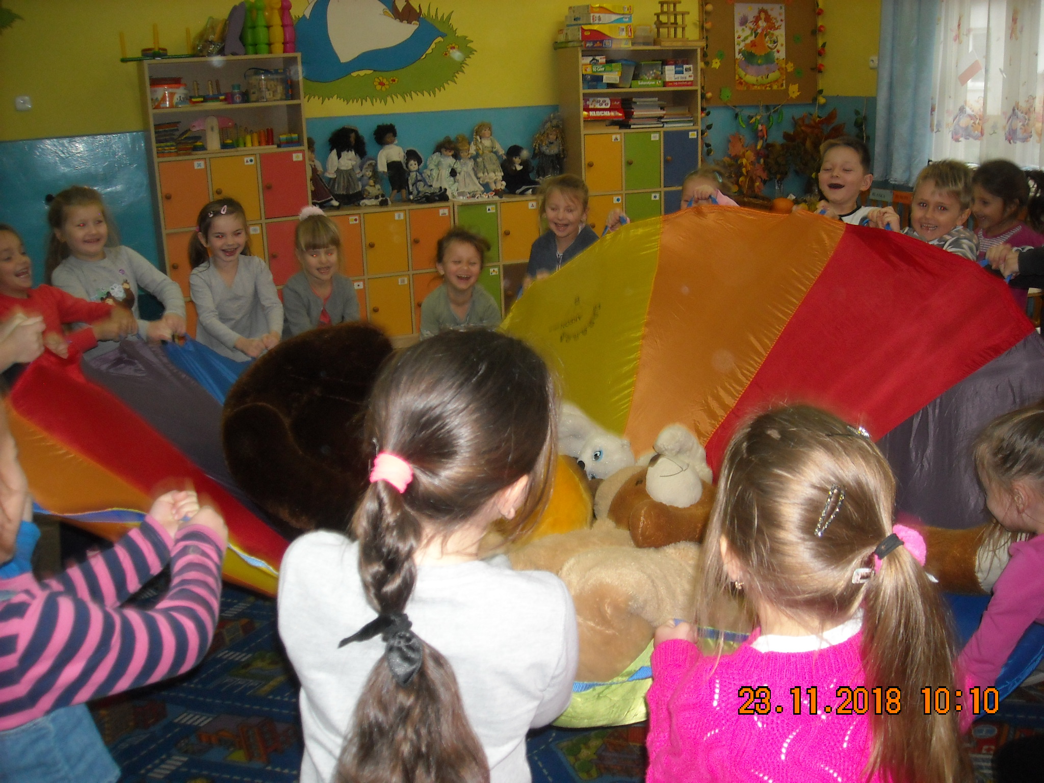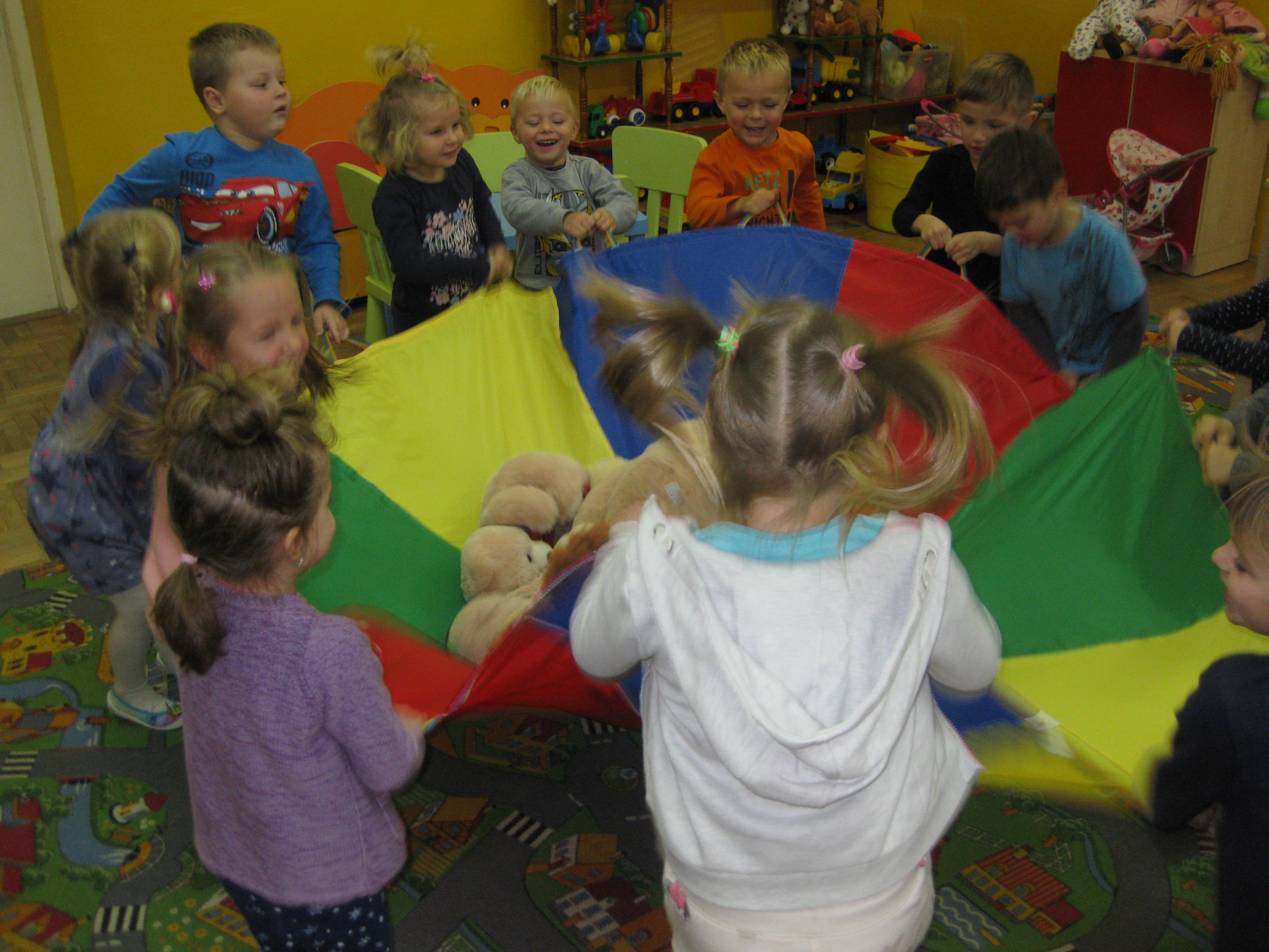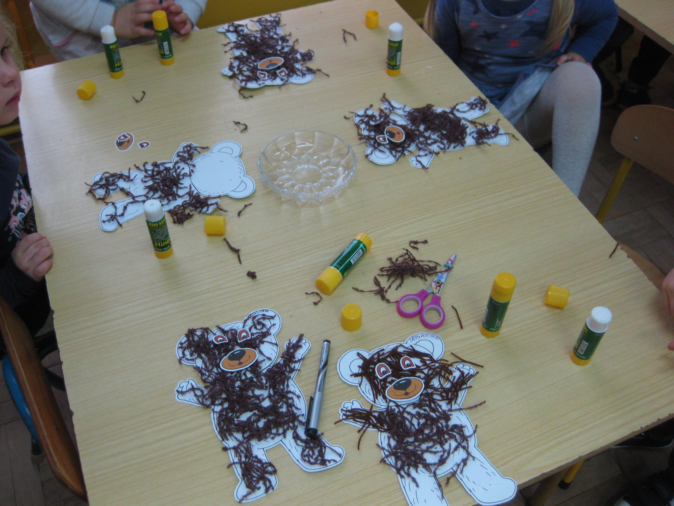 Zabawę rozpoczęliśmy od przywitania z misiami. Dzieci poznały historię pluszowego misia, zapoznały się z trybem życia i wyglądem niedźwiedzia, słuchały wierszy i opowiadań o misiach. Atrakcją było wyklejanie misiów włóczką, robienie misiów z papierowych torebek, uczestnictwo w zabawach ruchowych z wykorzystaniem chusty animacyjnej.