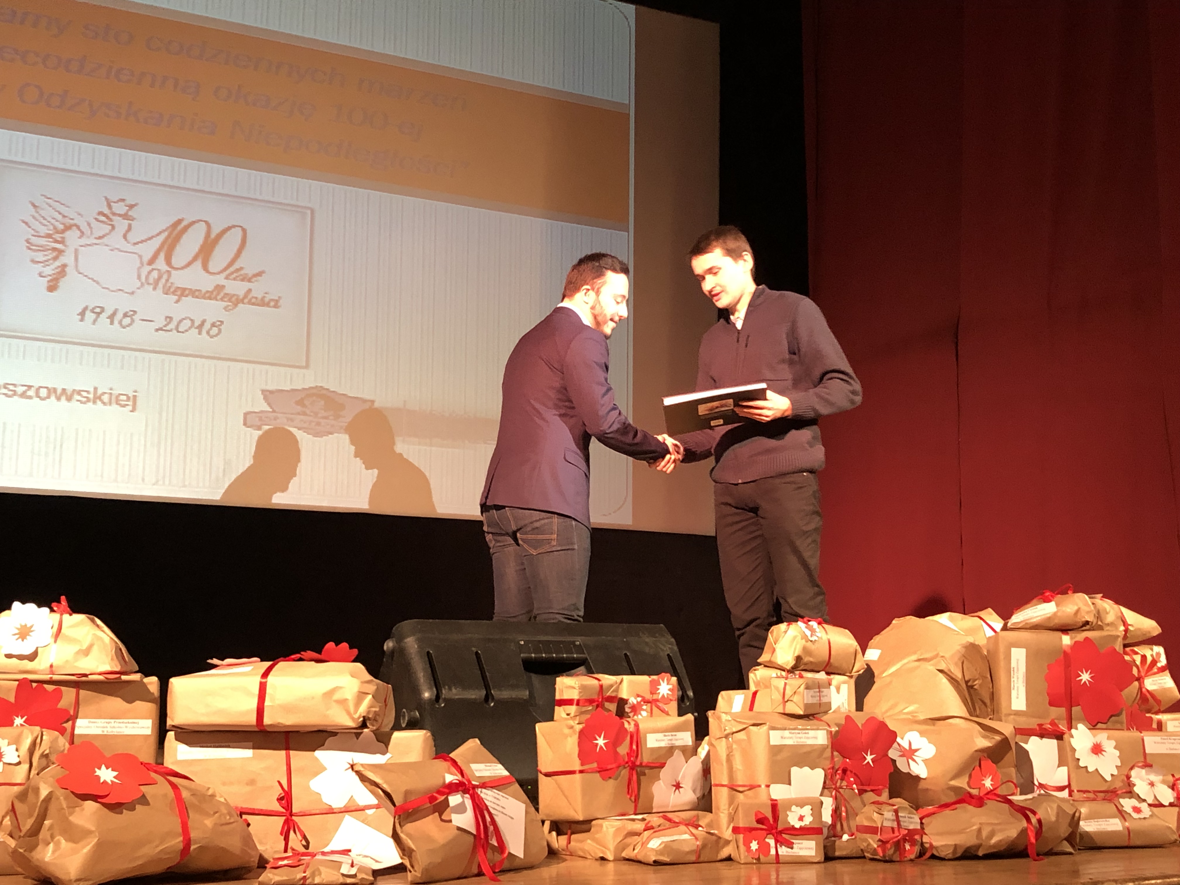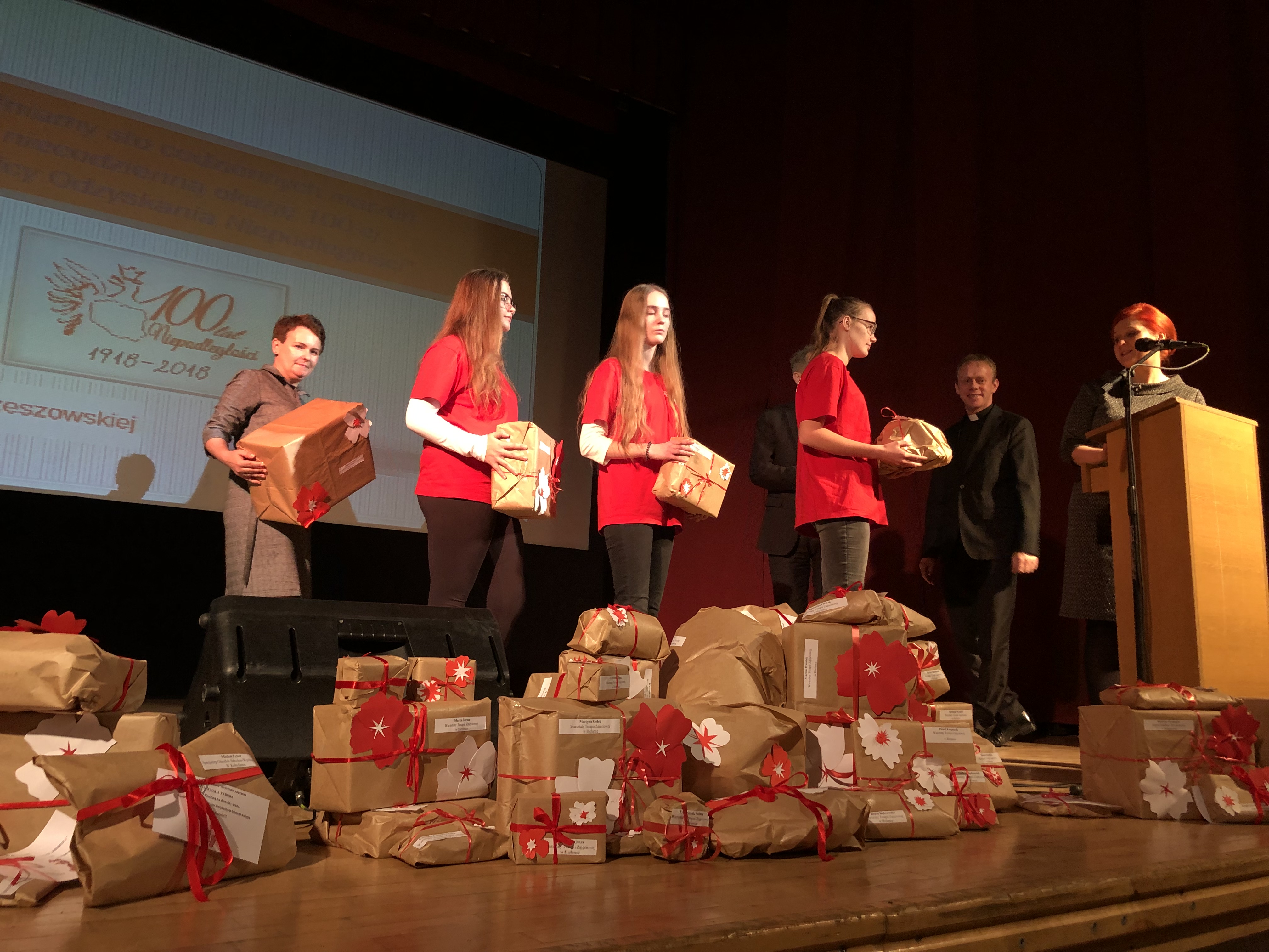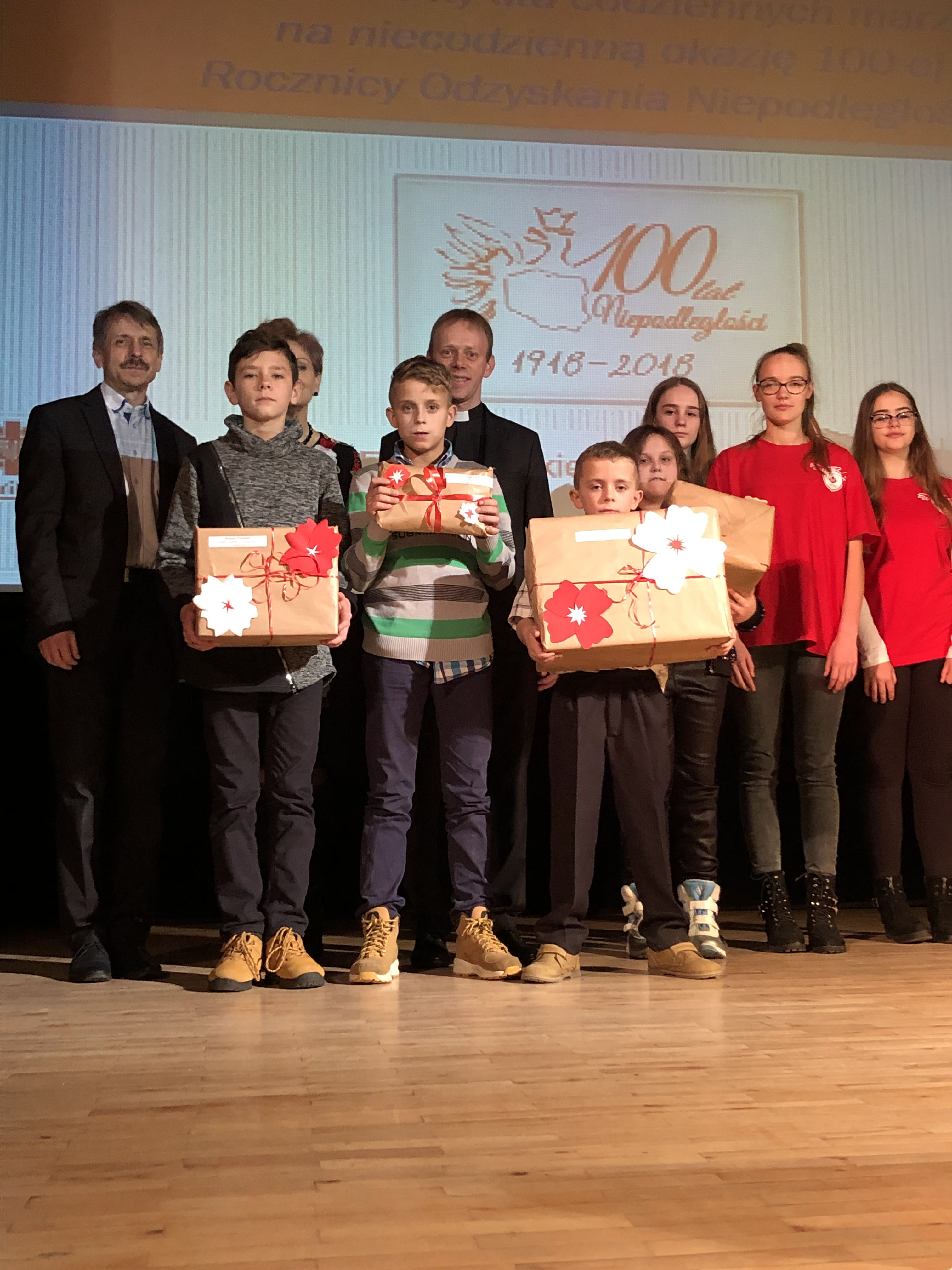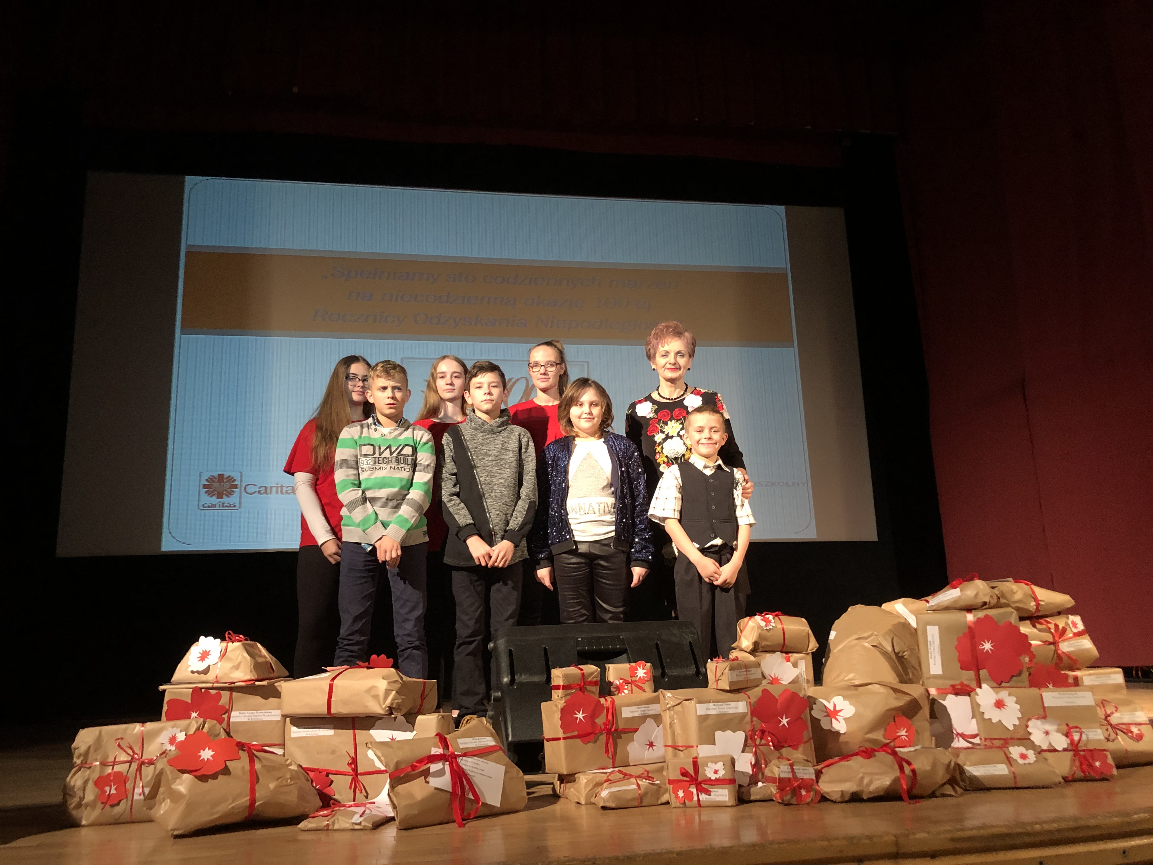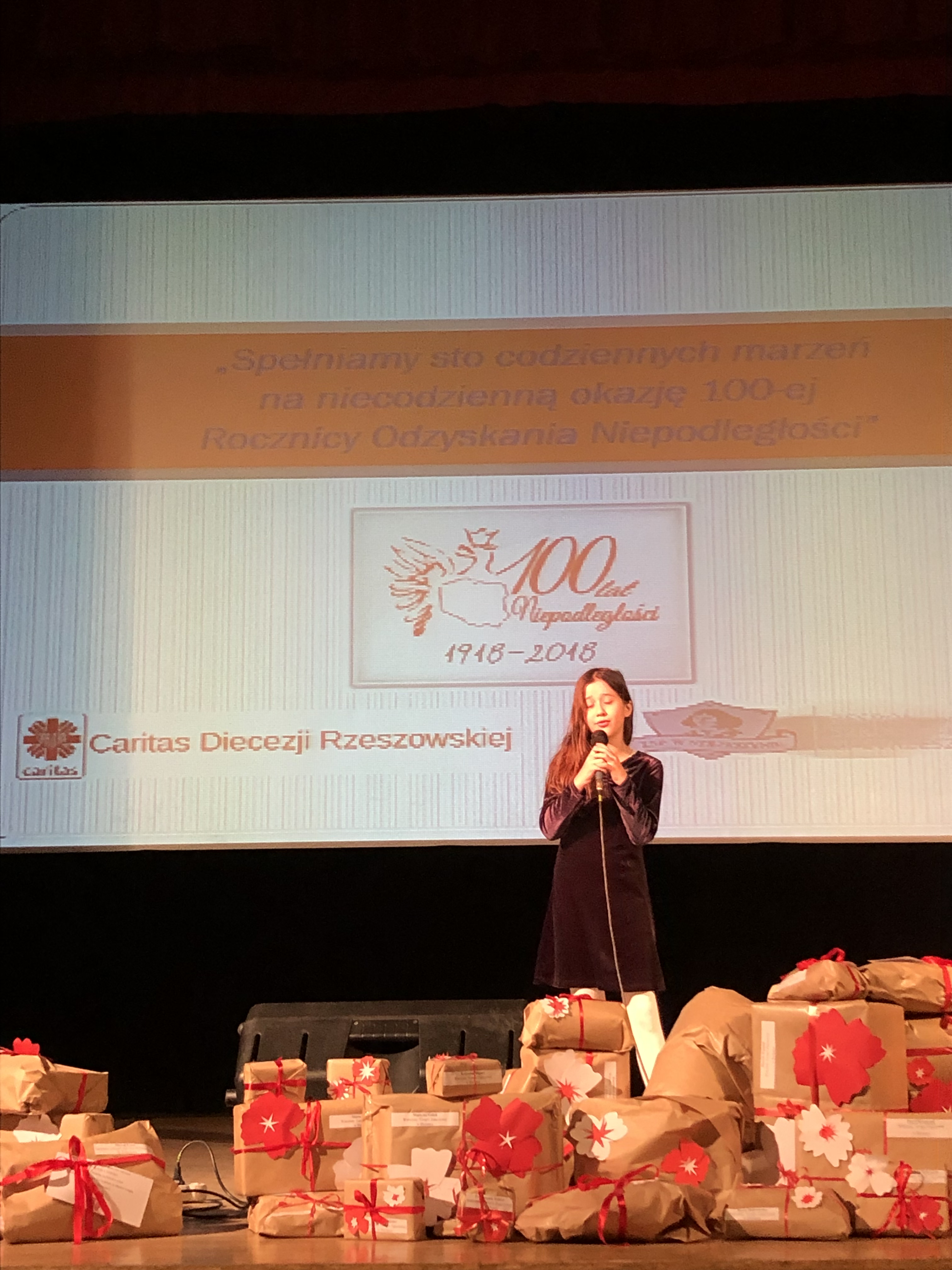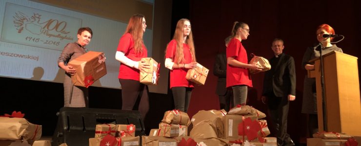 Prowadzącą galę była Pani Dyrektor Zespołu Szkolno- Przedszkolnego w Strzeszynie, Jadwiga Szara, która wielokrotnie podkreślała, że akcja nie udałaby się, gdyby nie ogromna szczodrość sponsorów i darczyńców, gdyż ich serca otwarte na potrzeby innych sprawiły, że mogliśmy, w tak piękny sposób, uczcić setną rocznicę odzyskania przez Polskę niepodległości.