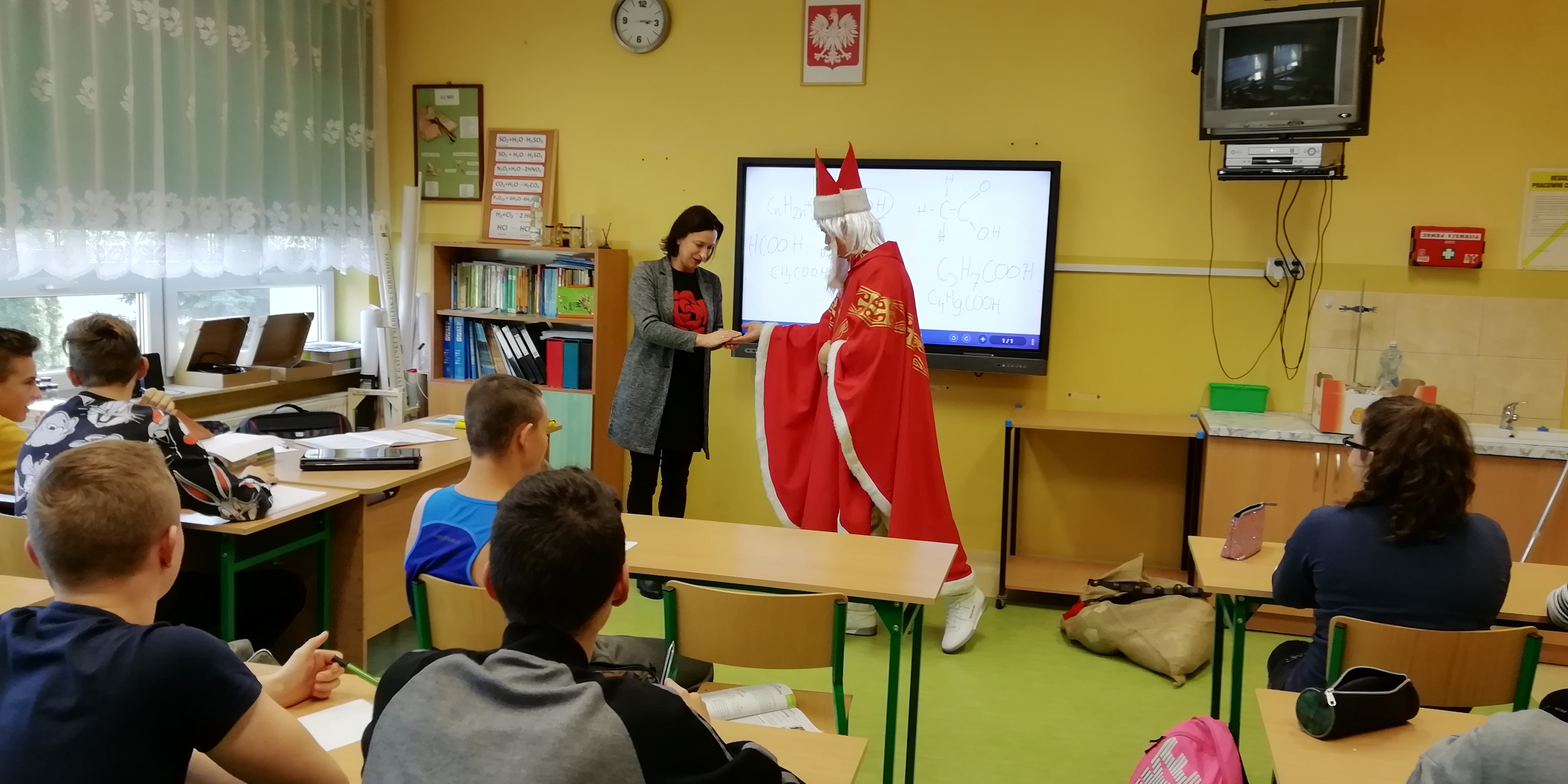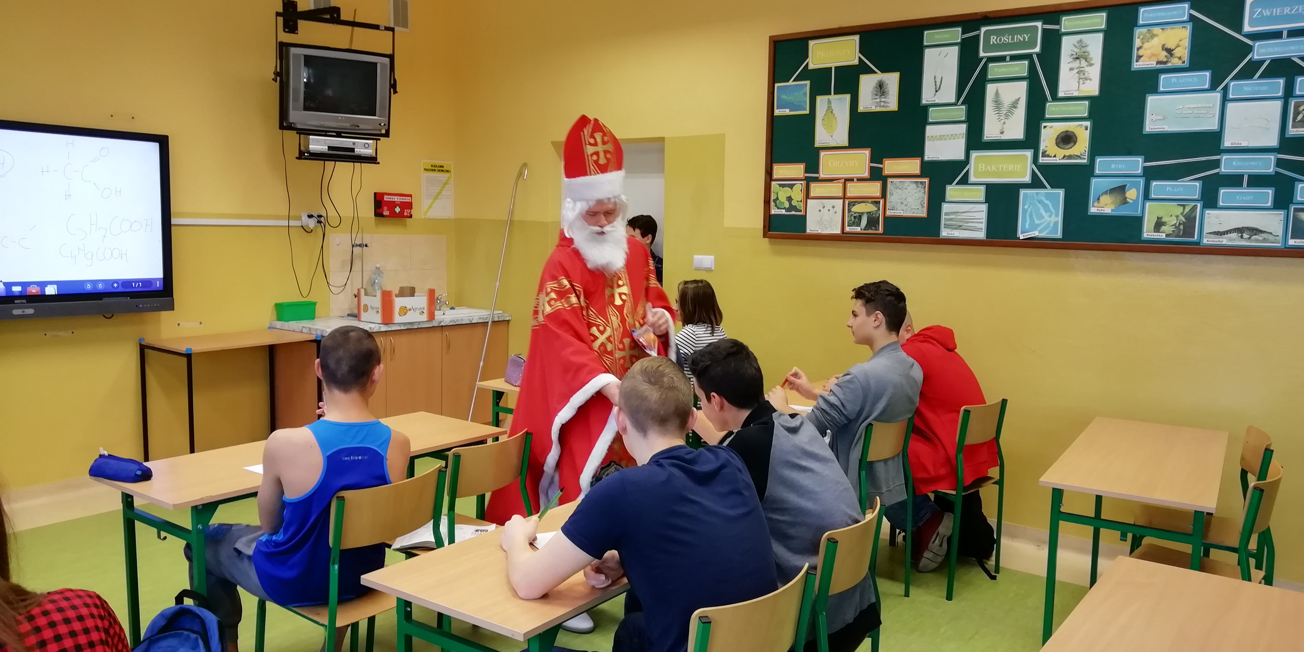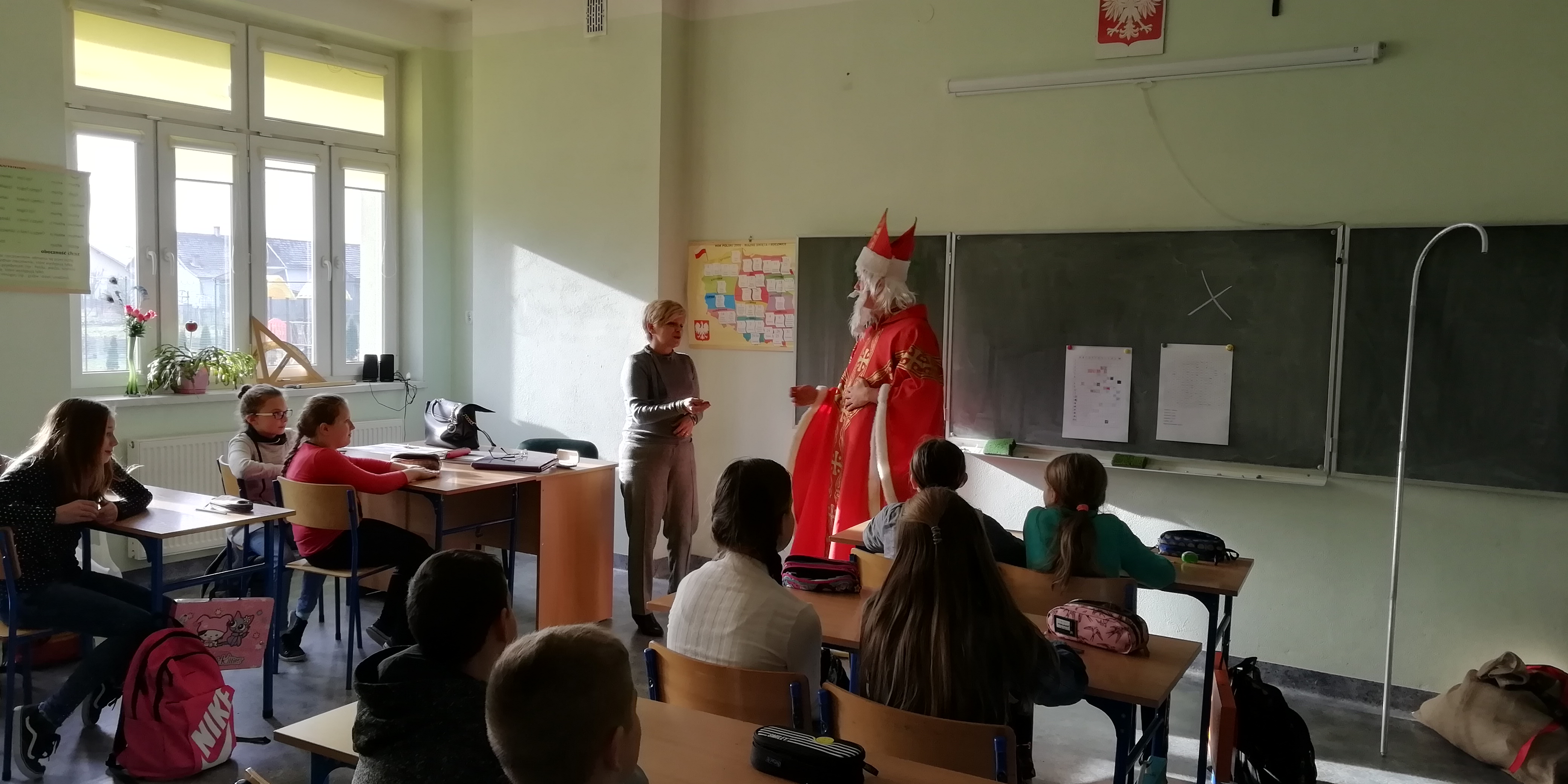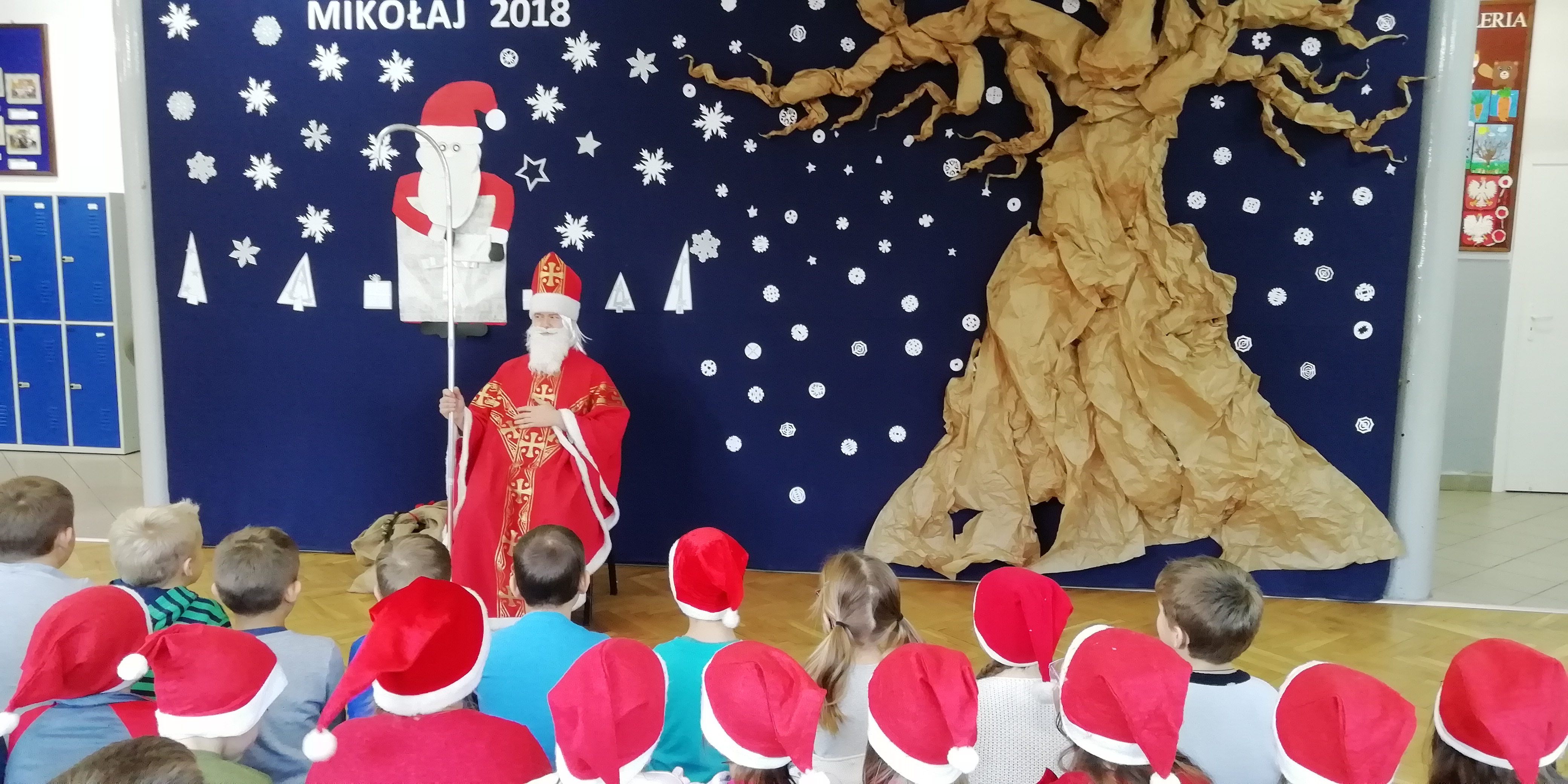 6 grudnia 2018r. do naszej szkoły zawitał Święty Mikołaj i sprawił, że dzień był wyjątkowy i pełen radości. Jego wizyty z niecierpliwością oczekiwali nie tylko najmłodsi uczniowie, ale także Ci troszkę starsi. Niezwykłego Gościa przywitali uczniowie klas I-III, śpiewając piosenki i recytując wiersze. Podczas wręczania prezentów Święty Mikołaj rozmawiał z dziećmi, pytał czy były grzeczne i zachęcał do czynienia dobra. Była też okazja do pamiątkowych zdjęć. Następnie Niecodzienny Gość odwiedził starszych uczniów, którym również wręczył słodkie upominki. Spotkanie ze Świętym Mikołajem zapewne na długo pozostanie w pamięci dzieci. Mikołaj obiecał, że odwiedzi naszą szkołę w przyszłym roku – o ile wszyscy będą grzeczni!