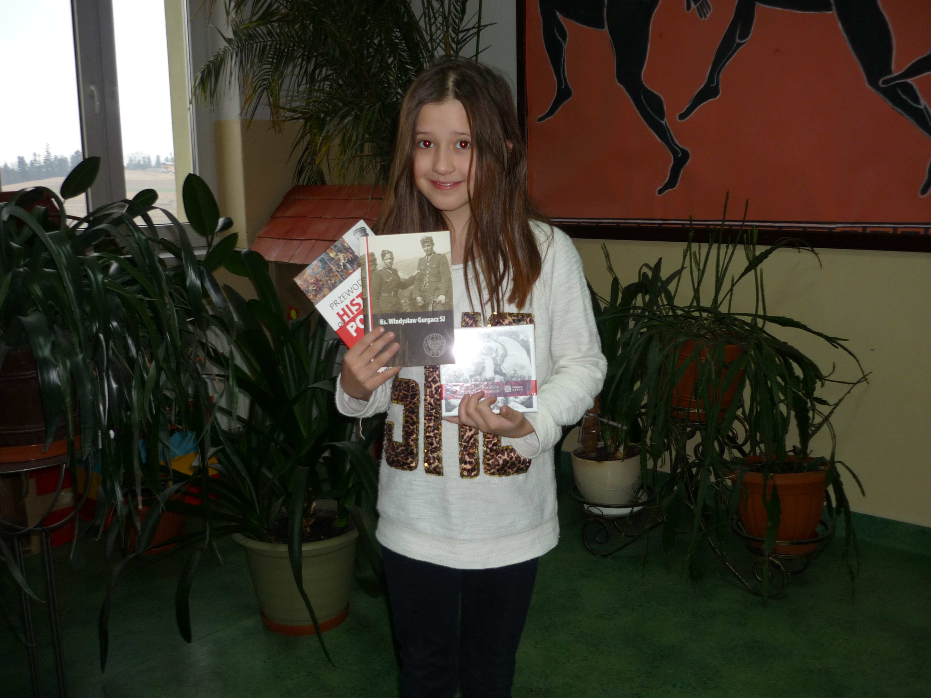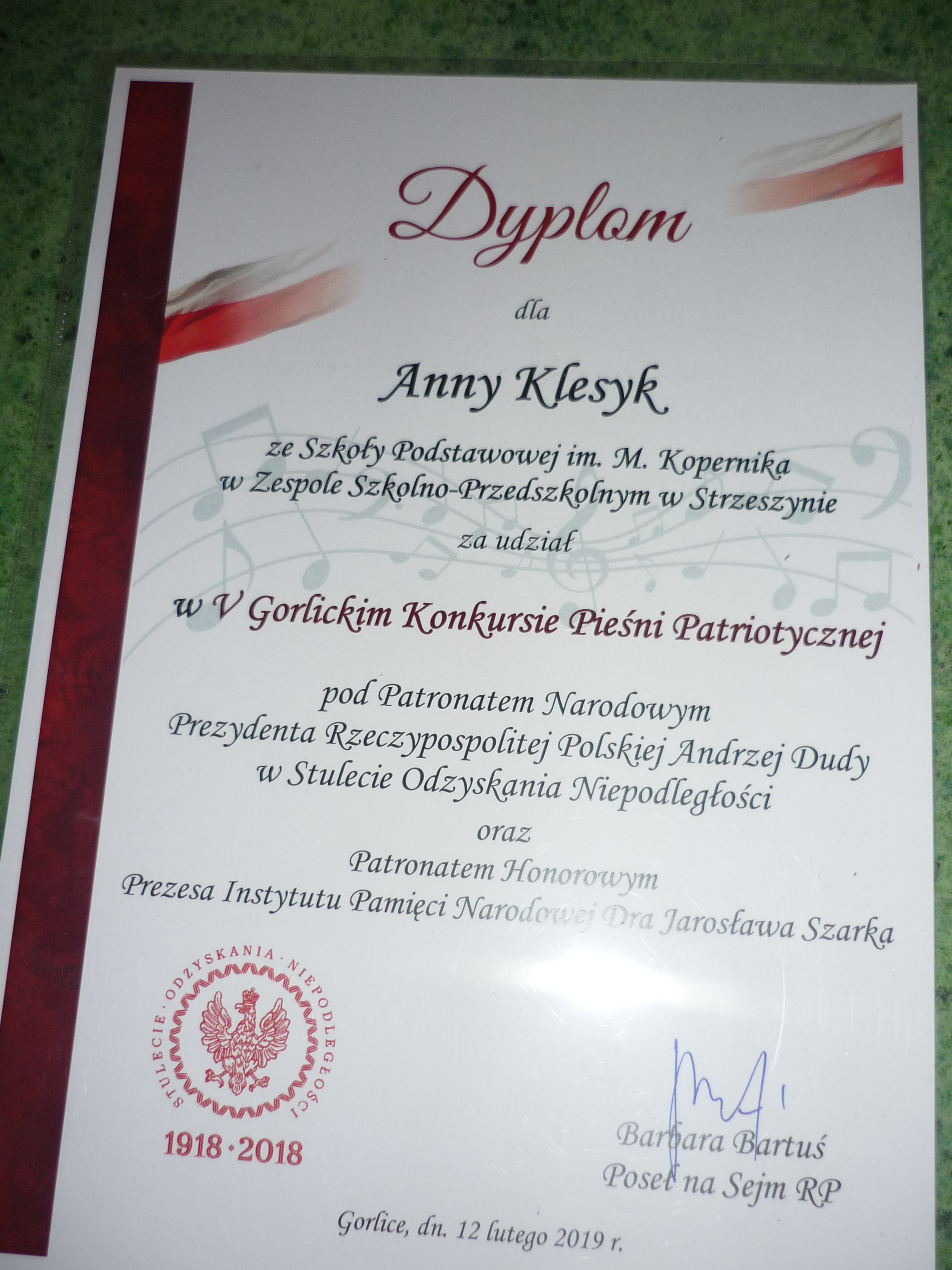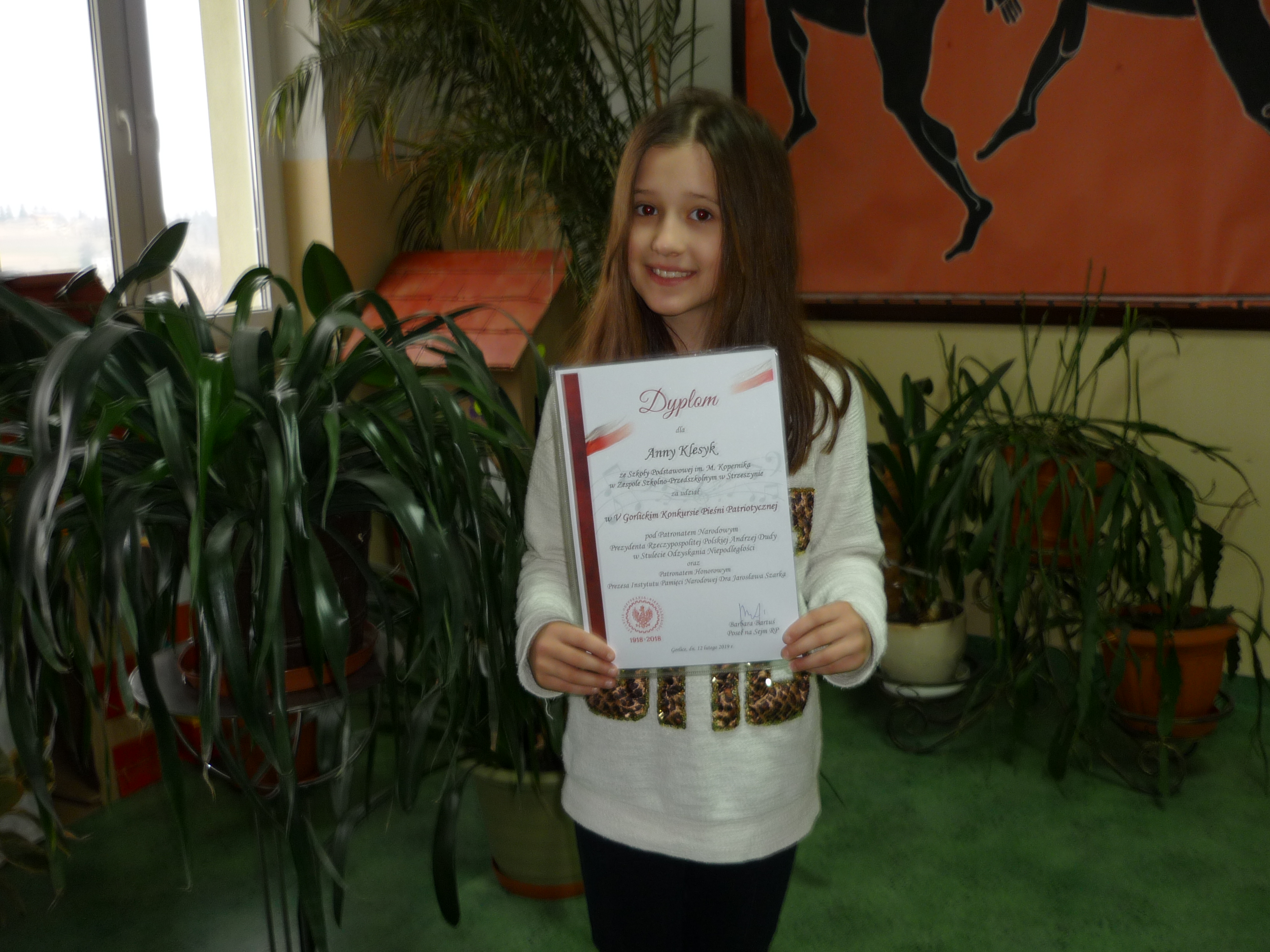 Za swój konkursowy występ Ania otrzymała /dla siebie oraz dla opiekuna i szkoły/ od Poseł na Sejm RP pani Barbary Bartuś, pamiątkowe dyplomy i upominki, pochodzące z Kancelarii Sejmu RP, z Instytutu Pamięci Narodowej oraz od Zarządu Polskiego Radia.
