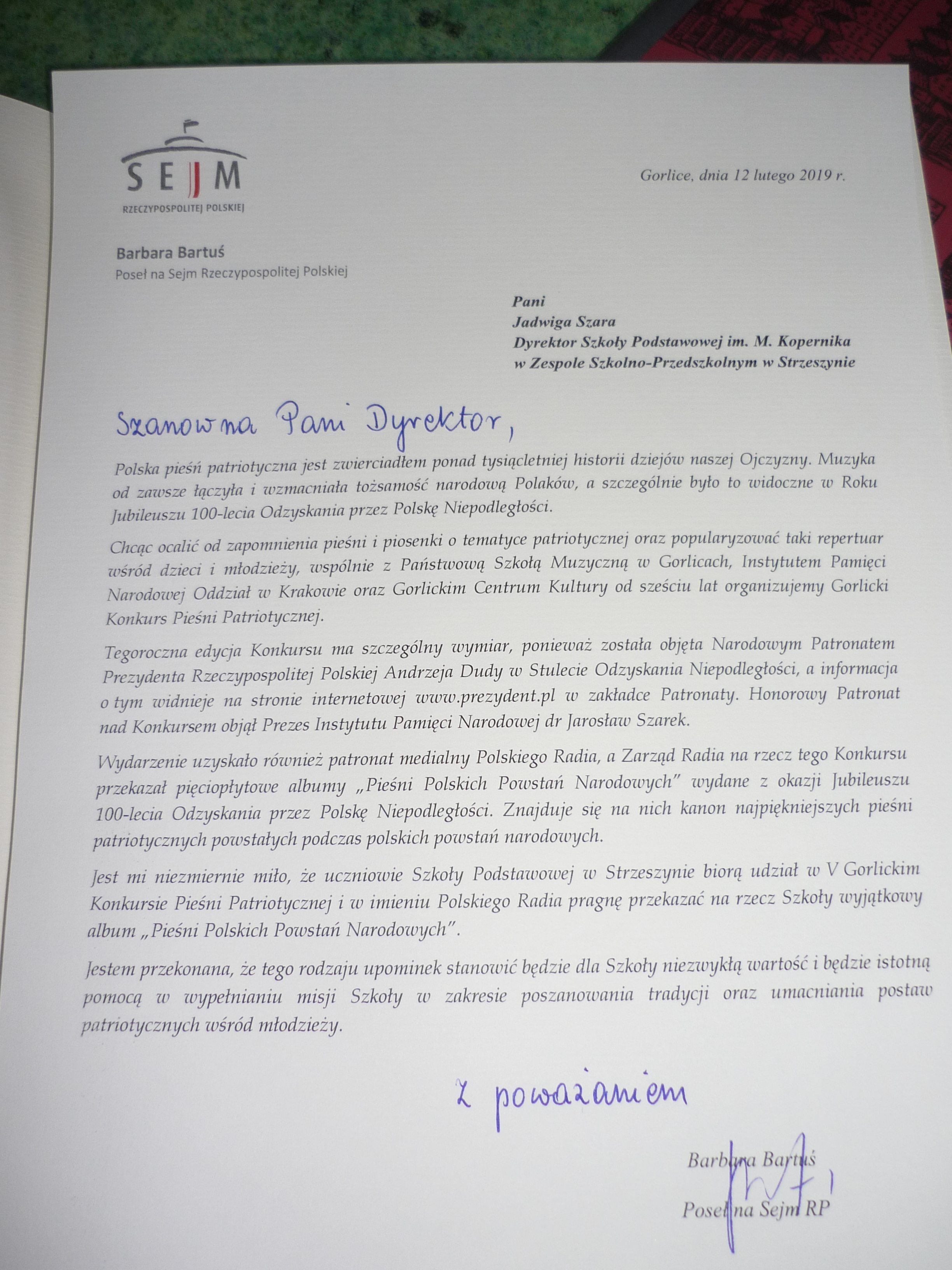 W dniach 11 i 12 lutego 2019 r. w Zespole Państwowych Szkół Muzycznych w Gorlicach odbył się V Gorlicki Konkurs Pieśni Patriotycznej. Organizatorami konkursu byli: Poseł na Sejm RP Barbara Bartuś, Gorlickie Centrum Kultury, Zespół Państwowych Szkół Muzycznych w Gorlicach, przy współpracy krakowskiego Oddziału Instytutu Pamięci Narodowej oraz Tomasza Płatka- Przewodniczącego Klubu Radnych PiS w Radzie Powiatu Gorlickiego i Stowarzyszenia „Nasze Miasto” w Gorlicach.