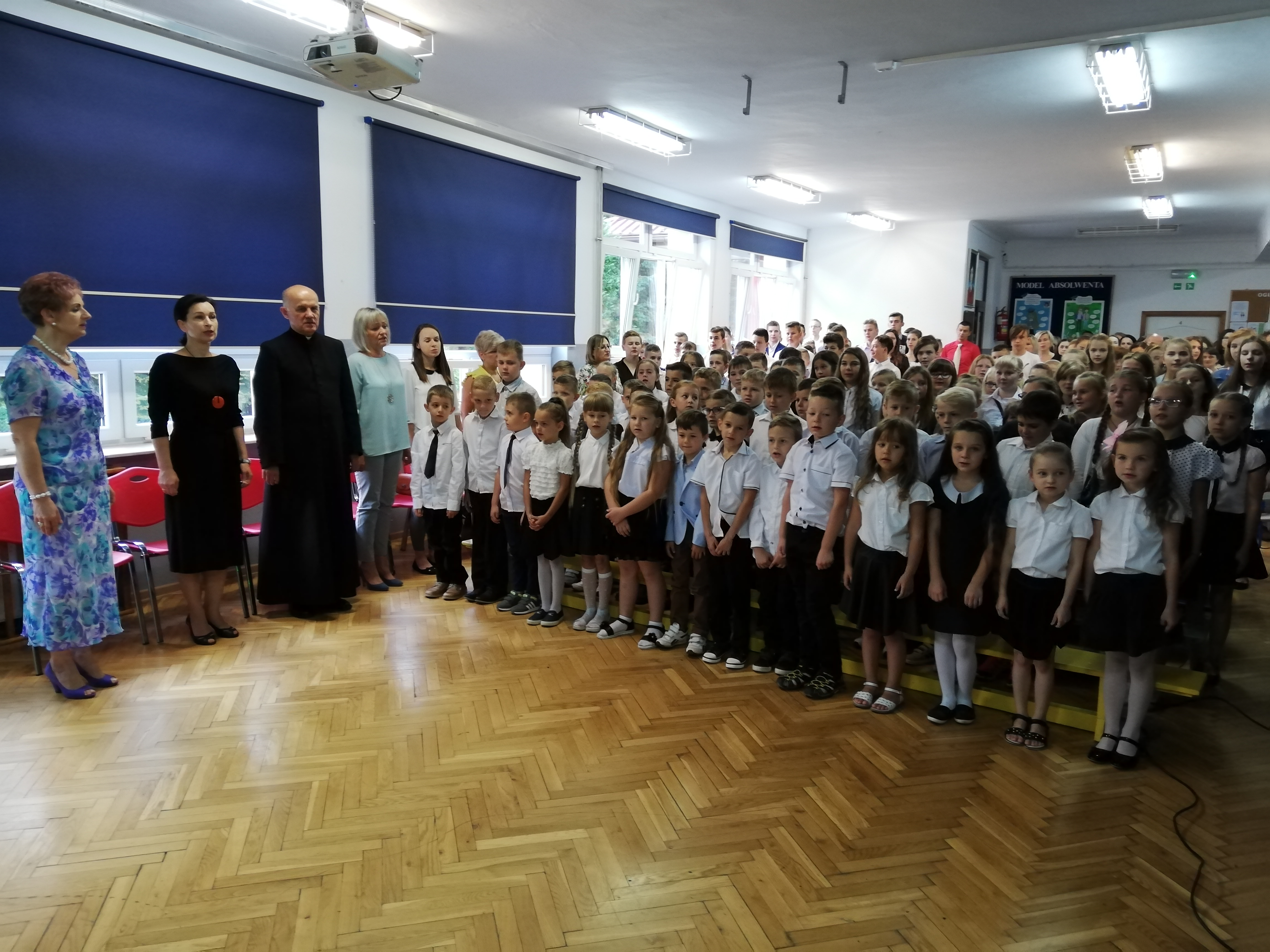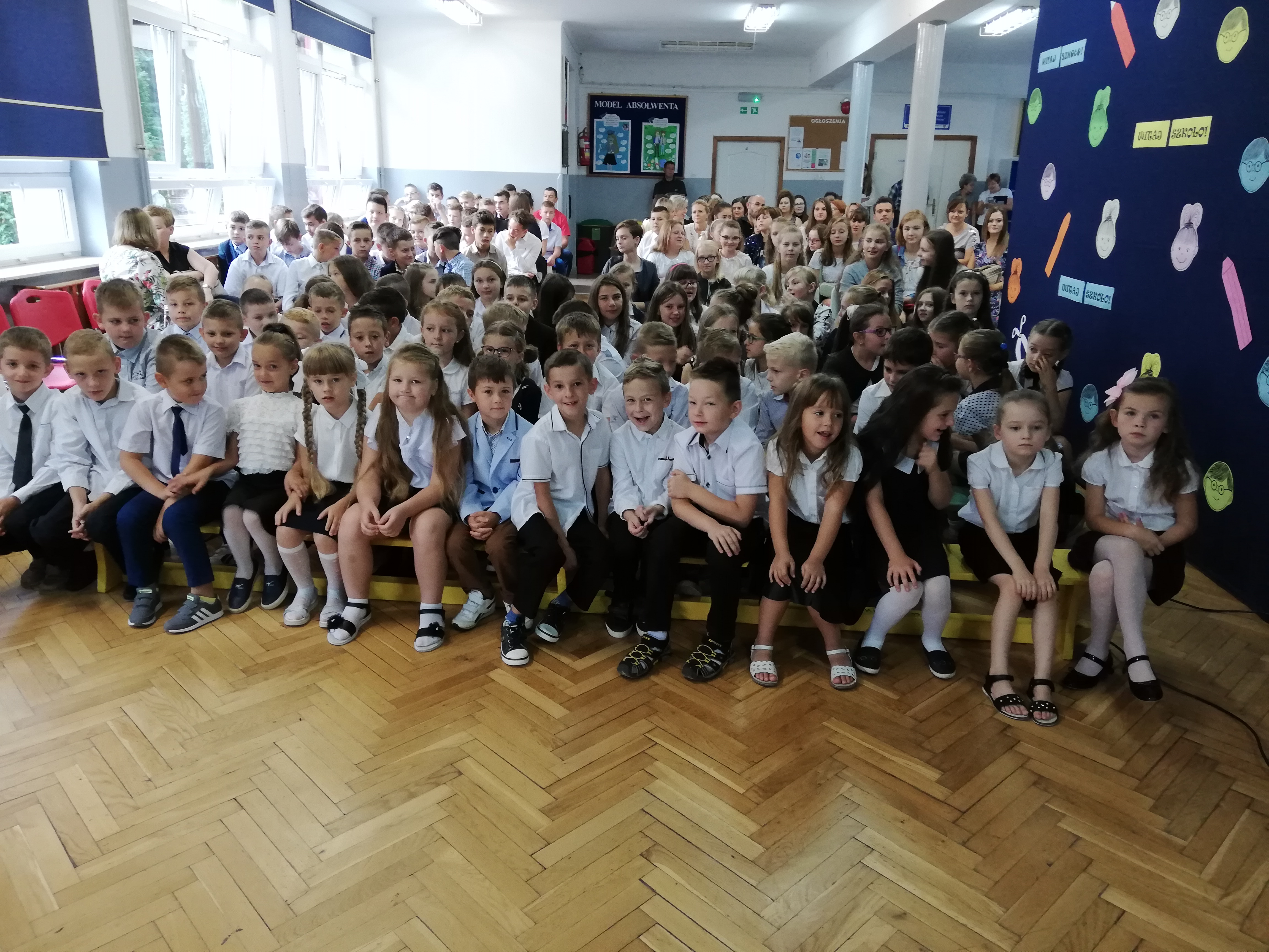W poniedziałek 2 września uczniowie naszej szkoły uroczyście przywitali nowy rok szkolny 2019/2020. Po wprowadzeniu sztandaru szkoły i odśpiewaniu hymnu narodowego, głos zabrała pani dyrektor Jadwiga Szara, która serdecznie powitała wszystkich uczniów, grono pedagogiczne, pracowników oraz rodziców, życząc im sukcesów w pracy i nauce. Następnie poinformowała o zmianach organizacyjnych związanych z rozbudową szkoły, przedstawiła wychowawców klas i nauczycieli.