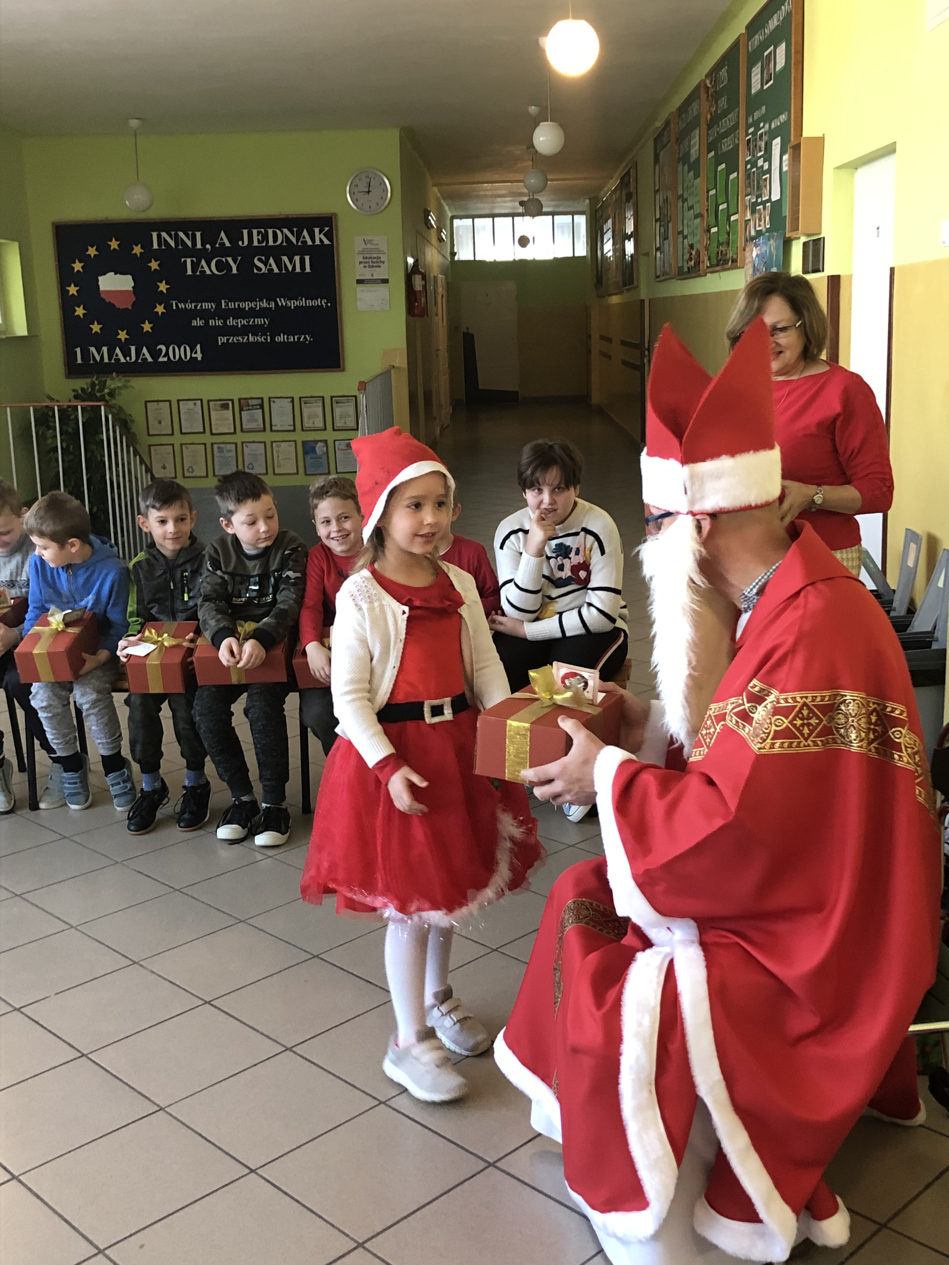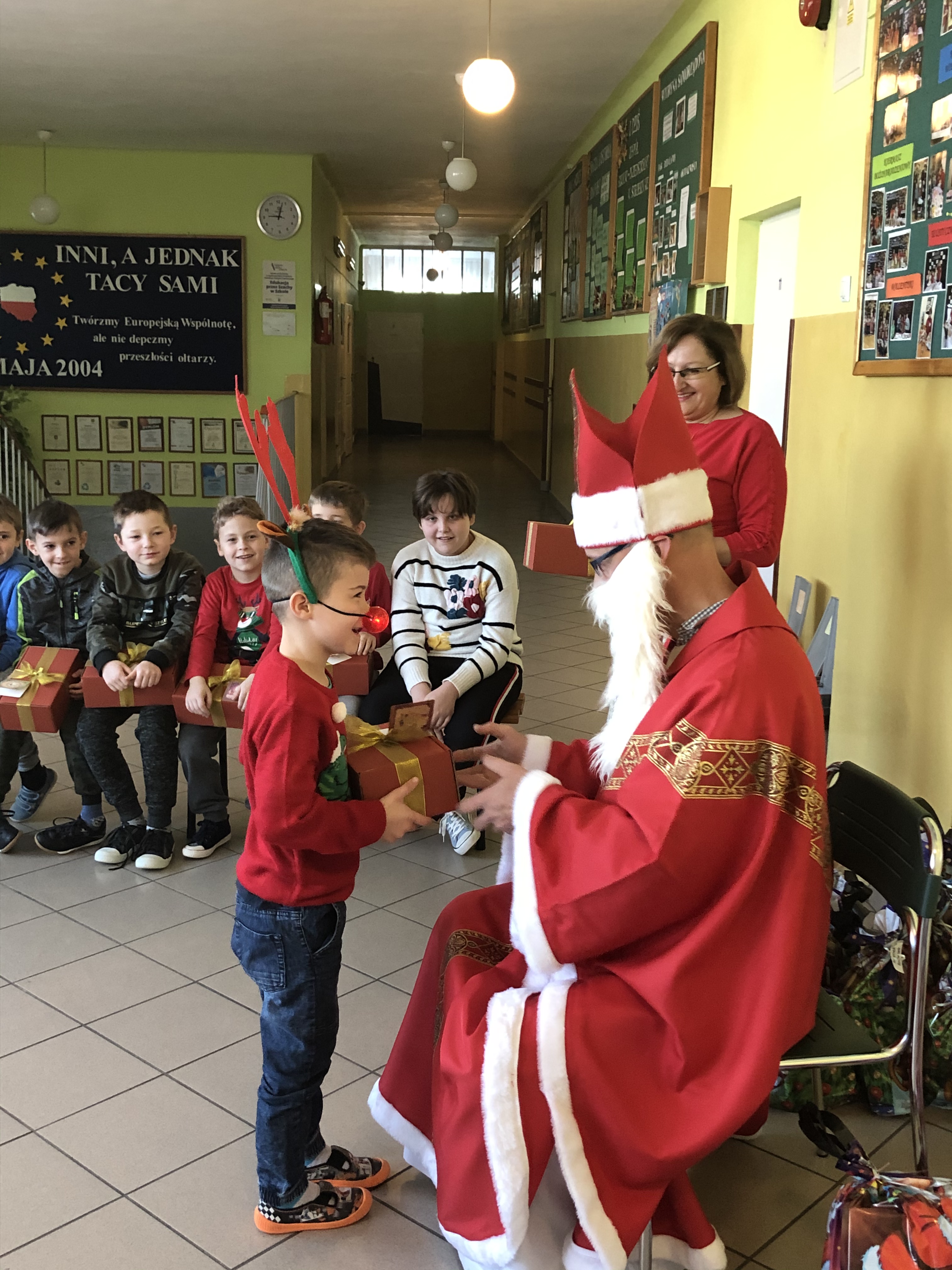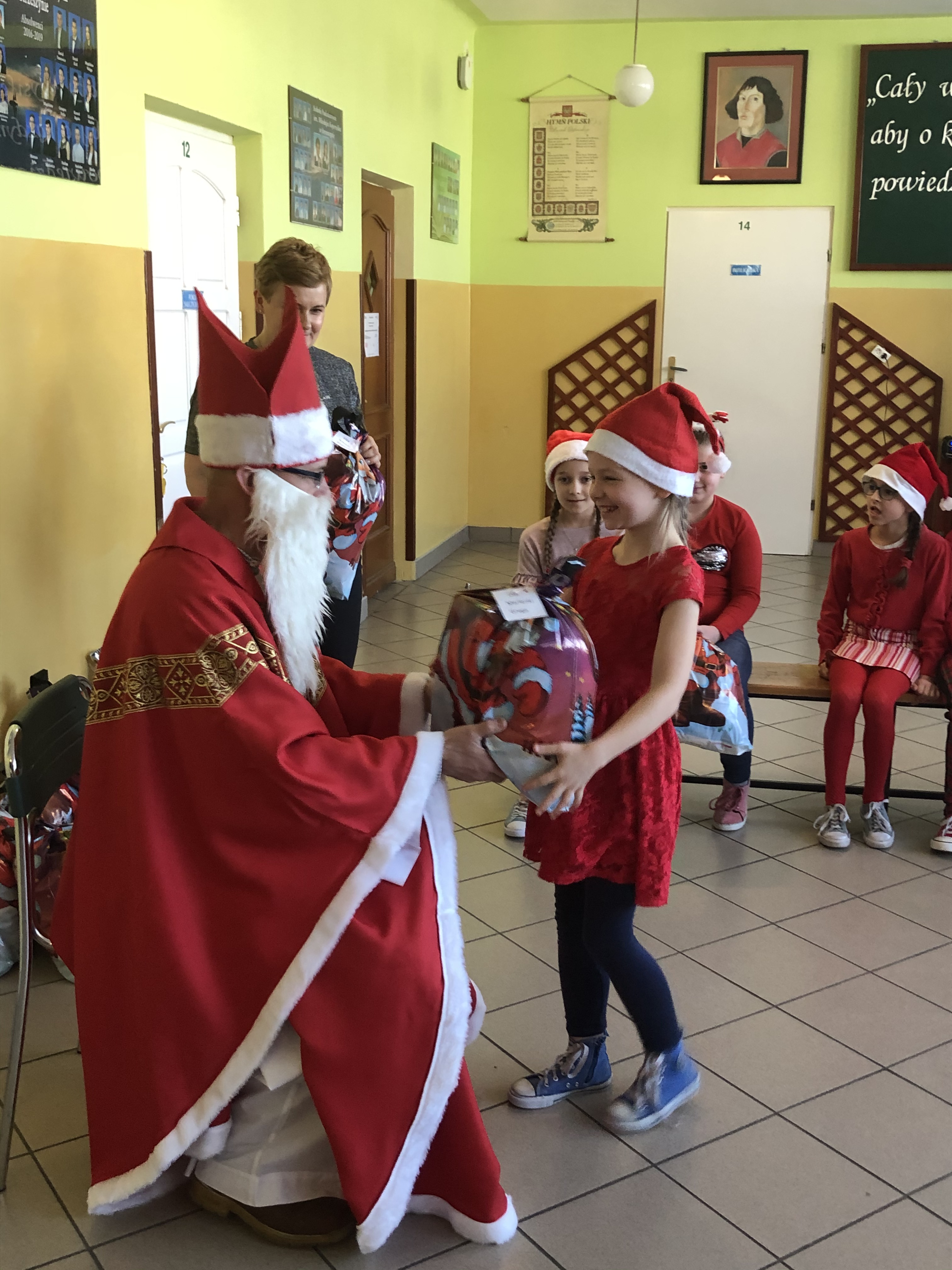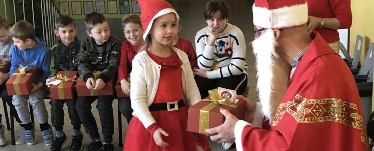 Św. Mikołaj, przywiózł ze sobą dla wszystkich piękne prezenty. Podczas ich wręczania, gość rozmawiał z dziećmi, zachęcał ich, aby były grzeczne i słuchały swoich rodziców oraz pań w szkole. Za piękne prezenty, dzieciaki odwdzięczyły się okrzykami radości, wspólną piosenką o Mikołaju, wierszem i kolorowymi rysunkami z podobizną naszego gościa.
