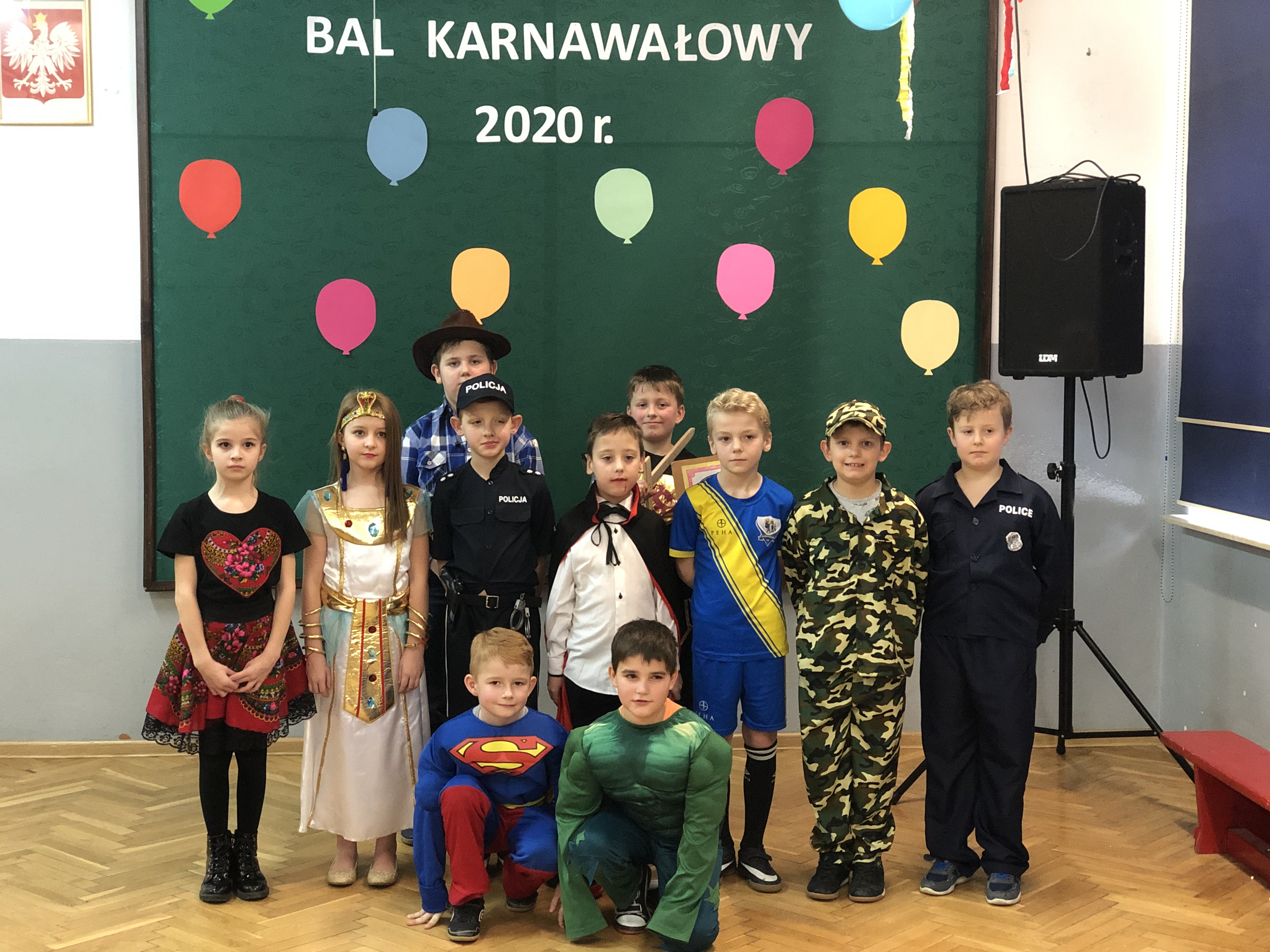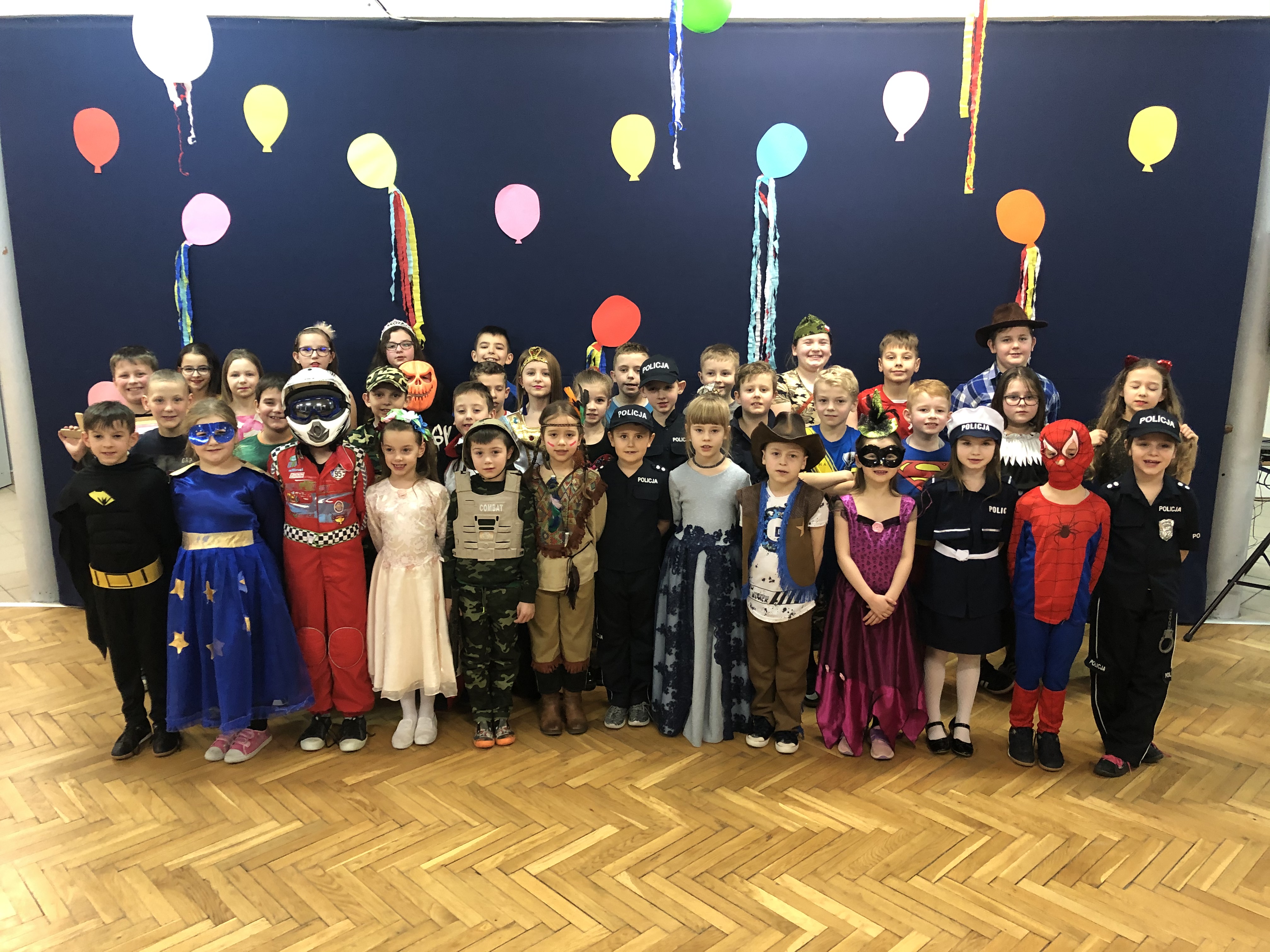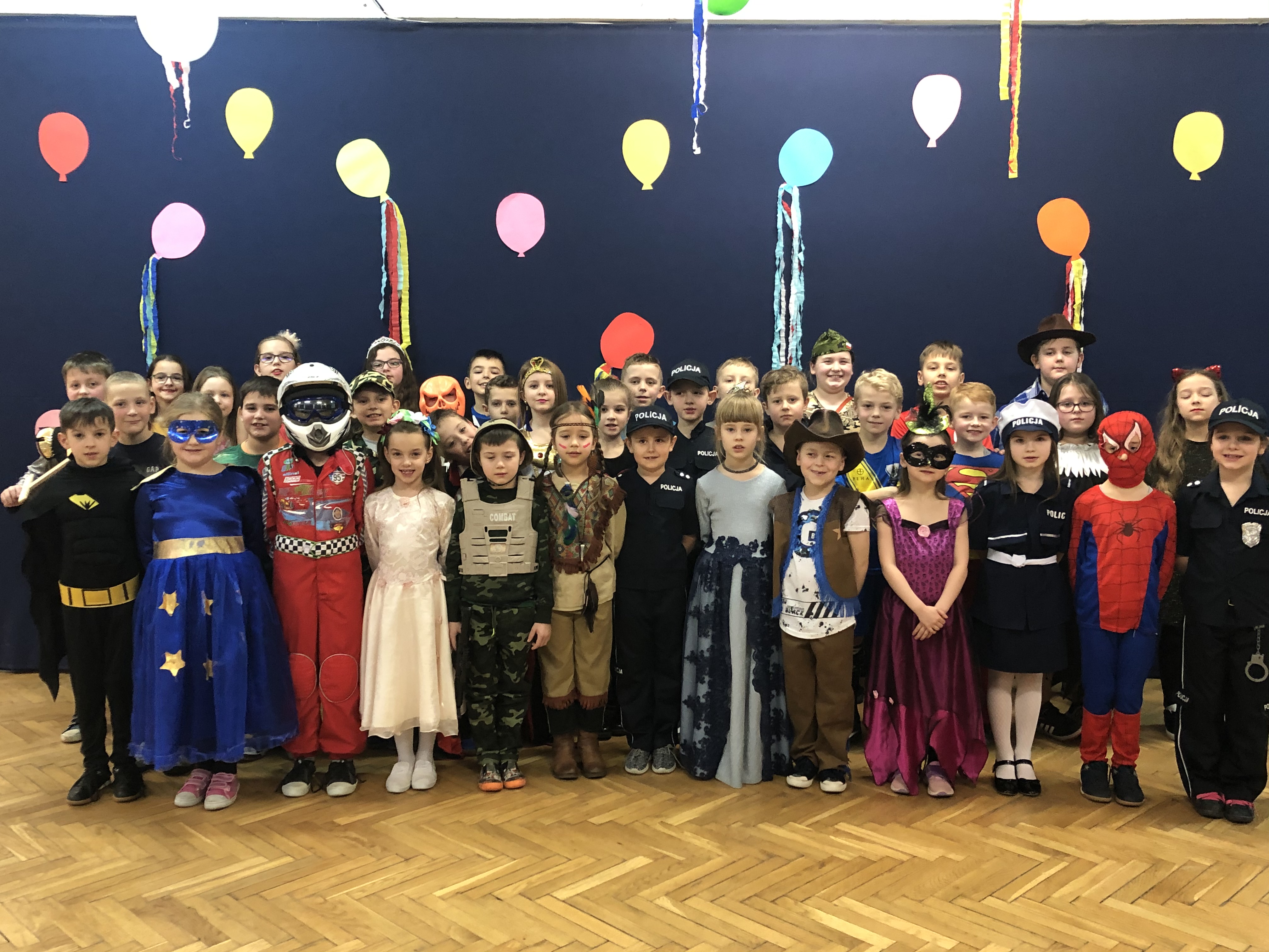 W dniu 18.02.2020 r. w naszej szkole odbył się długo wyczekiwany przez uczniów klas I-III bal karnawałowy. Dzieci przebrane w kolorowe stroje, wcieliły się w bohaterów znanych bajek i filmów. Niektórzy byli nie do poznania, a inni budzili podziw. Wszyscy bawili się znakomicie przy rytmach muzyki granej przez Pana Bartka. Były pociągi, korowody, kółeczka i tańce w parach. Dodatkową atrakcją okazały się efekty specjalne – przemieszczający się po sali balowej dym. W czasie przerwy dzieci miały czas na słodki poczęstunek przygotowany przez rodziców. Każde dziecko otrzymało pysznego pączka, którego kalorie spalało w mgnieniu oka w czasie tanecznej zabawy.