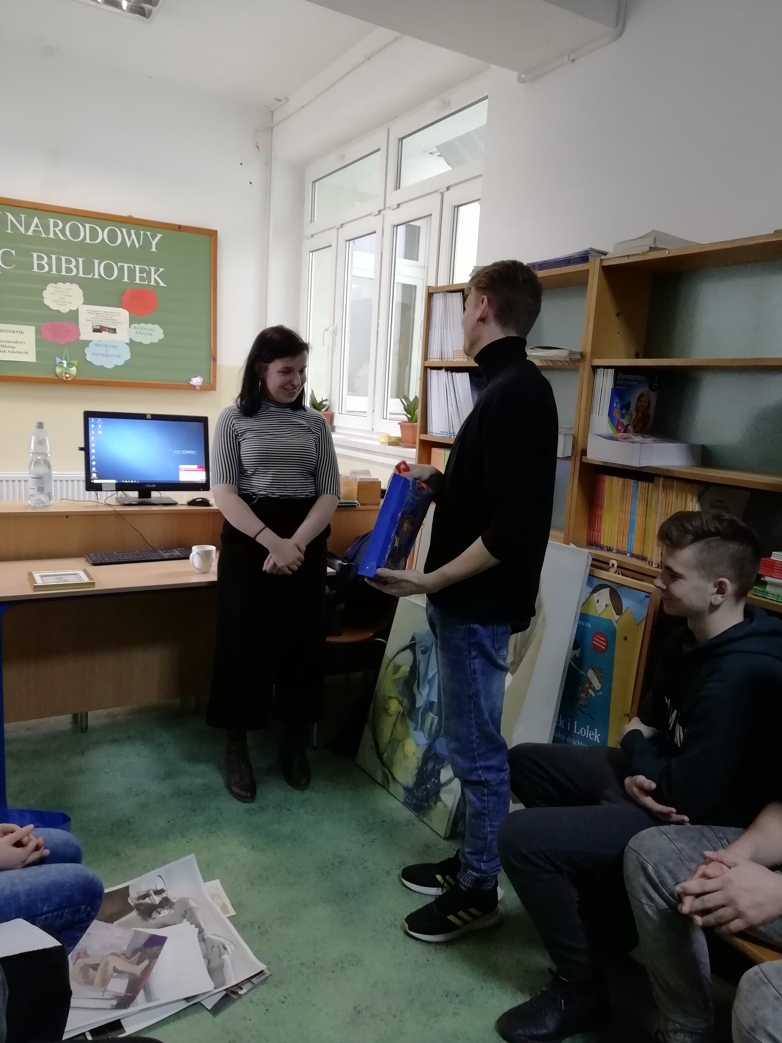 Nasz gość niezwykle ciekawie opowiadał uczniom o swoim dodatkowym zajęciu, jakim jest praca w krakowskiej „Ramiarni”, która specjalizuje się w artystycznej oprawie obrazów. Oprócz tradycyjnych obrazów pani Ania oprawiała… prawie wszystko, np. zęby rekina, kawałek deski podłogowej, części garderoby, kwiaty z bukietu ślubnego, deskę klozetową i wiele innych przedmiotów.