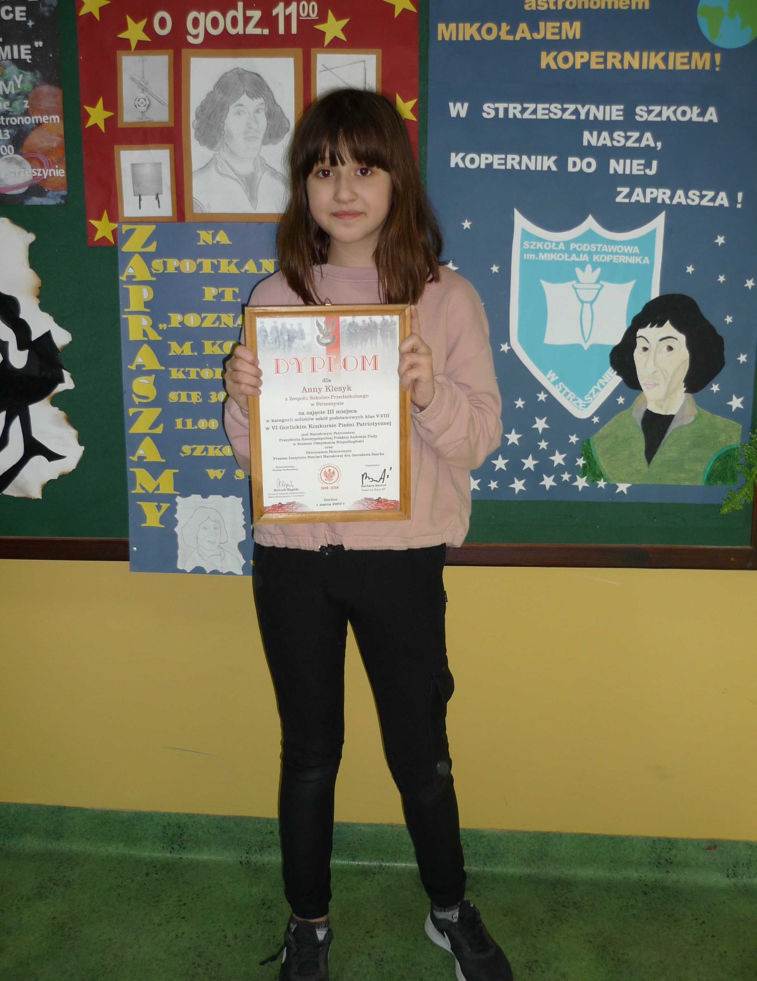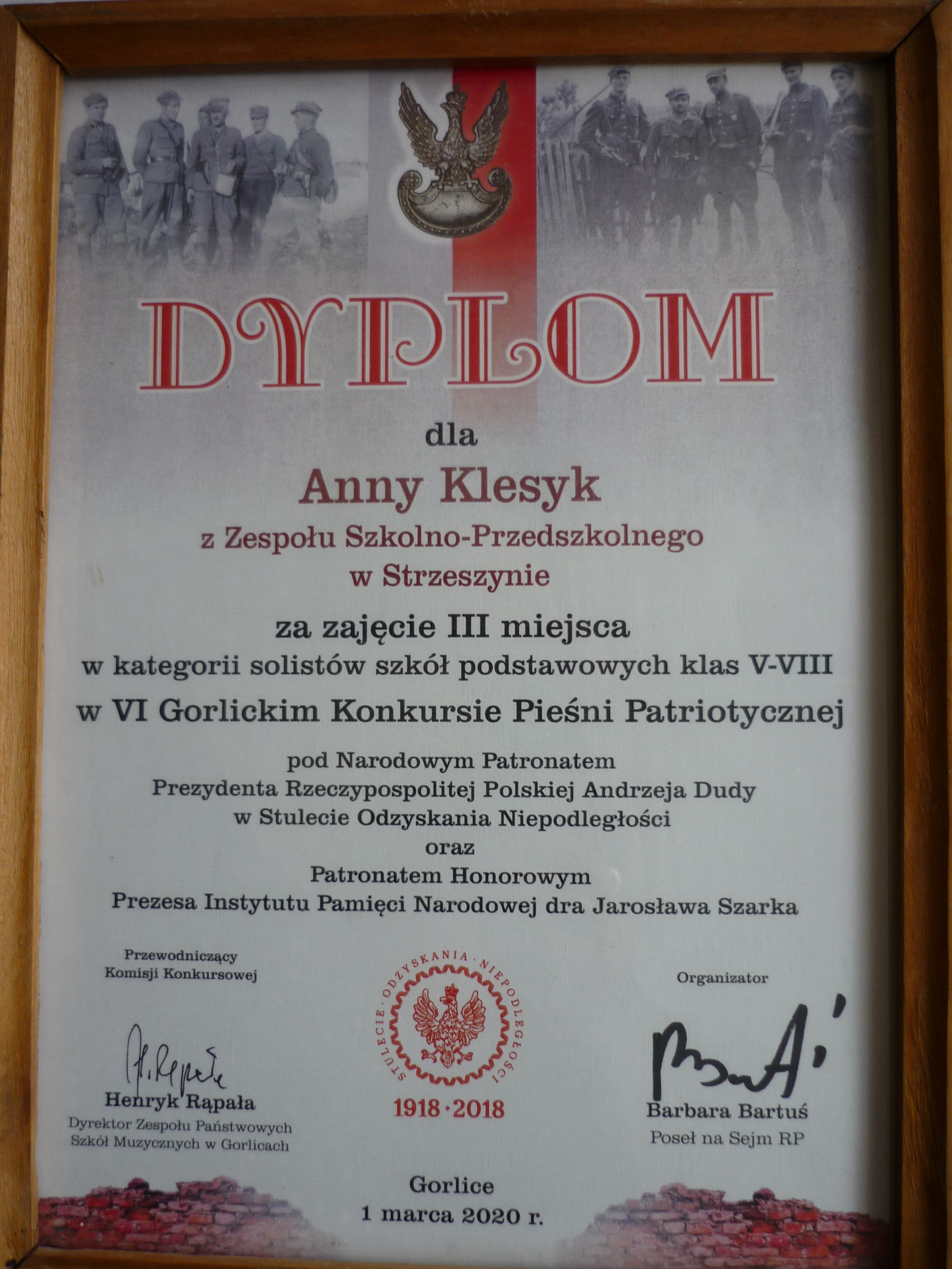 Miło nam poinformować, że w konkursie tym brała również udział uczennica naszej szkoły – Anna Klesyk z klasy V, zajmując zaszczytne III miejsce. Podczas swojego występu pięknie zaprezentowała losowo wytypowaną jedną z sześciu obowiązkowych pieśni patriotycznych ,,Piechota ”oraz wybrany przez siebie utwór ,,Kolęda warszawska 1939”.