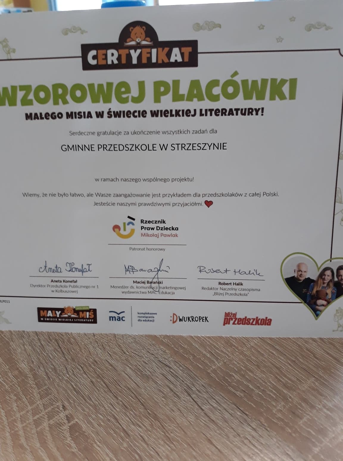 Realizując powyższe moduły przedszkole uzyskało certyfikat wzorowej placówki. Nie było łatwo, ale dzięki zaangażowaniu rodziców, dzieci i nauczycieli daliśmy radę.