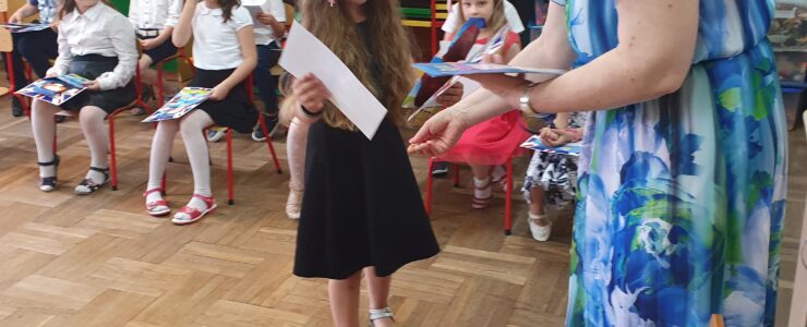 Pani Dyrektor Jadwiga Szara podziękowała rodzicom oraz nauczycielom za współpracę i zaangażowanie podczas zdalnego nauczania oraz wręczyła dzieciom pamiątkowe dyplomy ukończenia przedszkola.