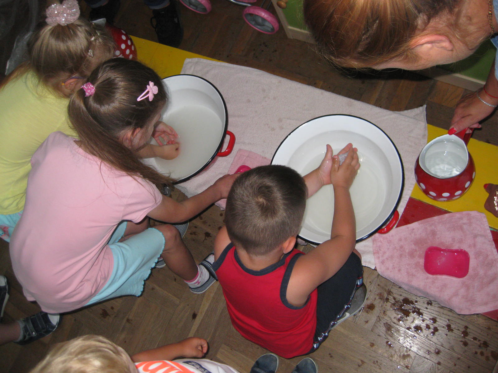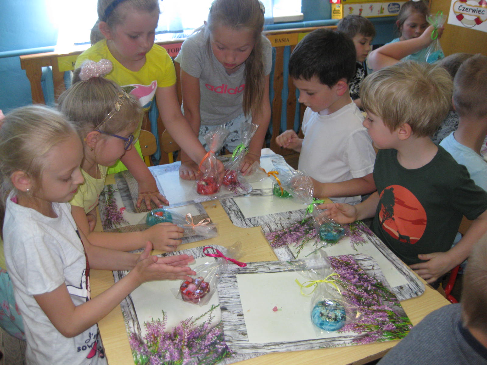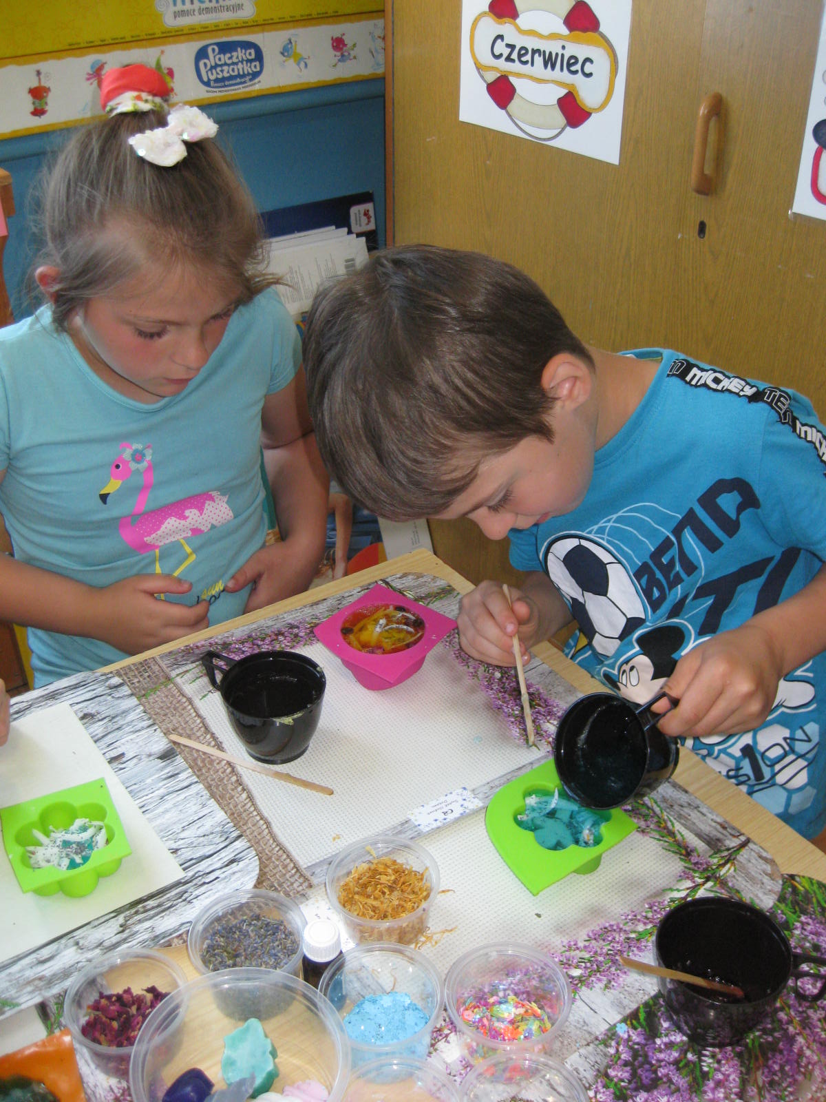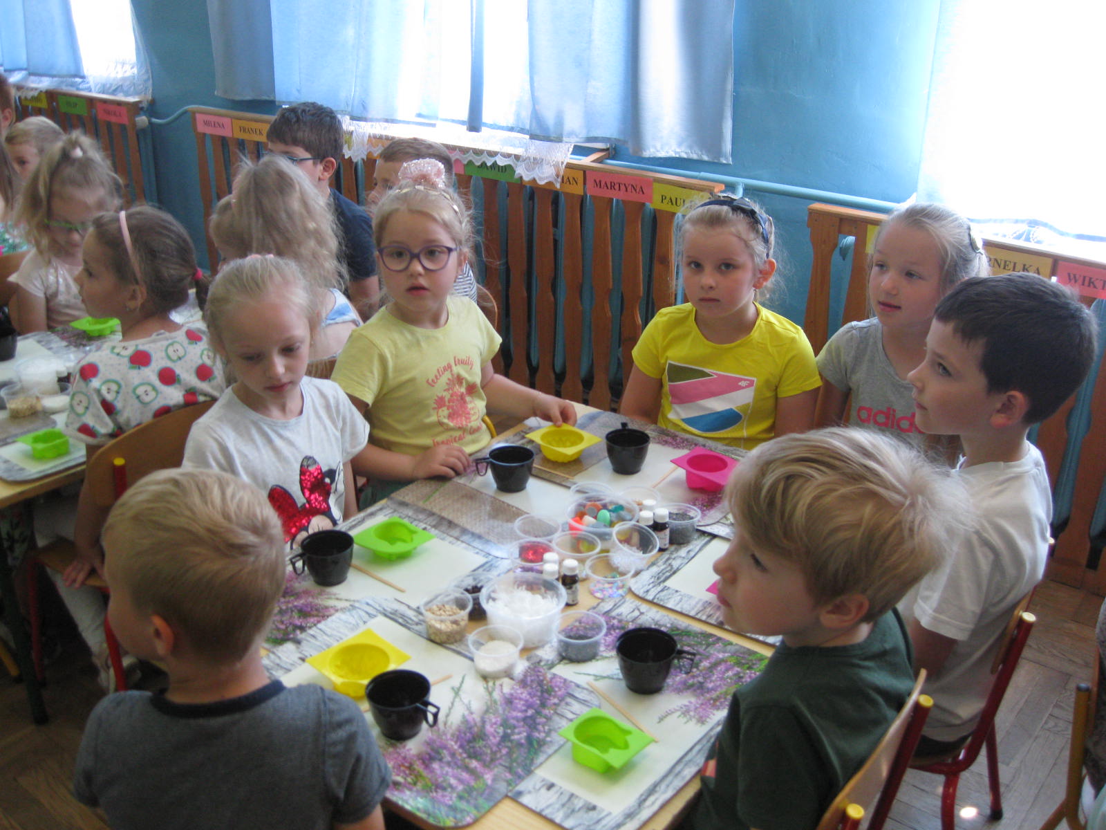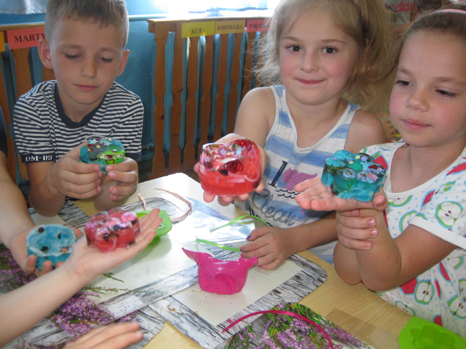 W dniu 18.06.2021 r. przedszkolaki uczestniczyły w warsztatach mydlarskich, podczas których zgodnie z instrukcją osoby prowadzącej, samodzielnie wykonały pachnące, kolorowe i pięknie ozdobione mydełka o przeróżnych kształtach. Podczas warsztatów, dzieci dowiedziały się również jaka jest historia mydła, z czego tworzy się mydlane kształty, w jaki sposób w mydlanych kostkach gromadzi się moc zapachów i niezwykłych barw. Odbył się także konkurs mycia rączek w zabytkowej toaletce, a także wystawka zabytkowych mydełek