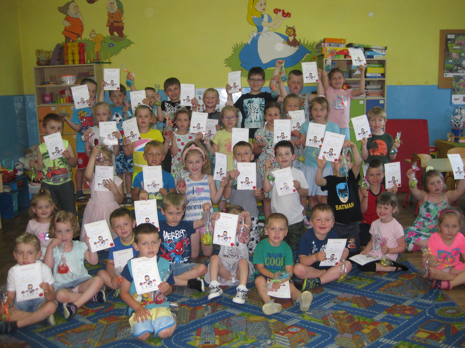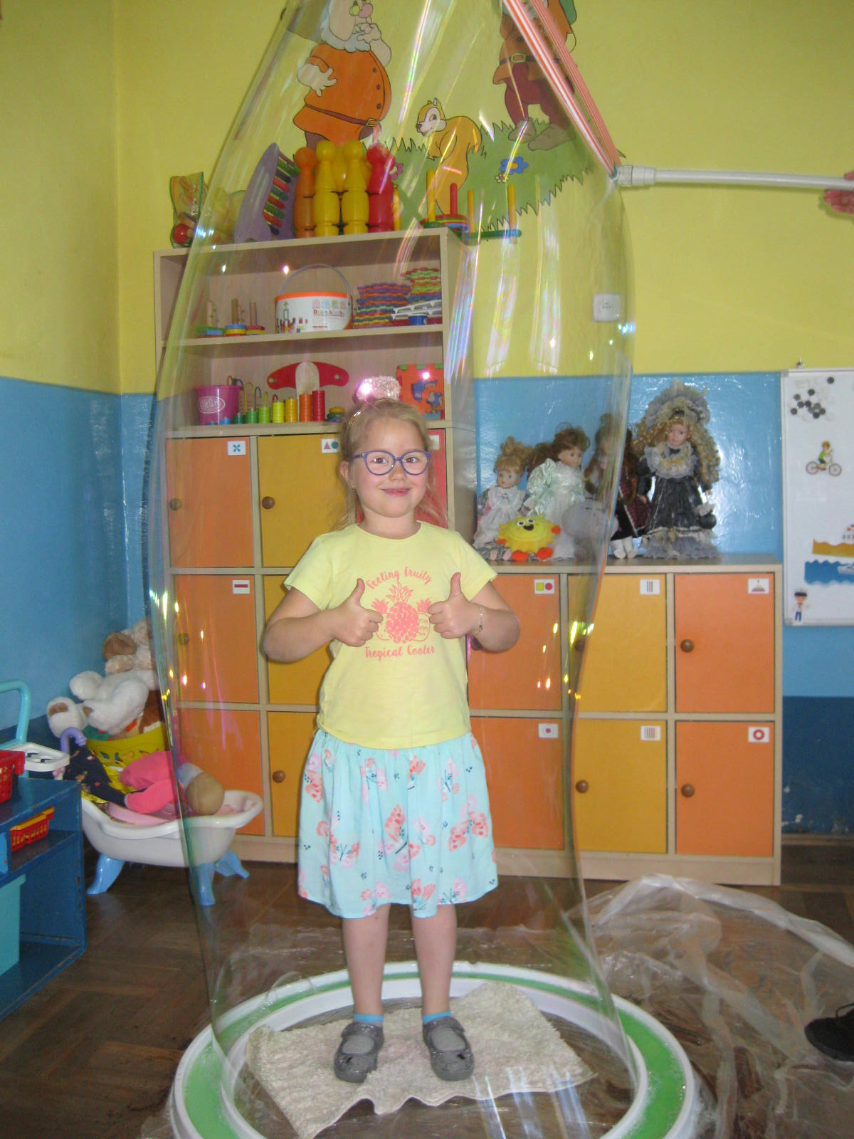 i sprzętów. Każde dziecko pod koniec zajęć otrzymało Dyplom Mydlarza oraz zostało zamknięte w ogromnej bańce mydlanej. Własnoręcznie wykonane mydełka zostały zapakowane w woreczki i zabrane przez dzieci do domu. Mamy nadzieję, że ten owocny