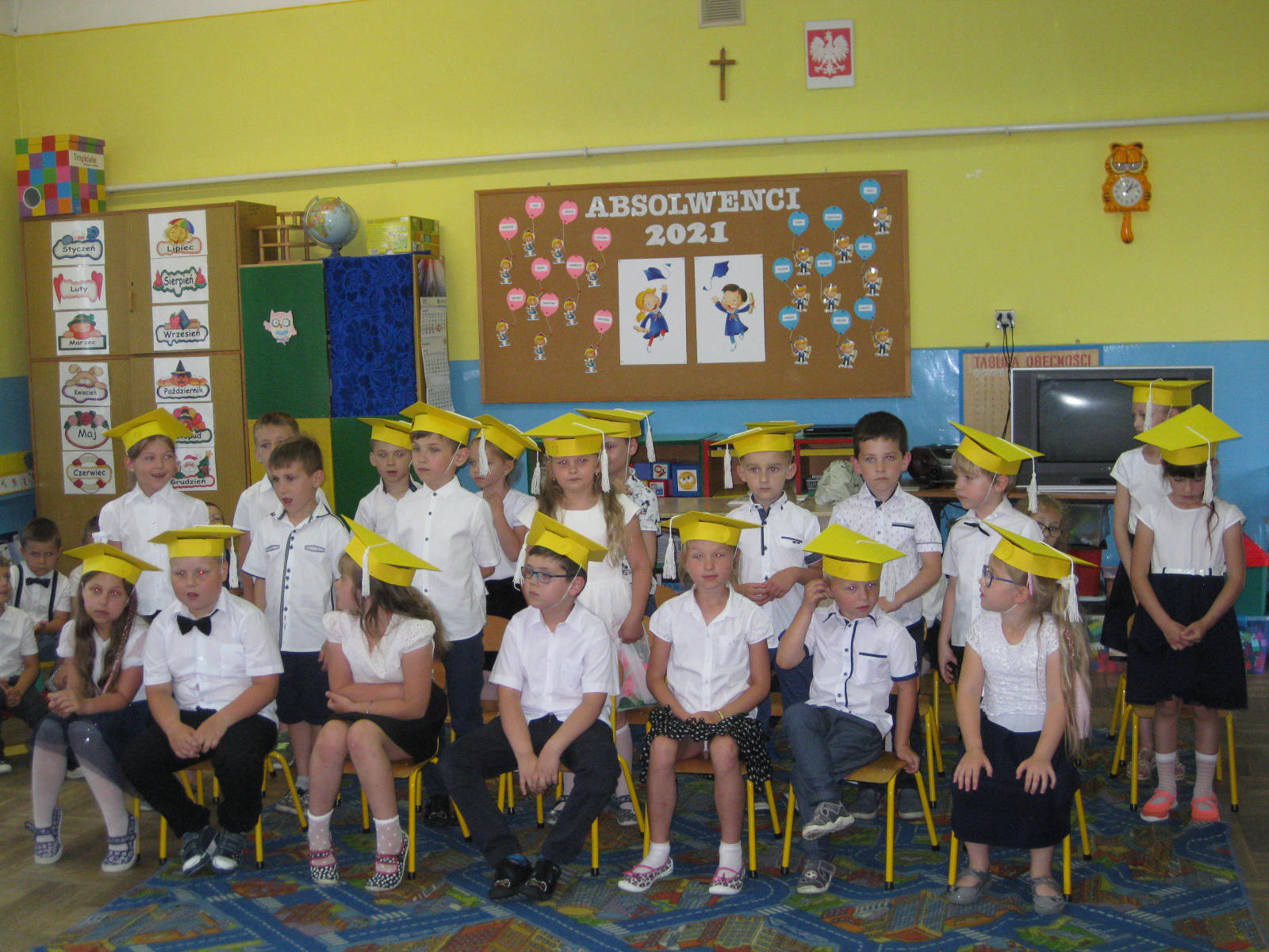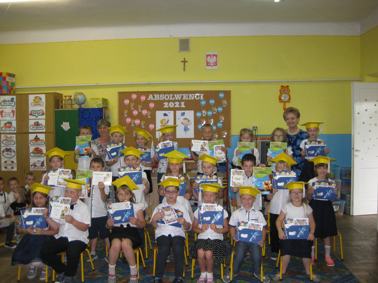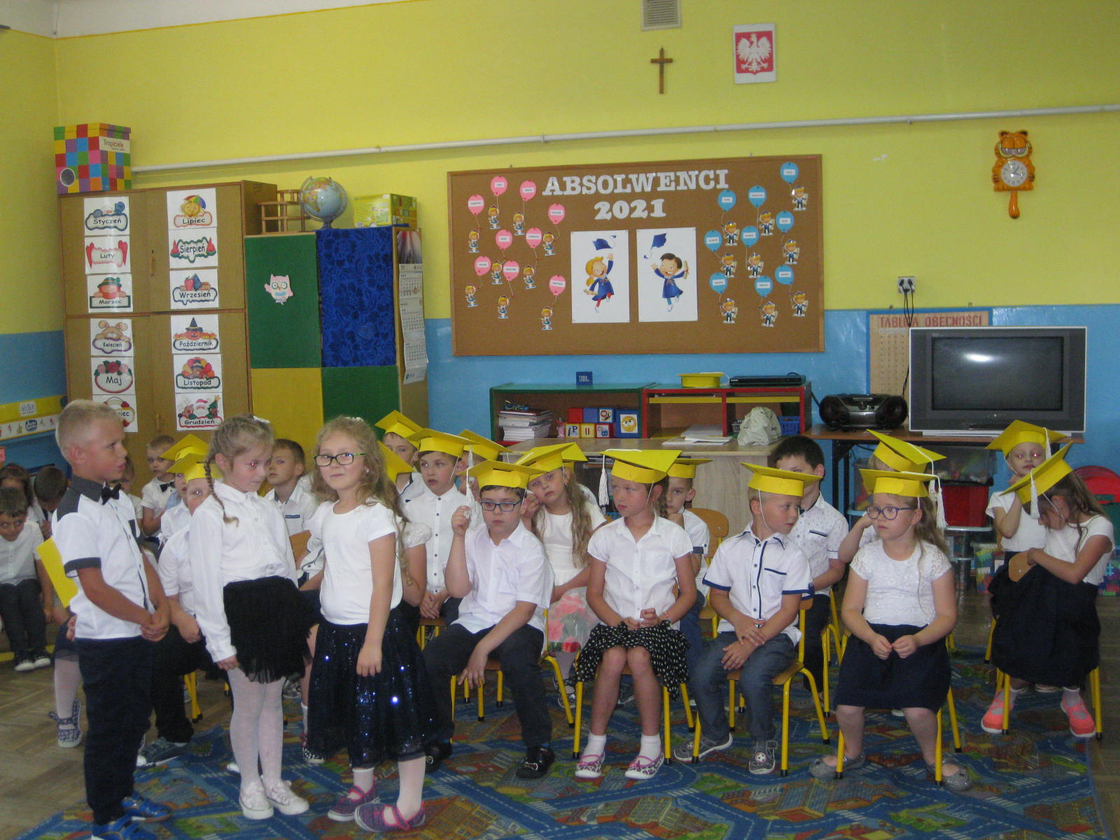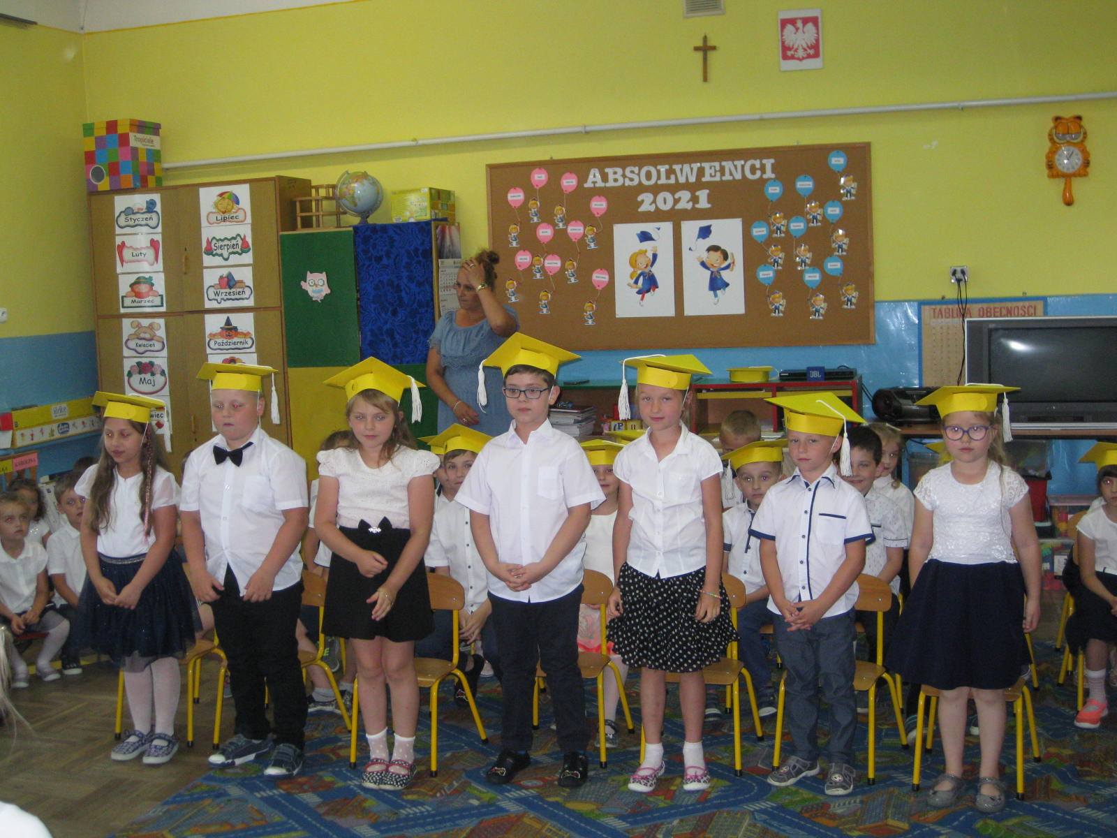 W piątek 25.06.2021 r., w naszym przedszkolu odbyło się uroczyste zakończenie roku przedszkolnego. Ze względu na zaistniałą sytuację epidemiologiczną do przedszkola przybyli tylko rodzice tegorocznych absolwentów oraz pani dyrektor Jadwiga Szara. Na początek dzieci młodsze pożegnały starszaków wierszami i piosenką. Następnie swój repertuar zaprezentowały starszaki.