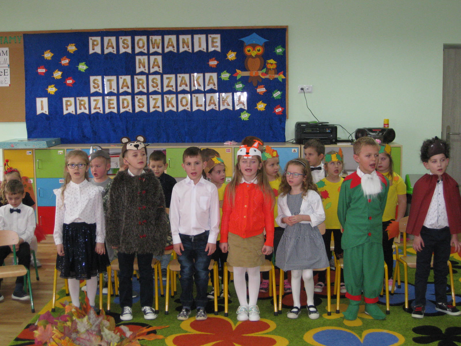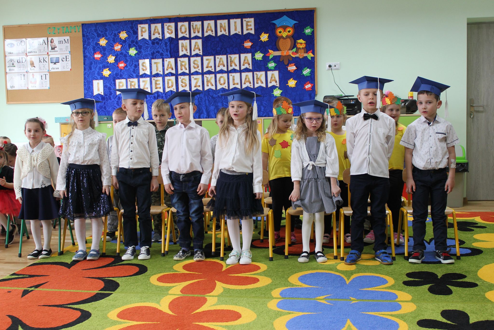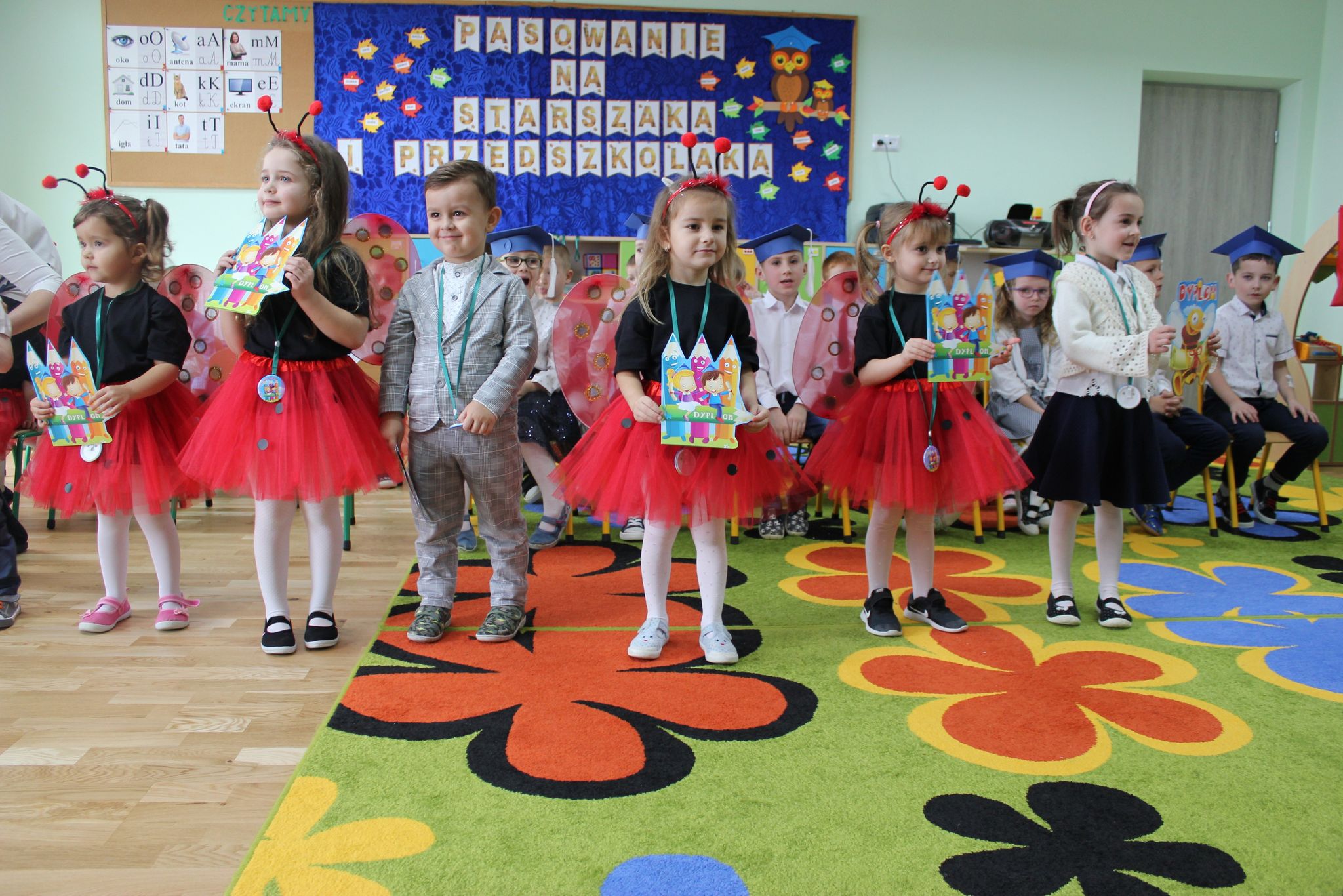z grup „Pszczółki” i „Biedronki”. W uroczystości udział wzięli rodzice oraz dyrektor mgr Jadwiga Szara. Dzieci zaprezentowały program artystyczny, który wzbudził zachwyt gości. Maluszki wykazały się wielką odwagą, pięknie recytowały wiersze i śpiewały piosenkę. Starszaki przygotowały przedstawienie „ Jak krasnal szykował się do zimy”. Punktem kulminacyjnym było pasowanie, poprzez symboliczne nałożenie ołówka przez panią dyrektor na ramię każdego dziecka. Na pamiątkę tego ważnego dnia przedszkolaki otrzymały dyplomy i medale. Po zakończeniu części oficjalnej dzieci pozowały do pamiątkowego zdjęcia i czekał na nie słodki poczęstunek.