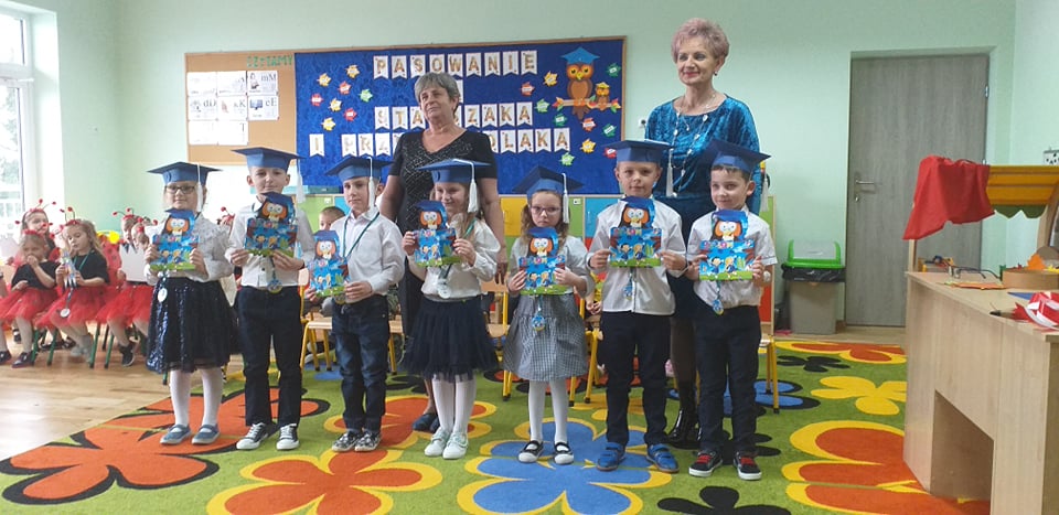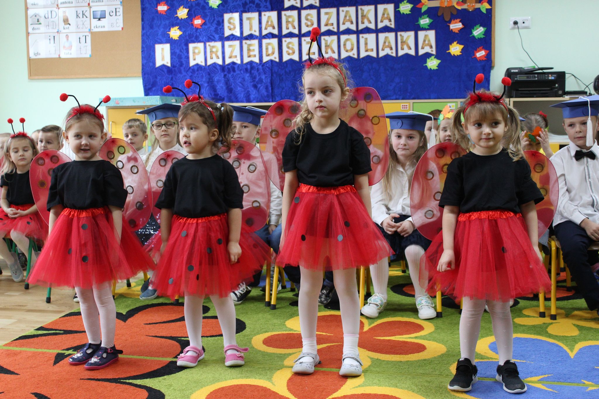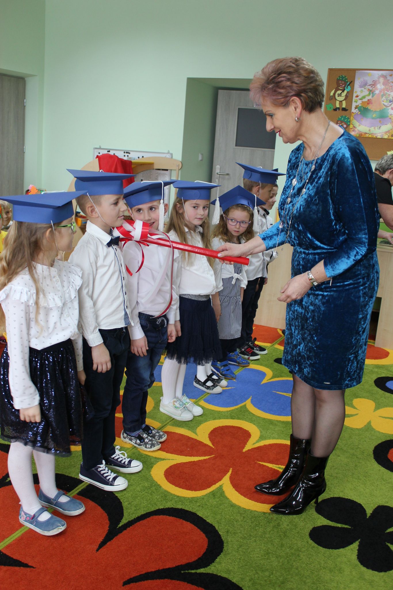 z grup „Pszczółki” i „Biedronki”. W uroczystości udział wzięli rodzice oraz dyrektor mgr Jadwiga Szara. Dzieci zaprezentowały program artystyczny, który wzbudził zachwyt gości. Maluszki wykazały się wielką odwagą, pięknie recytowały wiersze i śpiewały piosenkę. Starszaki przygotowały przedstawienie „ Jak krasnal szykował się do zimy”. Punktem kulminacyjnym było pasowanie, poprzez symboliczne nałożenie ołówka przez panią dyrektor na ramię każdego dziecka. Na pamiątkę tego ważnego dnia przedszkolaki otrzymały dyplomy i medale. Po zakończeniu części oficjalnej dzieci pozowały do pamiątkowego zdjęcia i czekał na nie słodki poczęstunek.