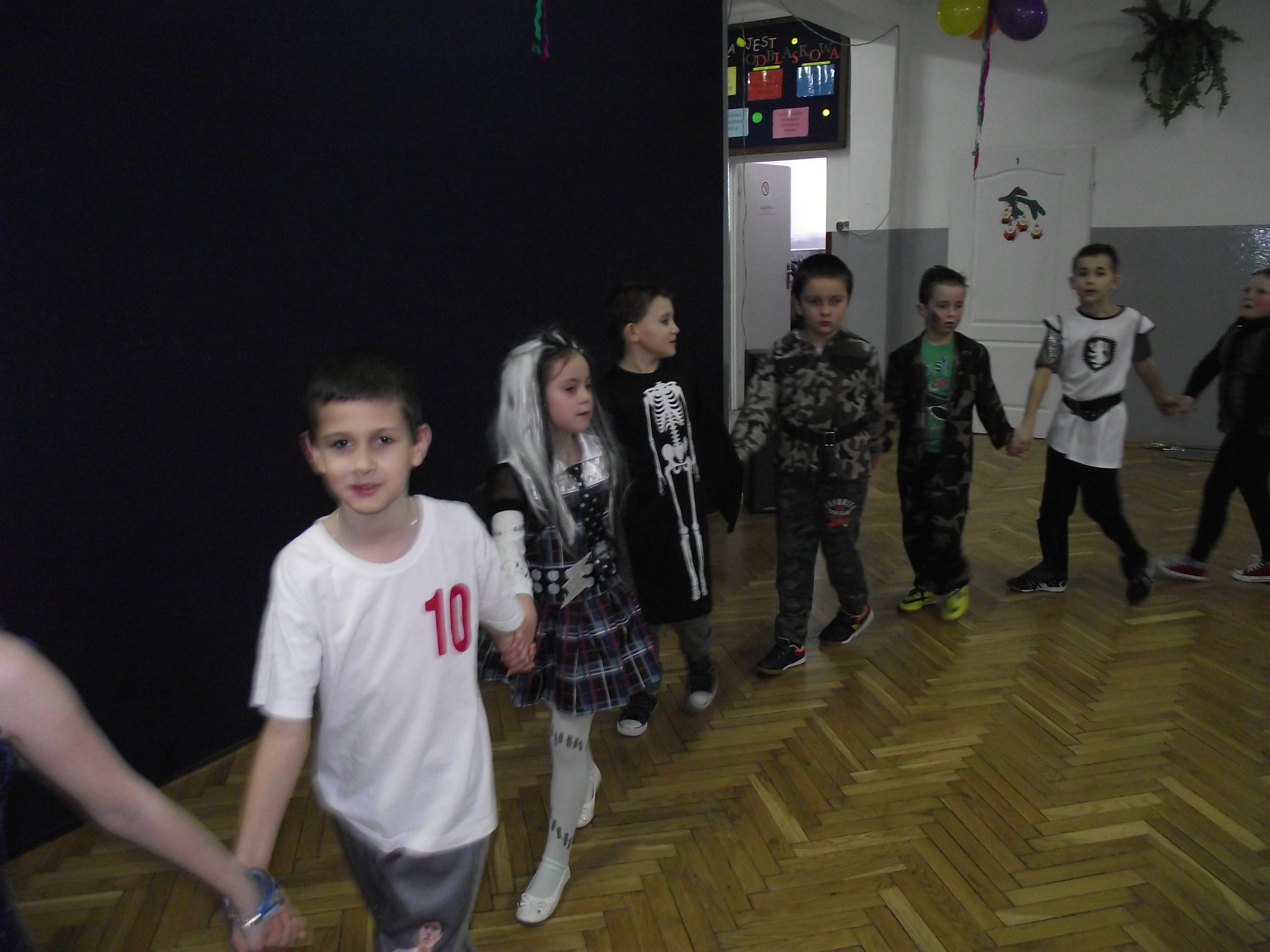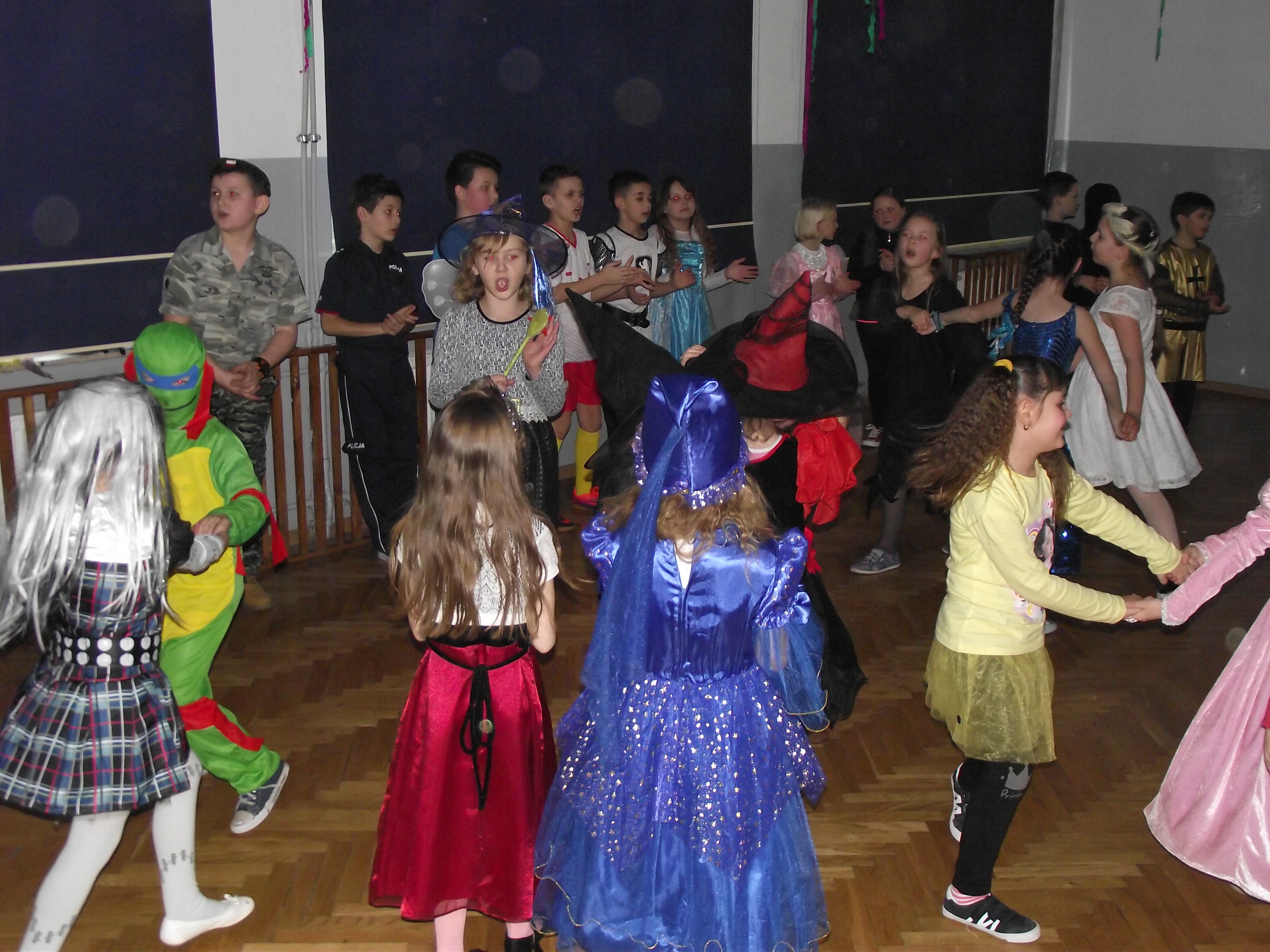a nawet pojawił się ninja, piłkarz i pszczółka. Przebierańcy świetnie bawili się w rytm skocznej muzyki. Z ochotą uczestniczyli też we wspólnych zabawach ruchowo-muzycznych. Troszkę zmęczeni usiedli do poczęstunku, który przygotowały dla swoich pociech mamy z Rady Rodziców. Po chwili relaksu chętnie powrócili do wesołej zabawy. Czas przeznaczony na bal minął bardzo szybko. Uczestnicy wracali do domów we wspaniałych humorach.