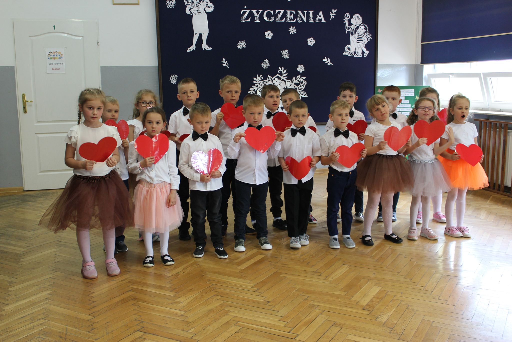 w kształcie serca wykonane przez maluszków. Publiczność była zachwycona popisami dzieci, a na twarzach zebranych gości malowało się wzruszenie, ale także duma ze swoich pociech. Na zakończenie odśpiewano „Sto lat” i mamy otrzymały upominki samodzielnie wykonane przez dzieci. Całusom i uściskom nie było końca, a atmosfera tej uroczystości była podniosła