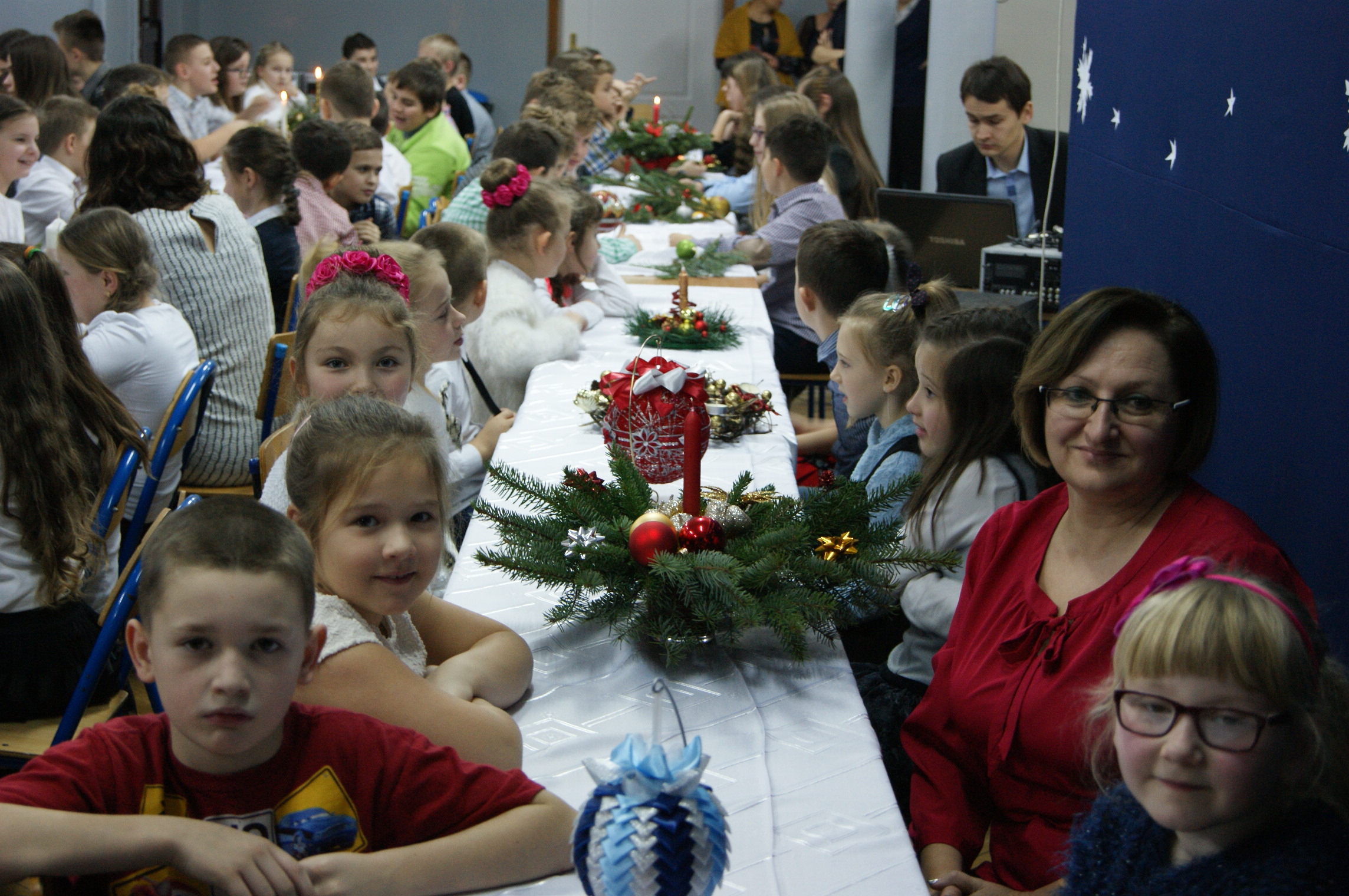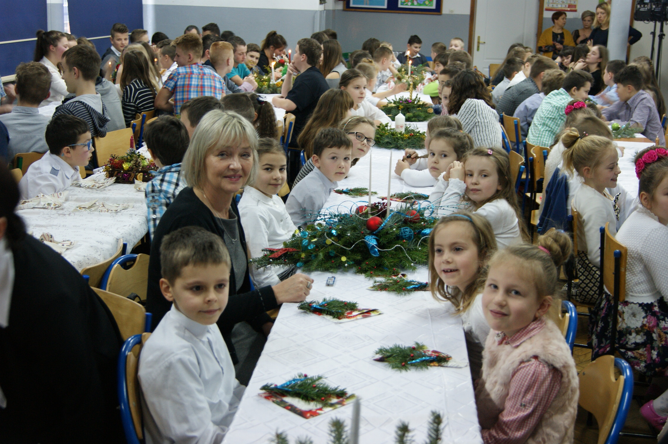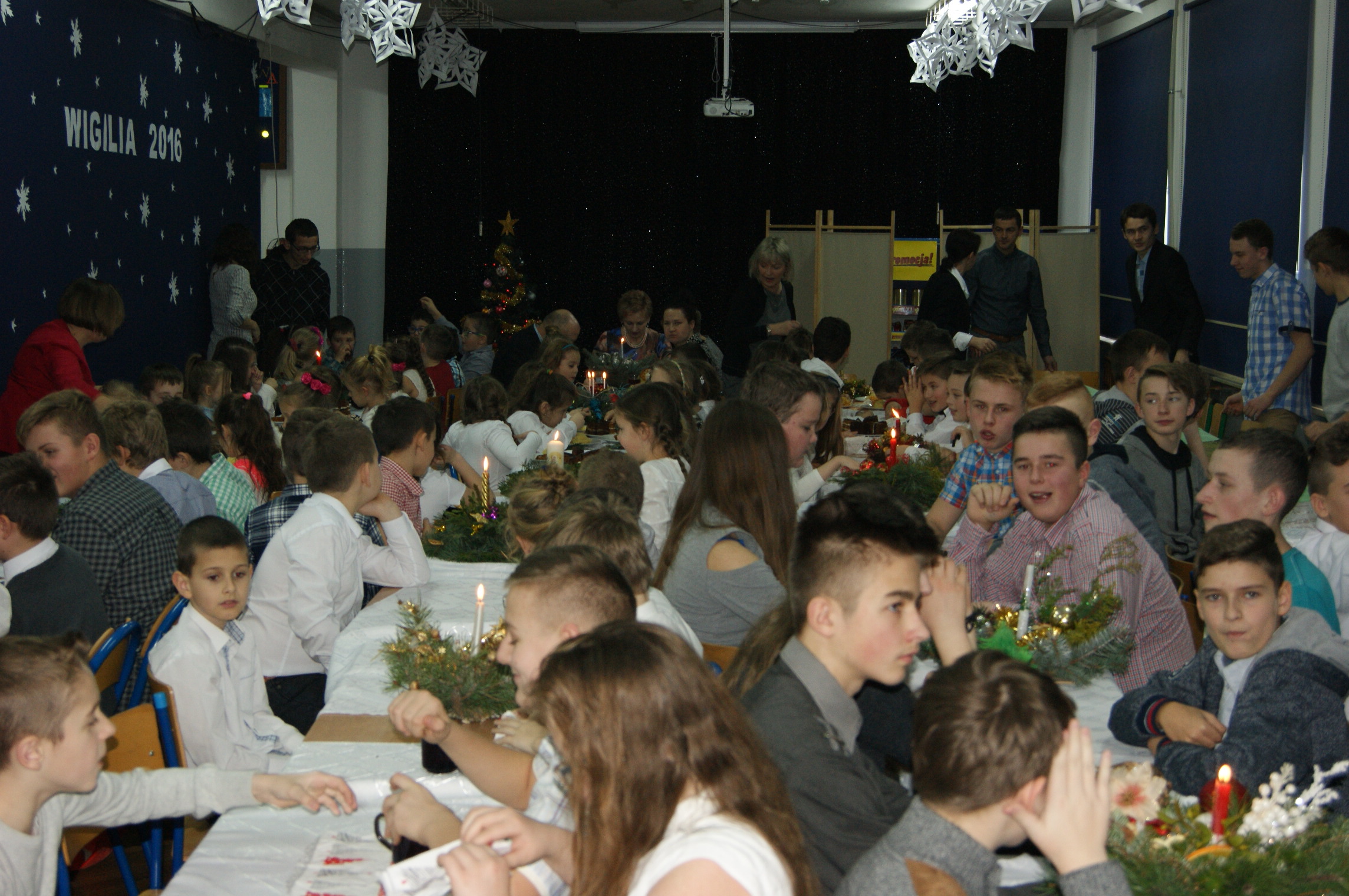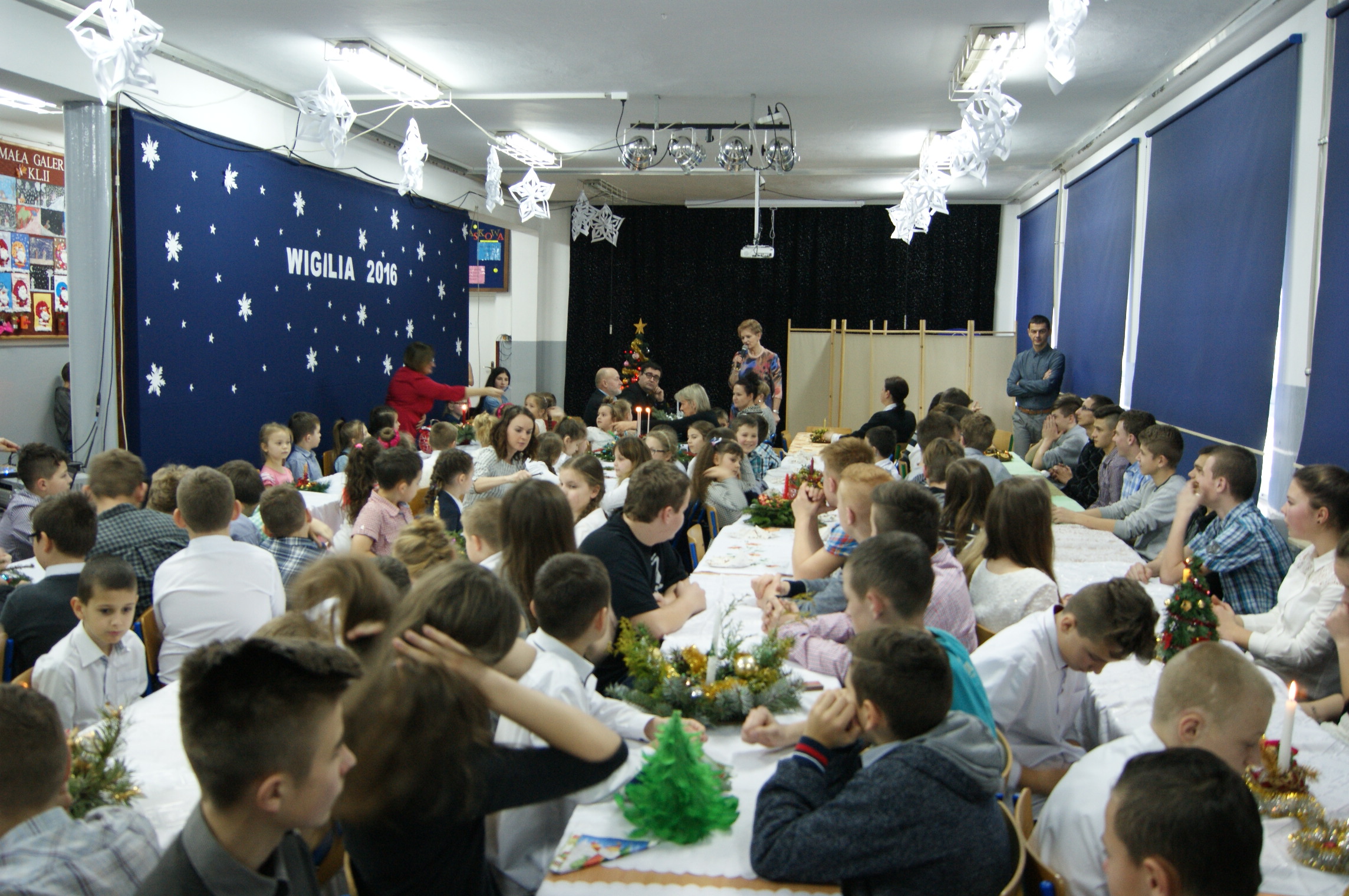 Odświętnie ubrani, uśmiechnięci, wszyscy usiedliśmy do pięknie udekorowanych stołów, aby wspólnie kolędować. Klasa IV przygotowała przedstawienie bożonarodzeniowe, które wprowadziło nas w świąteczny nastrój. Zgromadzeni w auli szkolnej uczniowie, nauczyciele, pracownicy szkoły oraz goście mieli okazję zobaczyć sceny, które rozgrywały się we współczesności, ale swój finał miały przy Bożym Żłóbku. Młodzi aktorzy wczuli się w swoje role znakomicie. Niejednemu widzowi nasunęło się pytanie: jak to możliwe? Przecież Jezus urodził się ponad dwa tysiące lat temu… Czy może narodzić się powtórnie? Skąd w progu naszego domu Maryja z Józefem i małym Dzieciątkiem na ręku? Czy to możliwe, byśmy każdego roku mogli świętować Boże Narodzenie? Czy oprócz Świętej Rodziny stoją obok nas również Anioł i diabeł? W kolejnej części uroczystości nastąpiło łamanie się opłatkiem, składanie sobie życzeń i degustacja potraw wigilijnych przygotowanych przez panie kucharki. Pani dyrektor mgr Jadwiga Szara złożyła wszystkim obecnym i ich rodzinom życzenia świąteczne i noworoczne. Po czym wszyscy uczestnicy uroczystości ochoczo włączyli się w śpiew kolęd.
