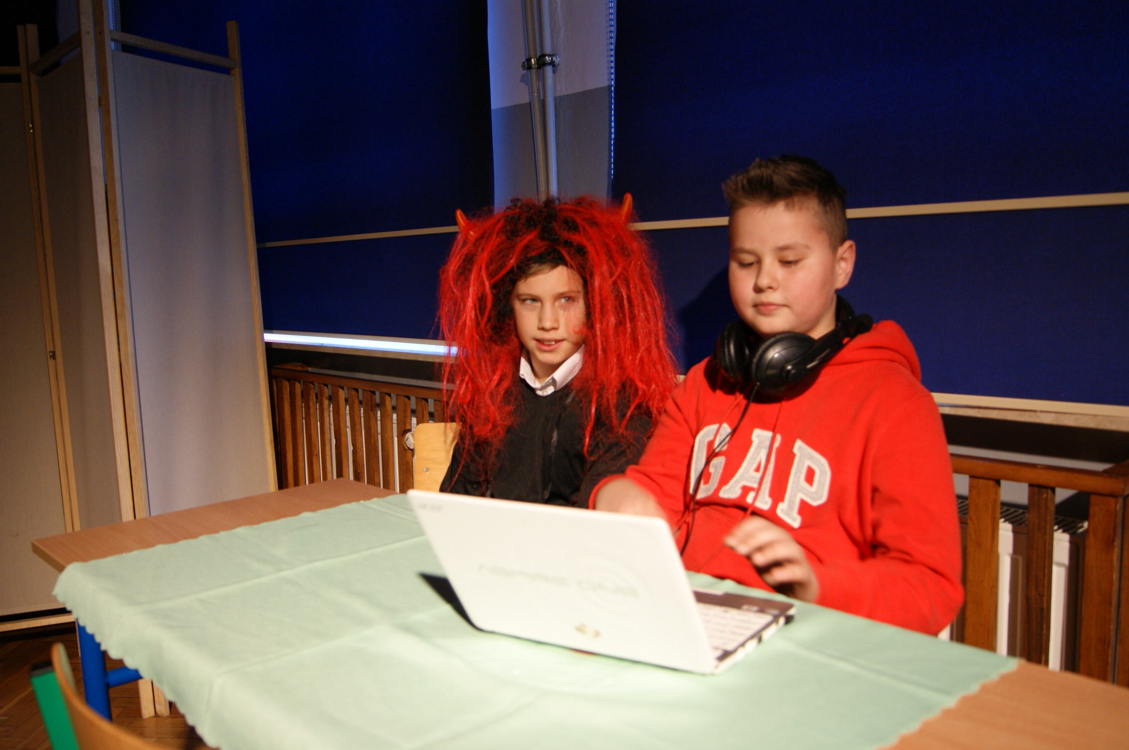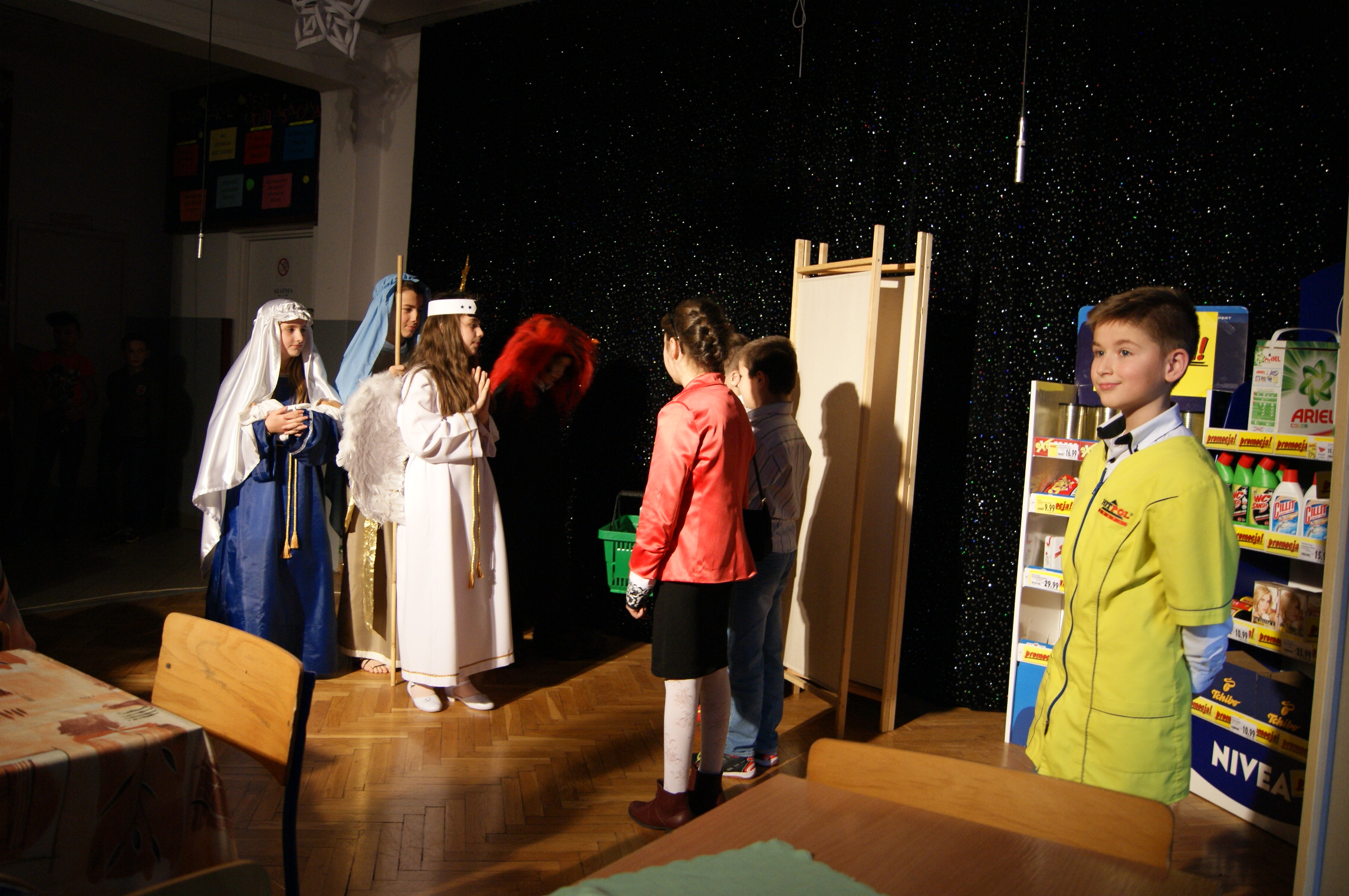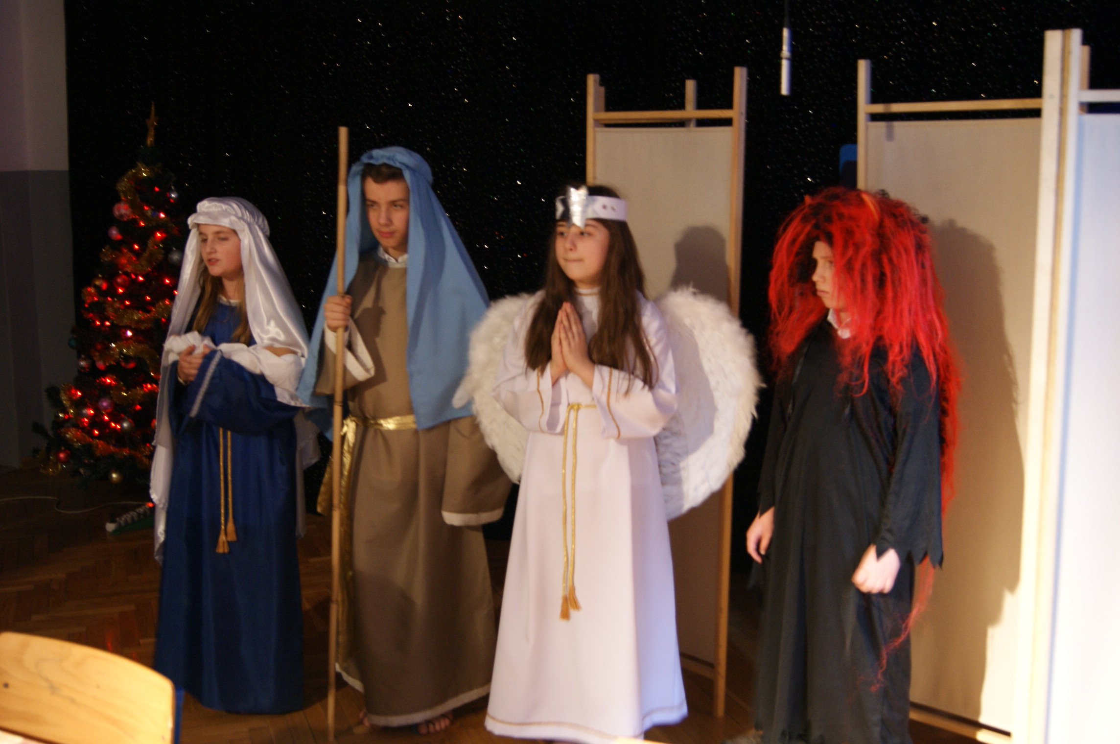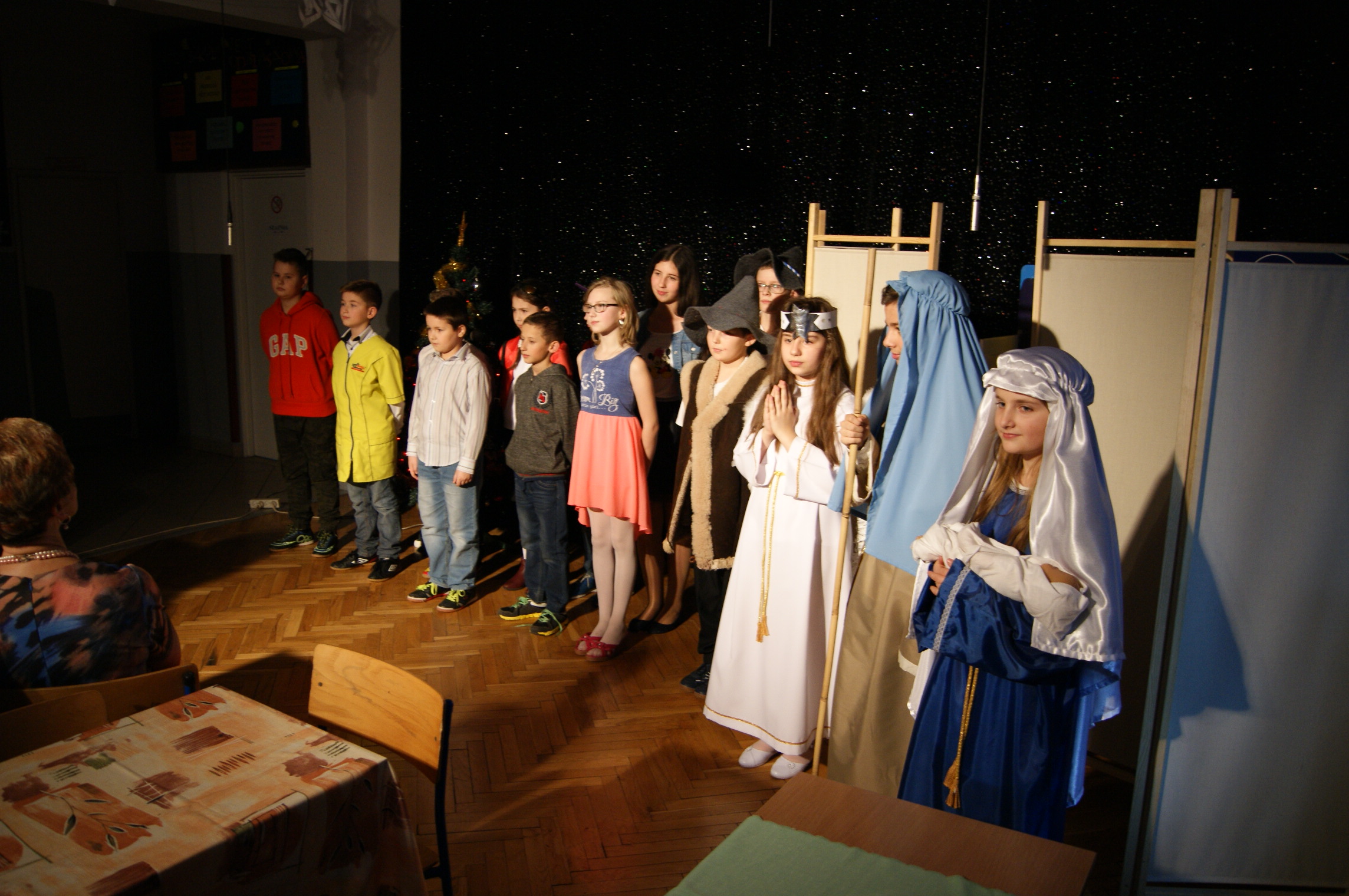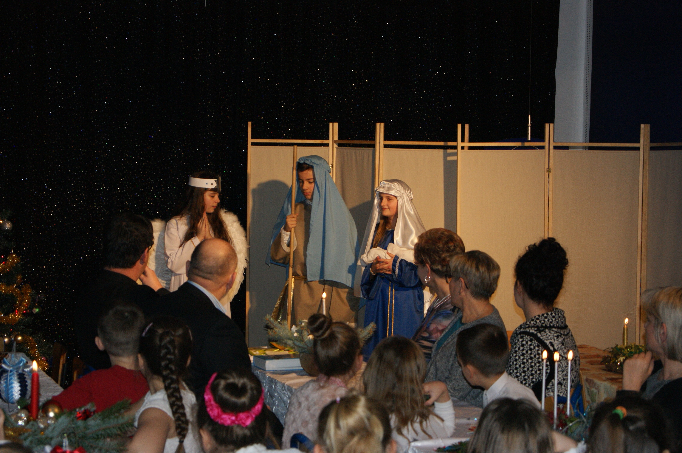 Odświętnie ubrani, uśmiechnięci, wszyscy usiedliśmy do pięknie udekorowanych stołów, aby wspólnie kolędować. Klasa IV przygotowała przedstawienie bożonarodzeniowe, które wprowadziło nas w świąteczny nastrój. Zgromadzeni w auli szkolnej uczniowie, nauczyciele, pracownicy szkoły oraz goście mieli okazję zobaczyć sceny, które rozgrywały się we współczesności, ale swój finał miały przy Bożym Żłóbku. Młodzi aktorzy wczuli się w swoje role znakomicie. Niejednemu widzowi nasunęło się pytanie: jak to możliwe? Przecież Jezus urodził się ponad dwa tysiące lat temu… Czy może narodzić się powtórnie? Skąd w progu naszego domu Maryja z Józefem i małym Dzieciątkiem na ręku? Czy to możliwe, byśmy każdego roku mogli świętować Boże Narodzenie? Czy oprócz Świętej Rodziny stoją obok nas również Anioł i diabeł? W kolejnej części uroczystości nastąpiło łamanie się opłatkiem, składanie sobie życzeń i degustacja potraw wigilijnych przygotowanych przez panie kucharki. Pani dyrektor mgr Jadwiga Szara złożyła wszystkim obecnym i ich rodzinom życzenia świąteczne i noworoczne. Po czym wszyscy uczestnicy uroczystości ochoczo włączyli się w śpiew kolęd.
