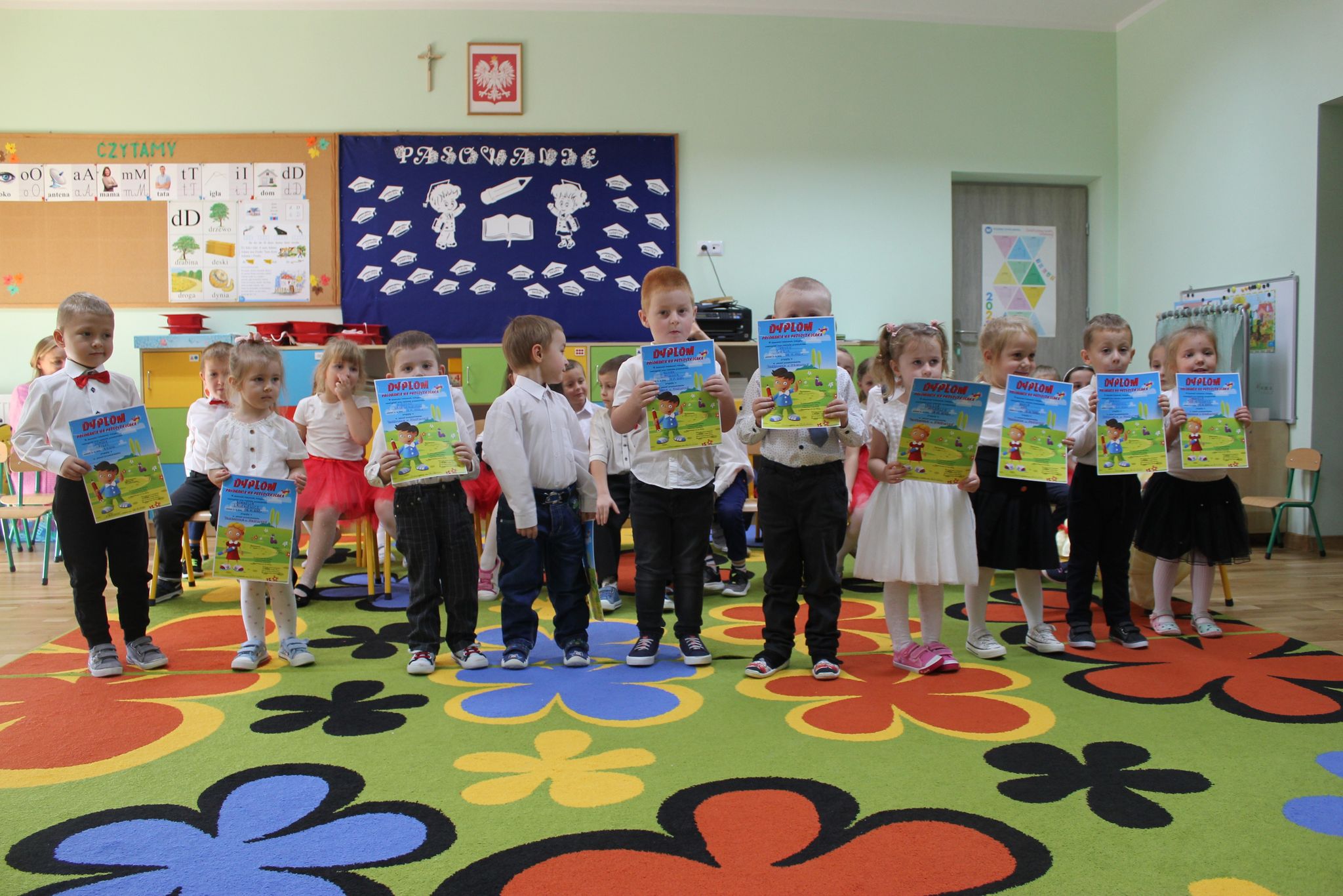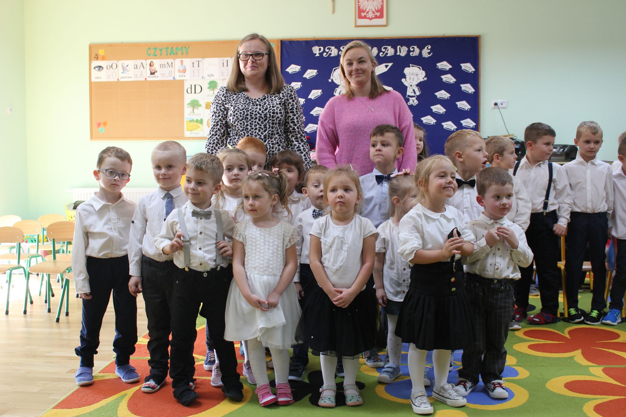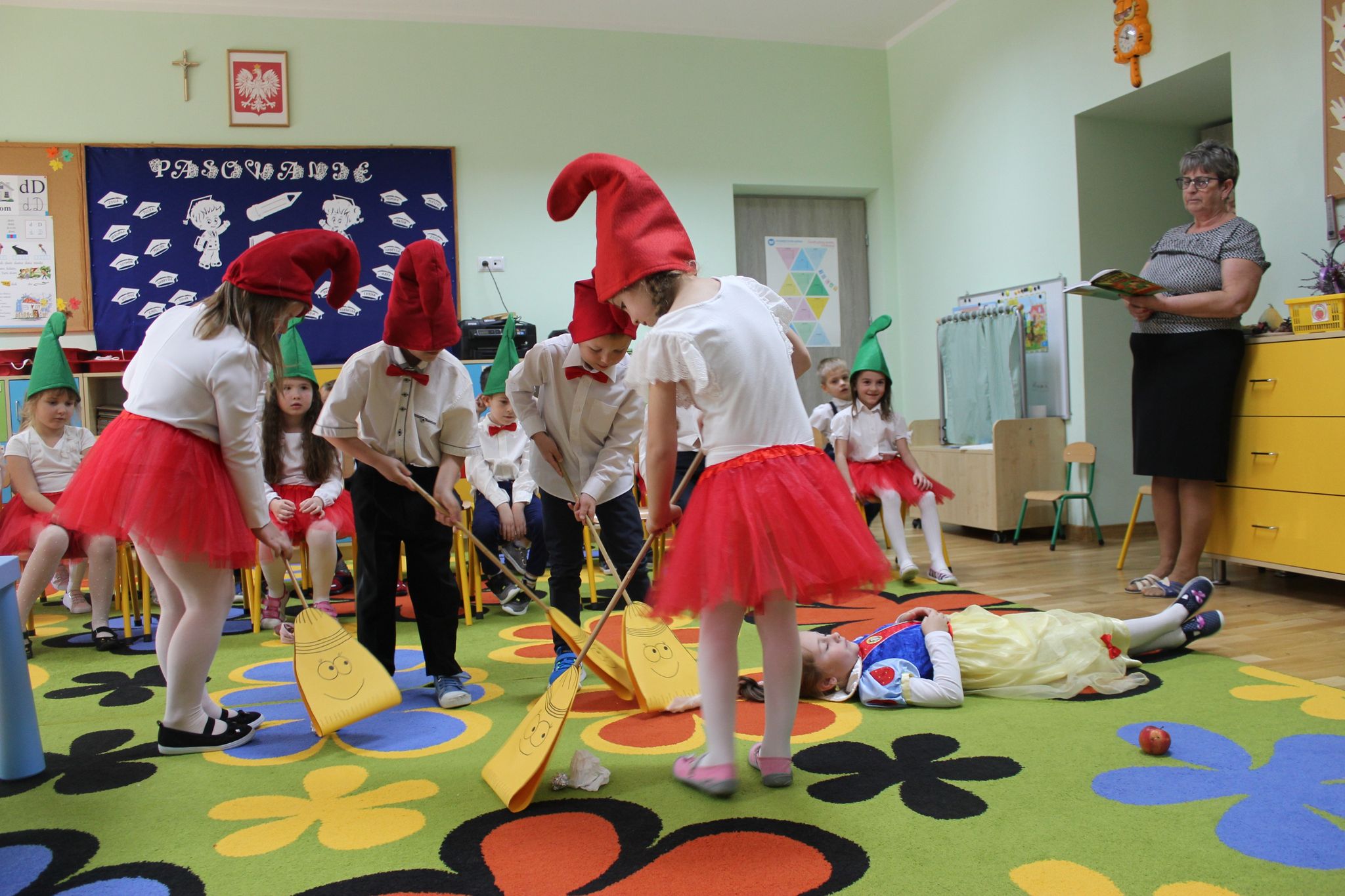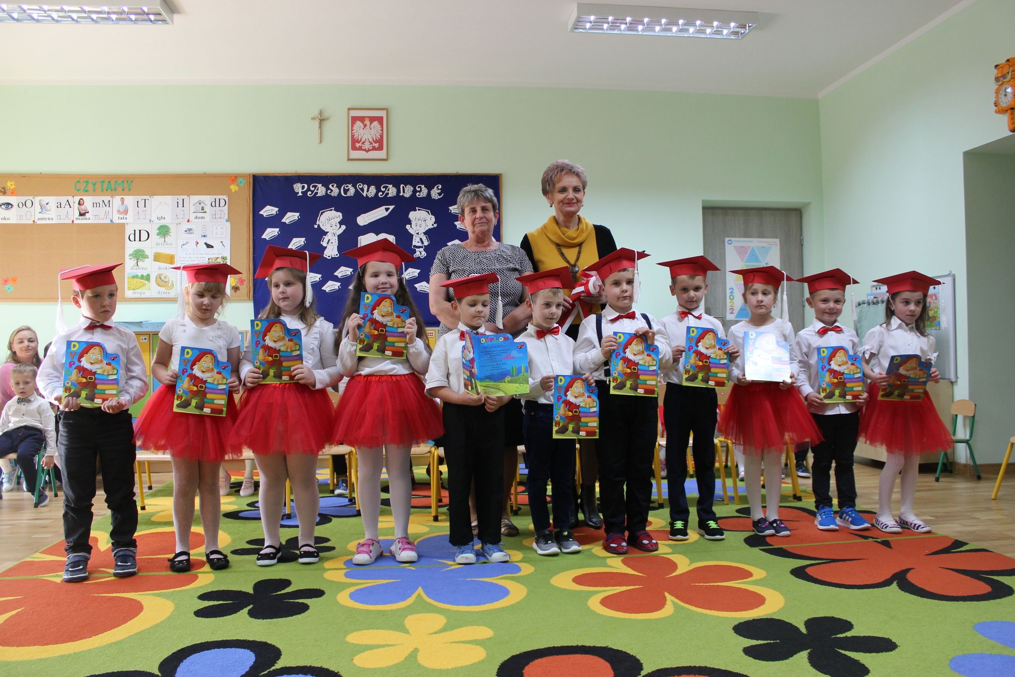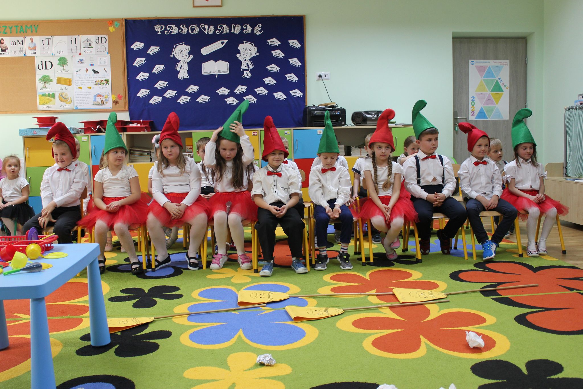 08.11.2022r w naszym przedszkolu odbyło się pasowanie na starszaka i przedszkolaka. Był to szczególny dzień dla dzieci z grupy ,,Biedronek ”, które po raz pierwszy przekroczyły próg naszego przedszkola. Przedszkolaki zaprezentowały swoje umiejętności w piosence i wierszach. Starszaki wystąpiły w inscenizacji ,,Bajka o Śnieżce, krasnoludkach i zerówce ”. Po części artystycznej nastąpił akt pasowania, czyli dotknięcie ramienia każdego przedszkolaka dużą kredką przez Panią Dyrektor. Pasowanie odbyło się w obecności rodziców, którzy mogli podziwiać swoje dzieci w tym jakże wyjątkowym dniu. Rodzicom dziękujemy za zaangażowanie i przygotowanie słodkiego poczęstunku. Uroczystość pasowania była dla dzieci wielkim przeżyciem , a dla rodziców powodem do dumy i zadowolenia ze swoich pociech.