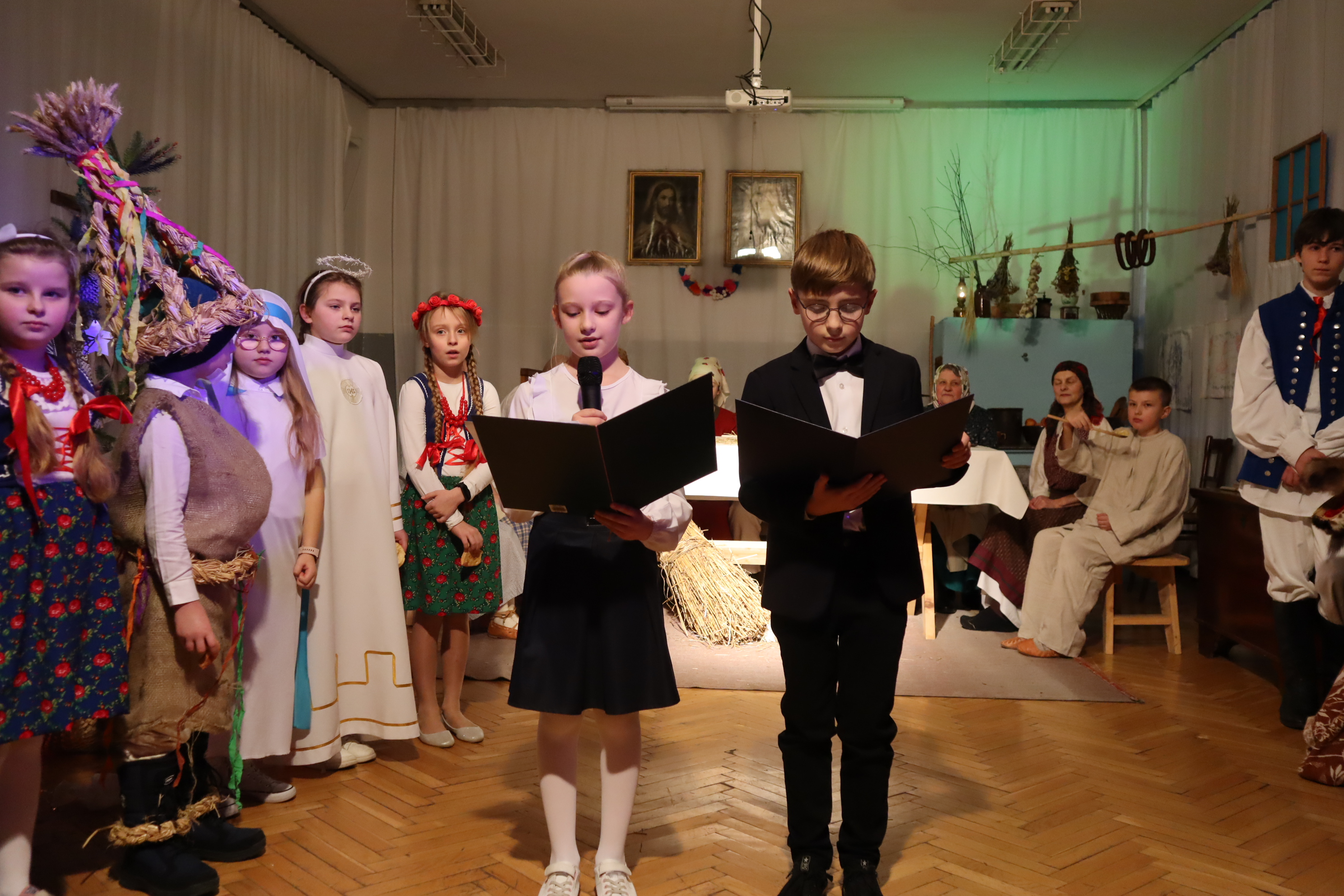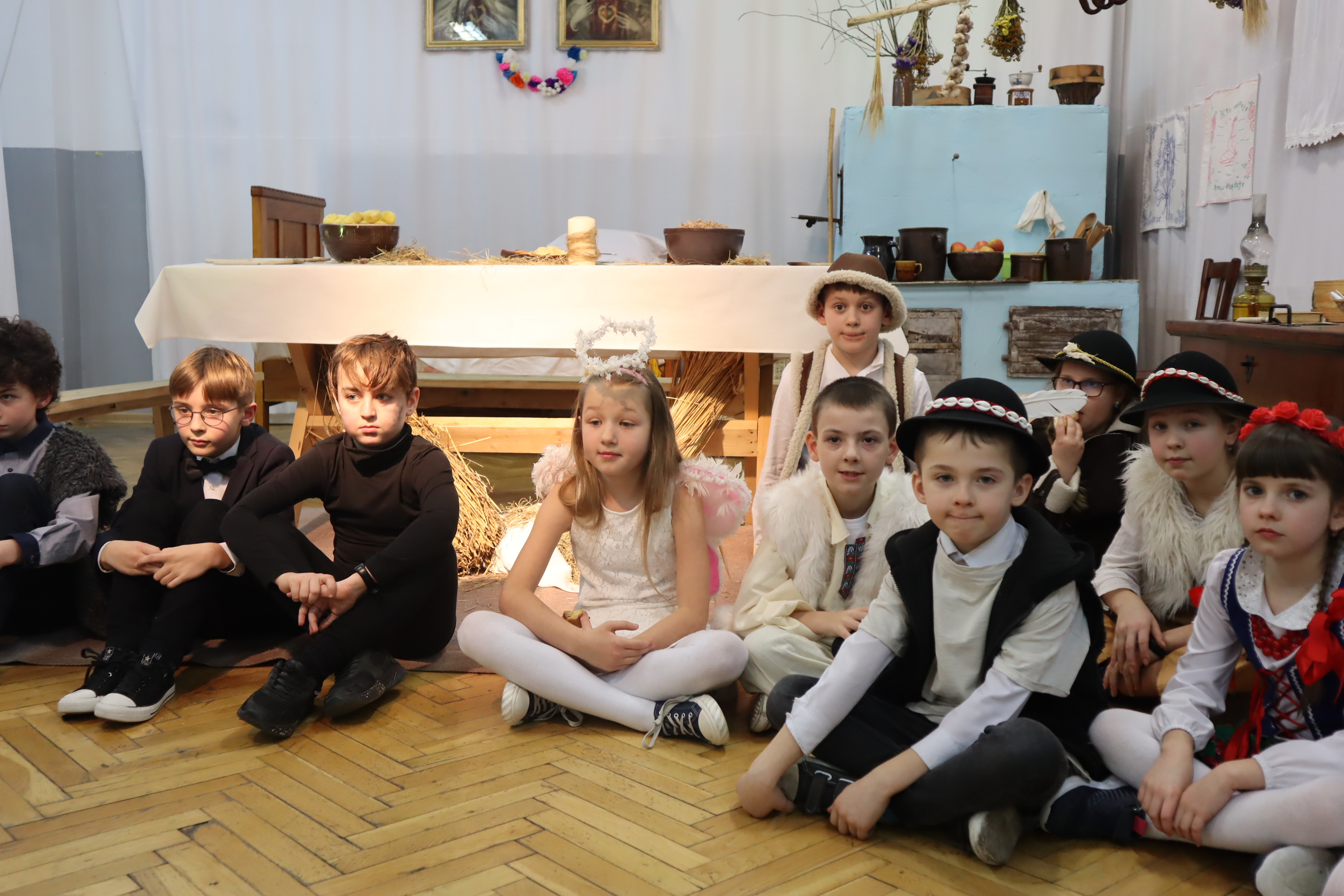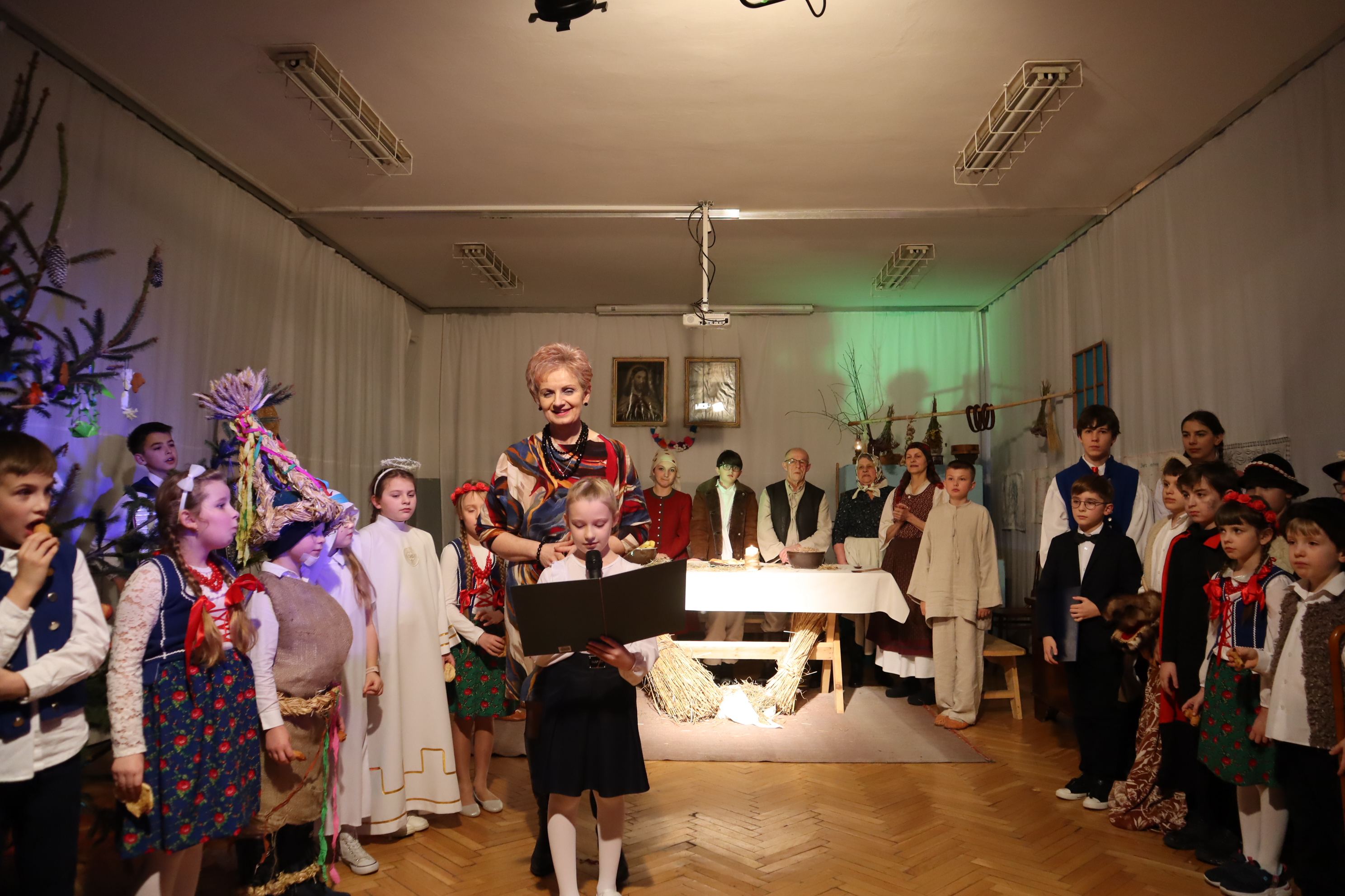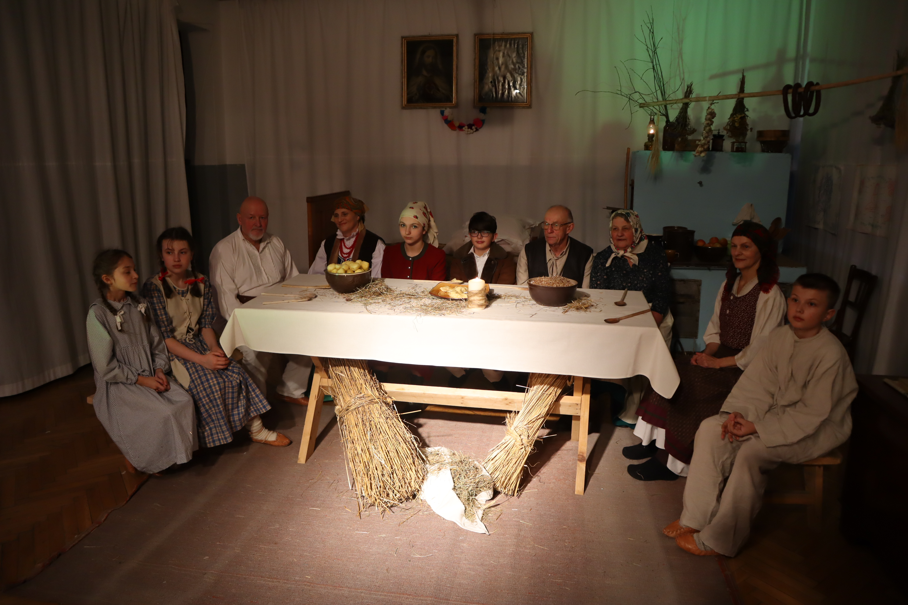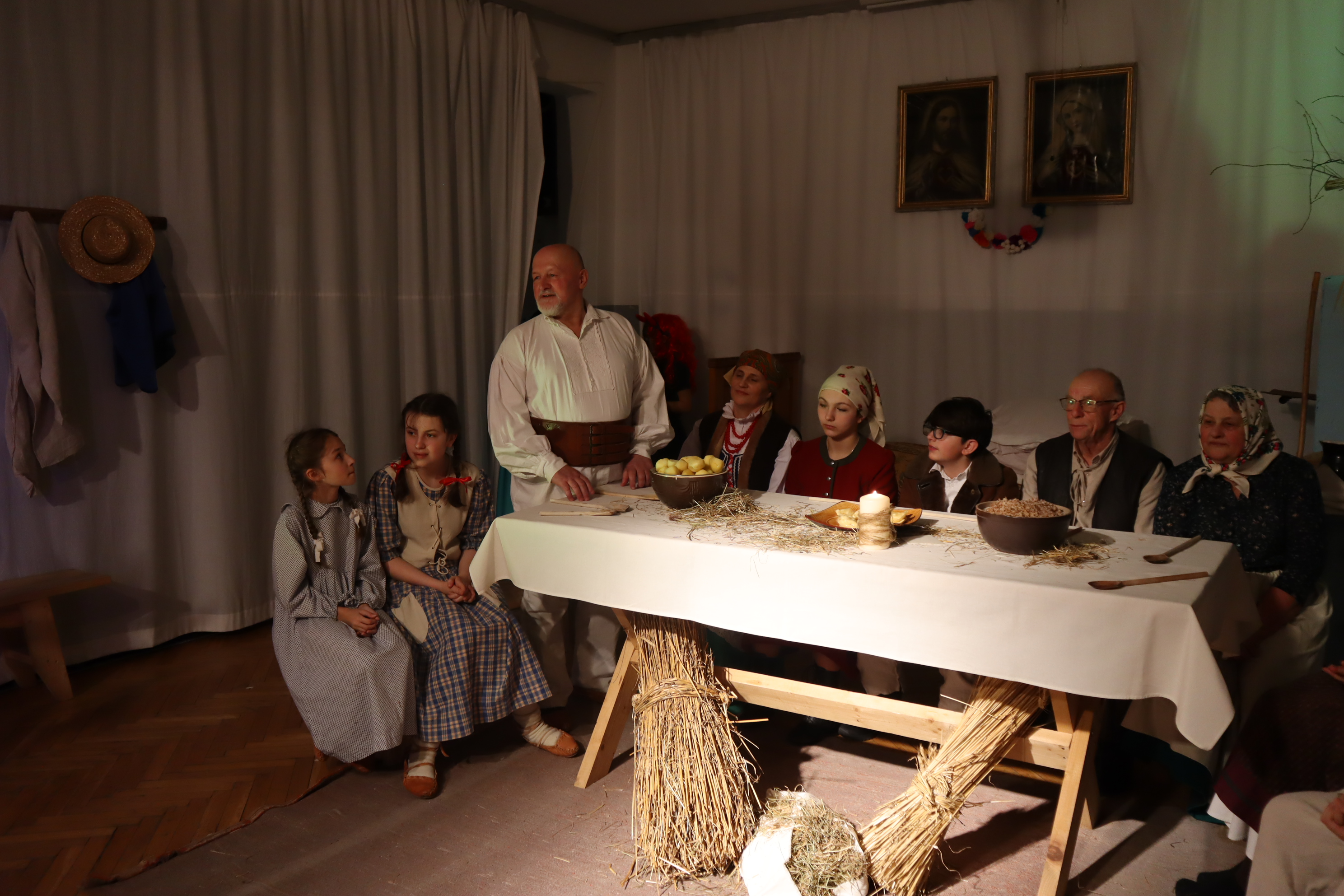 Następnie w przepięknej scenografii starej, strzeszyńskiej chaty oraz w wyjątkowej atmosferze dzieci wraz z Seniorami i uczniami klas starszych przedstawili ,, Wigilię naszych dziadów”, które to przedstawienie niejednej babci i niejednemu dziadkowi przypomniało lata dzieciństwa oraz młodości, a także stare tradycje naszego regionu, dotyczące przygotowań i przeżywania okresu bożonarodzeniowego.