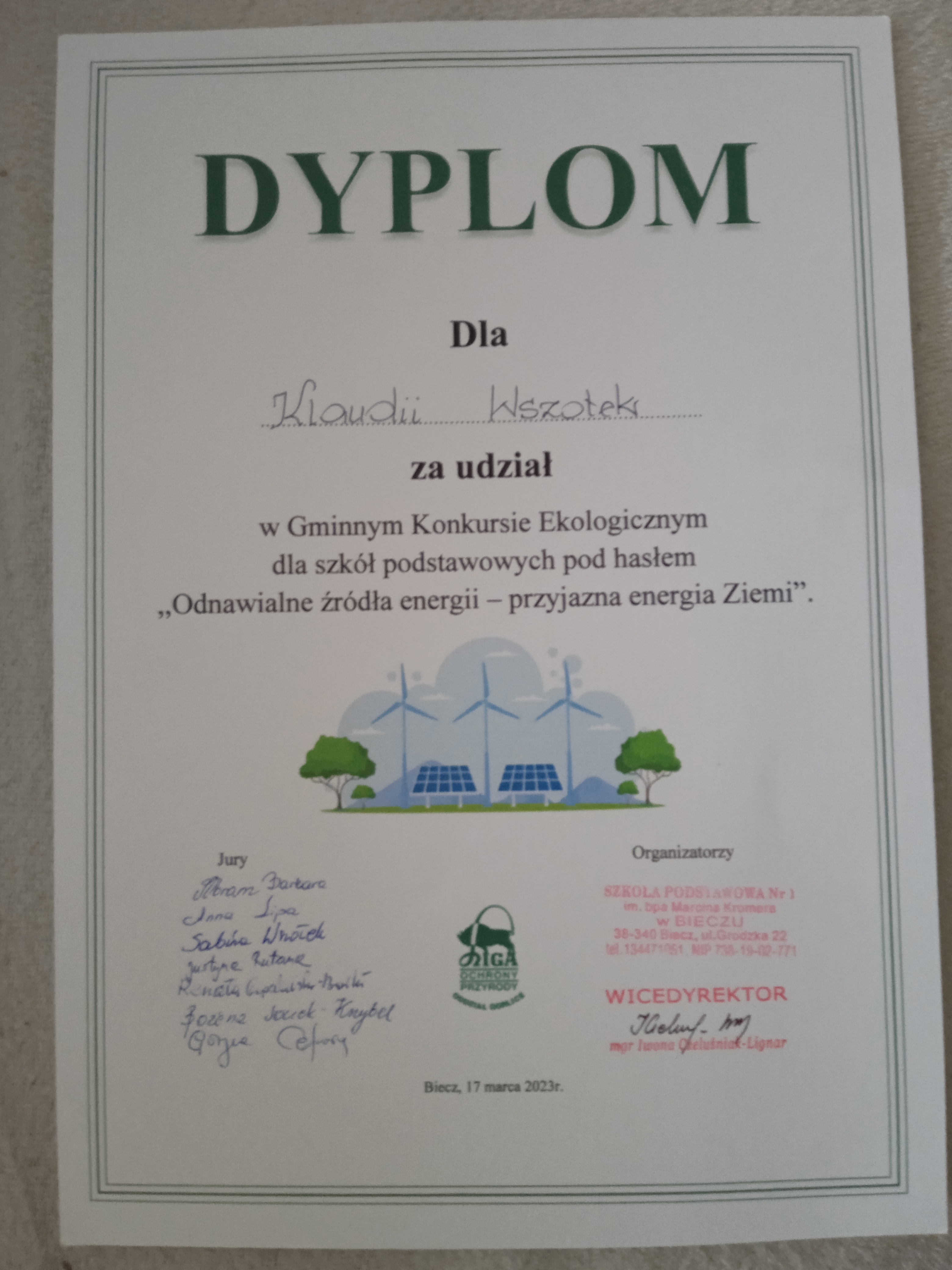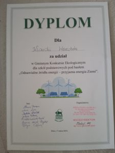 17 marca 2023 roku uczniowie naszej szkoły wzięli udział w Gminnym Konkursie Ekologicznym pod hasłem ,,Odnawialne źródła energii – przyjazna energia Ziemi”. Organizatorem konkursu była Szkoła Podstawowa nr1 w Bieczu we współpracy z Nadleśnictwem Gorlice oraz Ligą Ochrony Przyrody – Odział Gorlice.