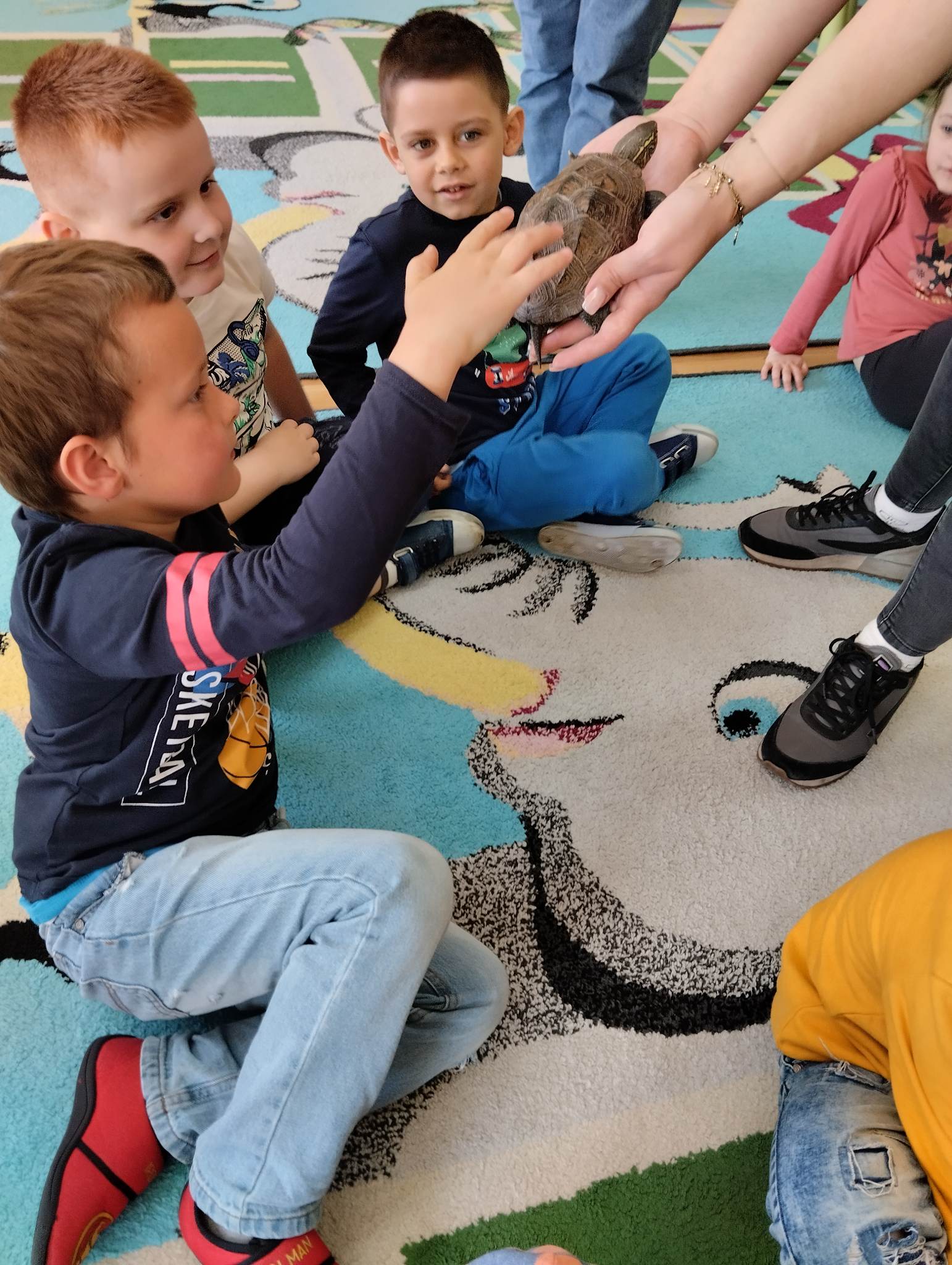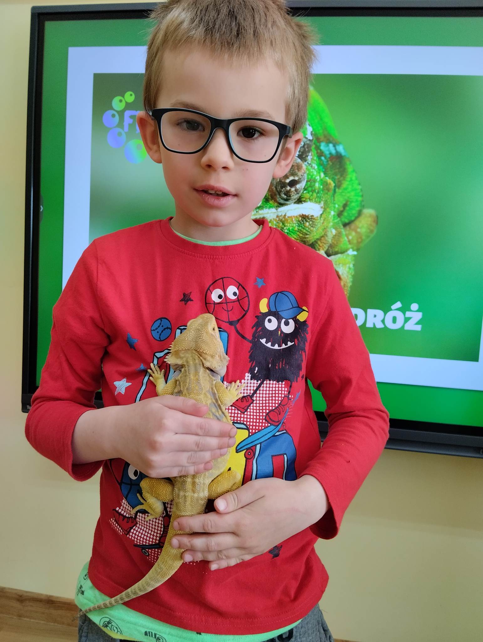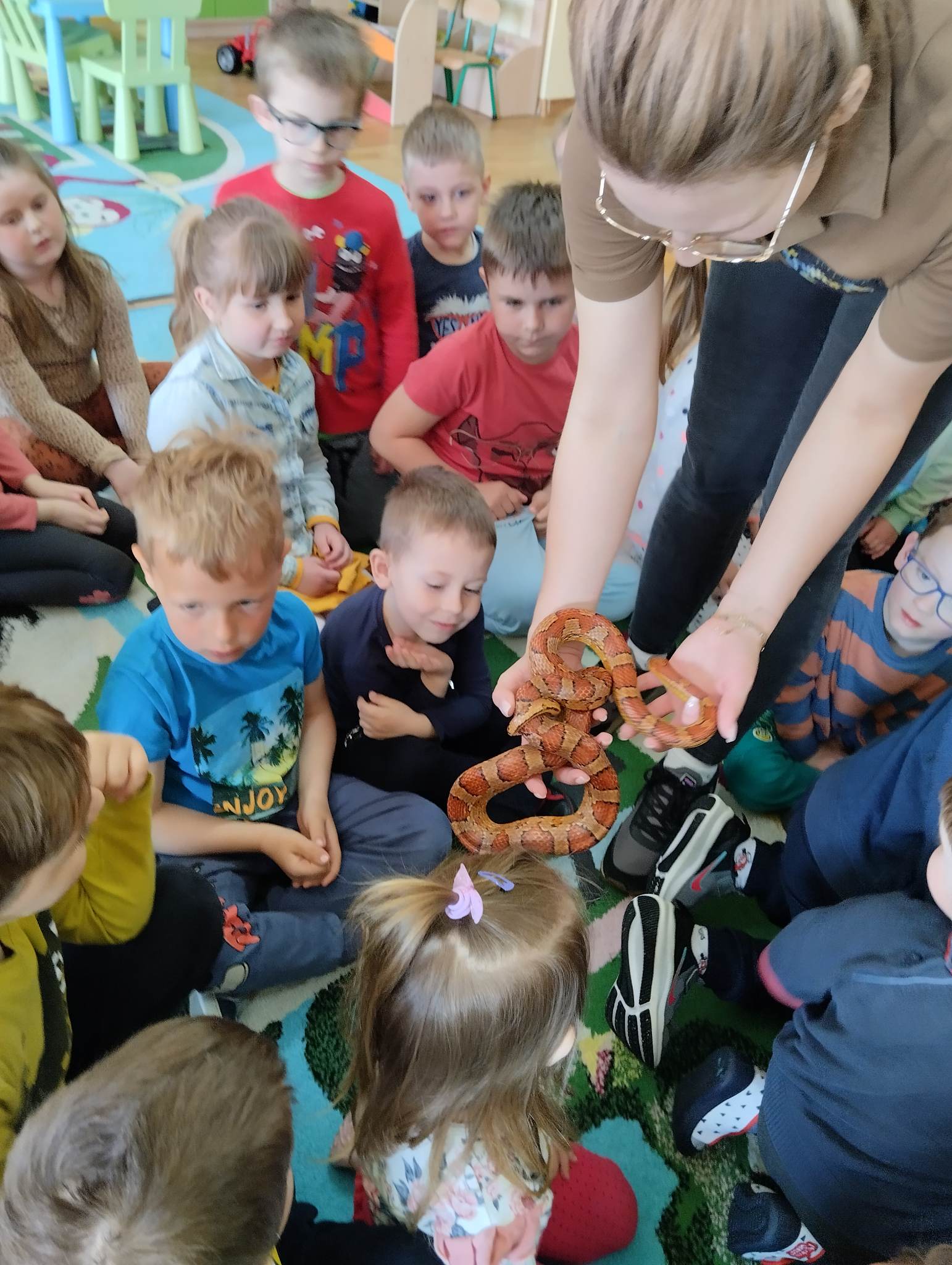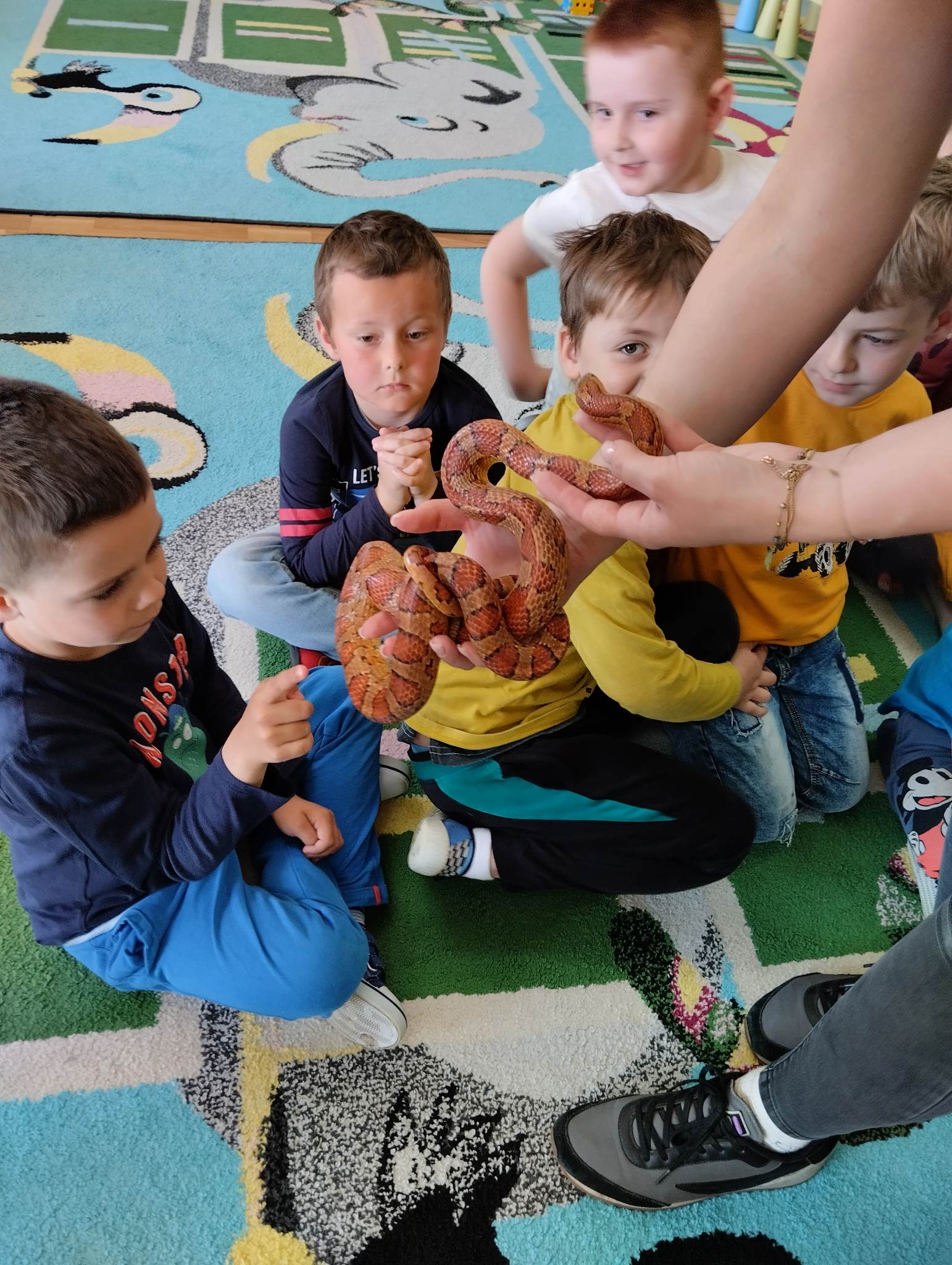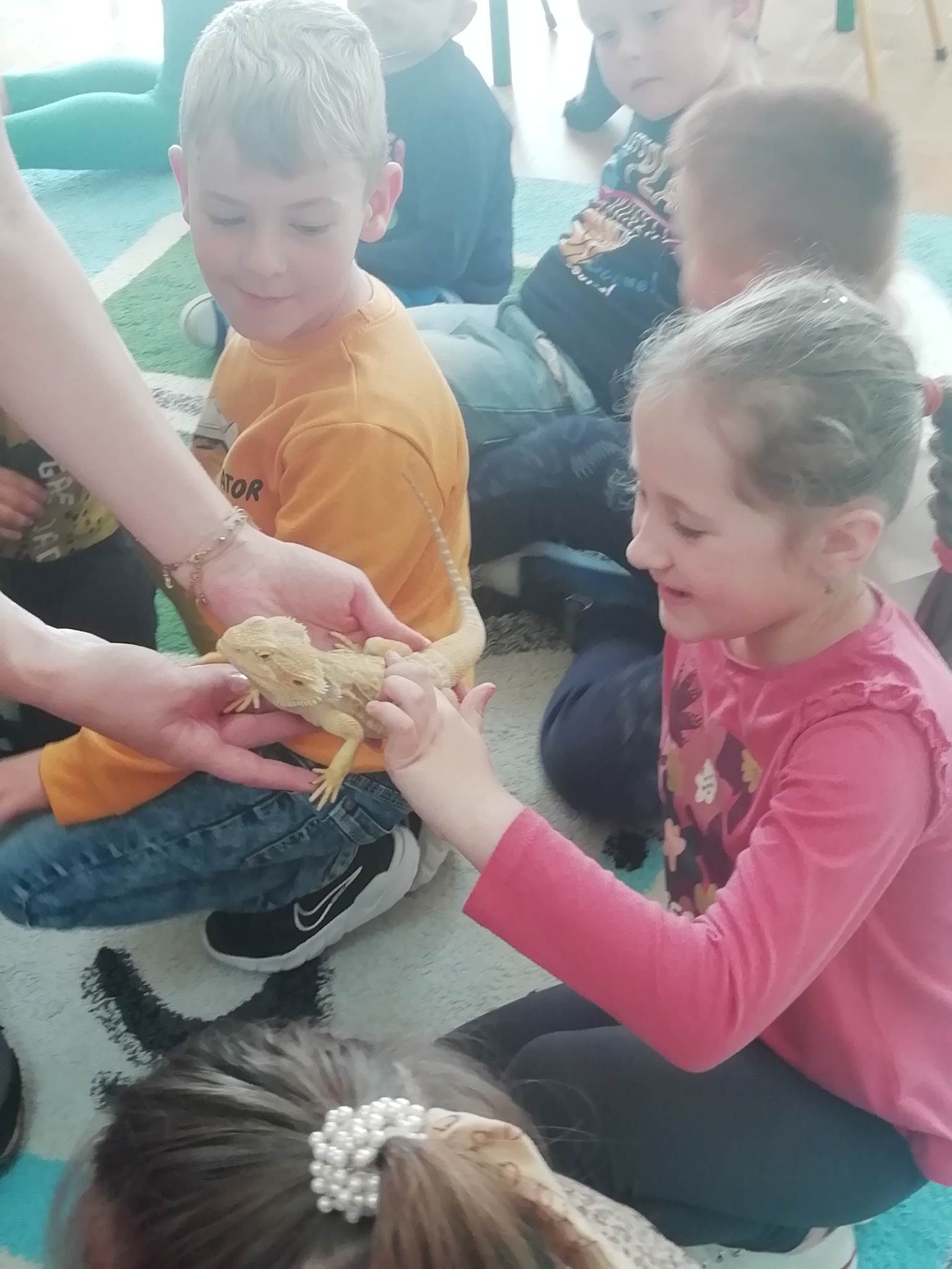 12 maja 2023 r. w przedszkolu odbyły się warsztaty egzotyczne. Animatorka zabrała naszych przedszkolaków w egzotyczną podróż samolotem w najdalsze zakątki świata. Na każdym z przystanków dzieci poznawały warunki klimatyczne, w jakich żyją zwierzęta, czym się żywią i jakie mają zwyczaje. Podróż rozpoczęła się wylądowaniem w Australii, gdzie żyje agama brodata, która oczarowała wszystkich swoim zachowaniem. Na kolejnych kontynentach dzieci poznały węża zbożowego, krocionoga, gekona lamparciego, ślimaka afrykańskiego oraz żółwia chińskiego. Wszystkie te zwierzęta mogły zobaczyć na żywo i dotknąć. Na koniec zostały wykonane indywidualne, pamiątkowe zdjęcia z jaszczurką – agamą brodatą. Warsztaty egzotyczne to niecodzienna atrakcja, dzięki której świat zwierząt egzotycznych mógł zostać w rzeczywisty sposób pokazany przedszkolakom. To była ekscytująca podróż.
