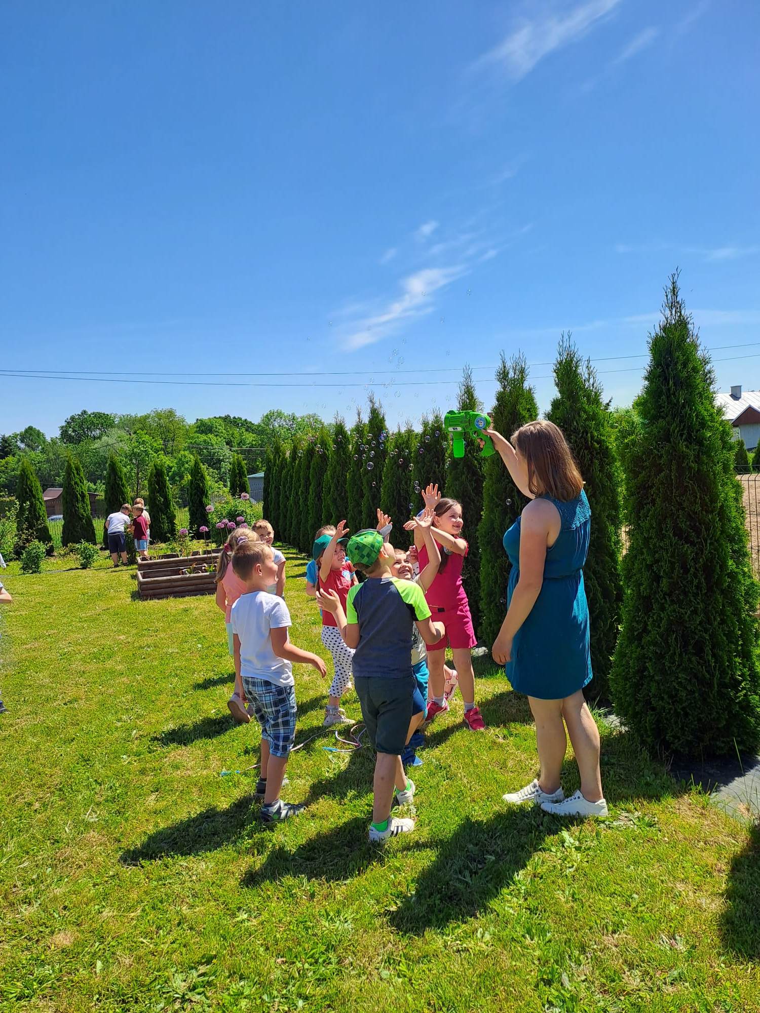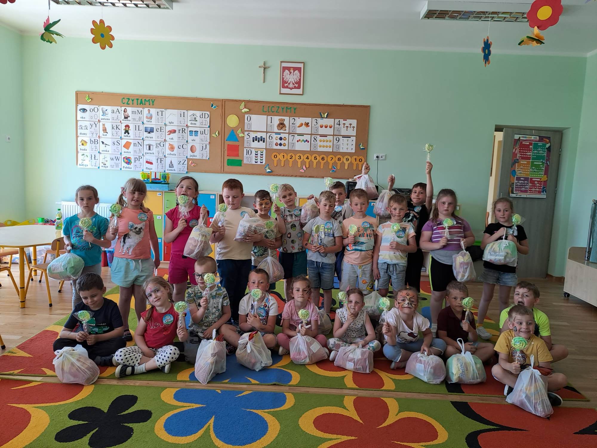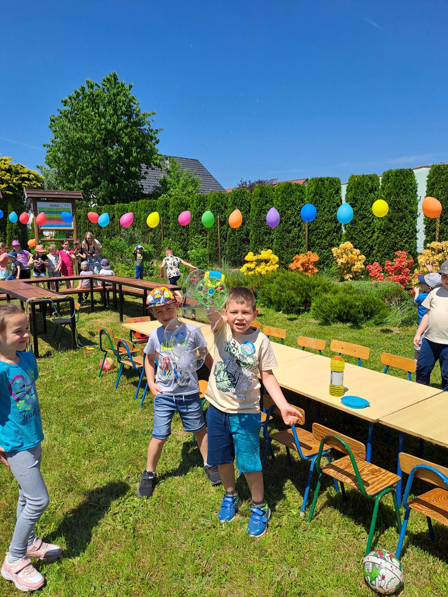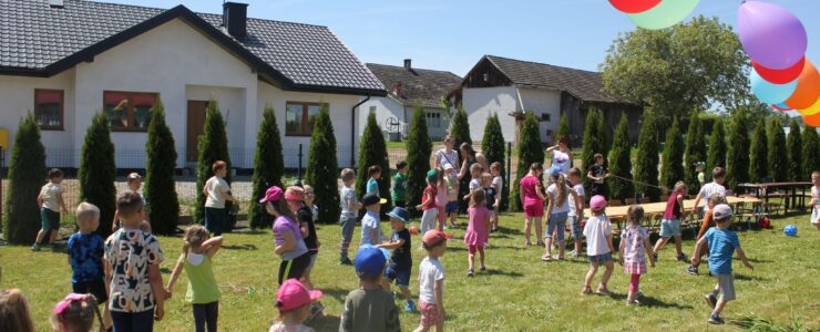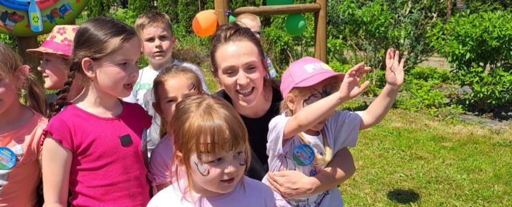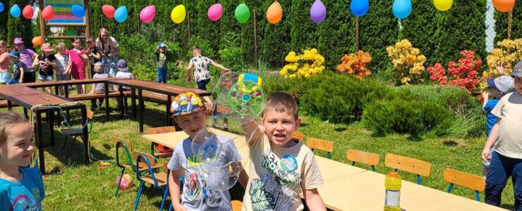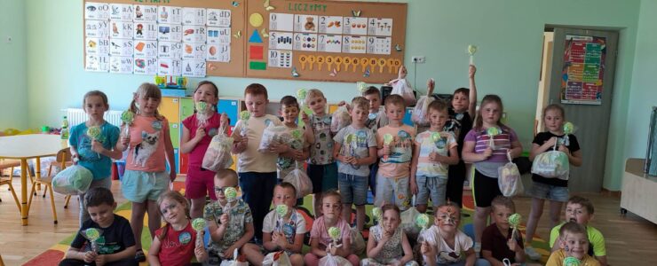 Dzień Dziecka to święto ,które uwielbiają wszystkie dzieci , te małe i te duże. To dzień pełen uśmiechów, zabaw, niespodzianek, radości i wielu niezapomnianych wrażeń. Świętowanie każda grupa rozpoczęła w swojej sali, a później odbyło się wspólne oglądanie bajki na dużym ekranie ,,Żółwik Sammy 2”. Po filmie na dzieci czekał słodki poczęstunek , lody i pięknie przystrojony balonami ogród sensoryczny. Były bańki mydlane, zabawy piłeczkami, malowanie twarzy, robienie tatuaży, zabawy przy muzyce. Nie zabrakło czasu na odpoczynek podczas, którego dzieci miały kiełbaski z grilla i herbatę. Odchodząc do domu otrzymały piękne kolorowe marcepanowe lizaki wykonane przez jedną mamę . Czas upłynął radośnie i beztrosko.