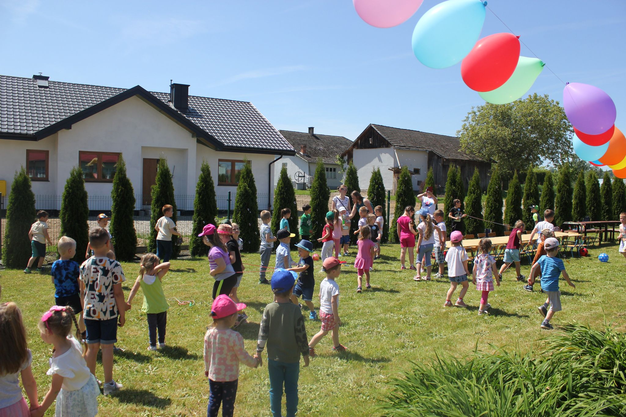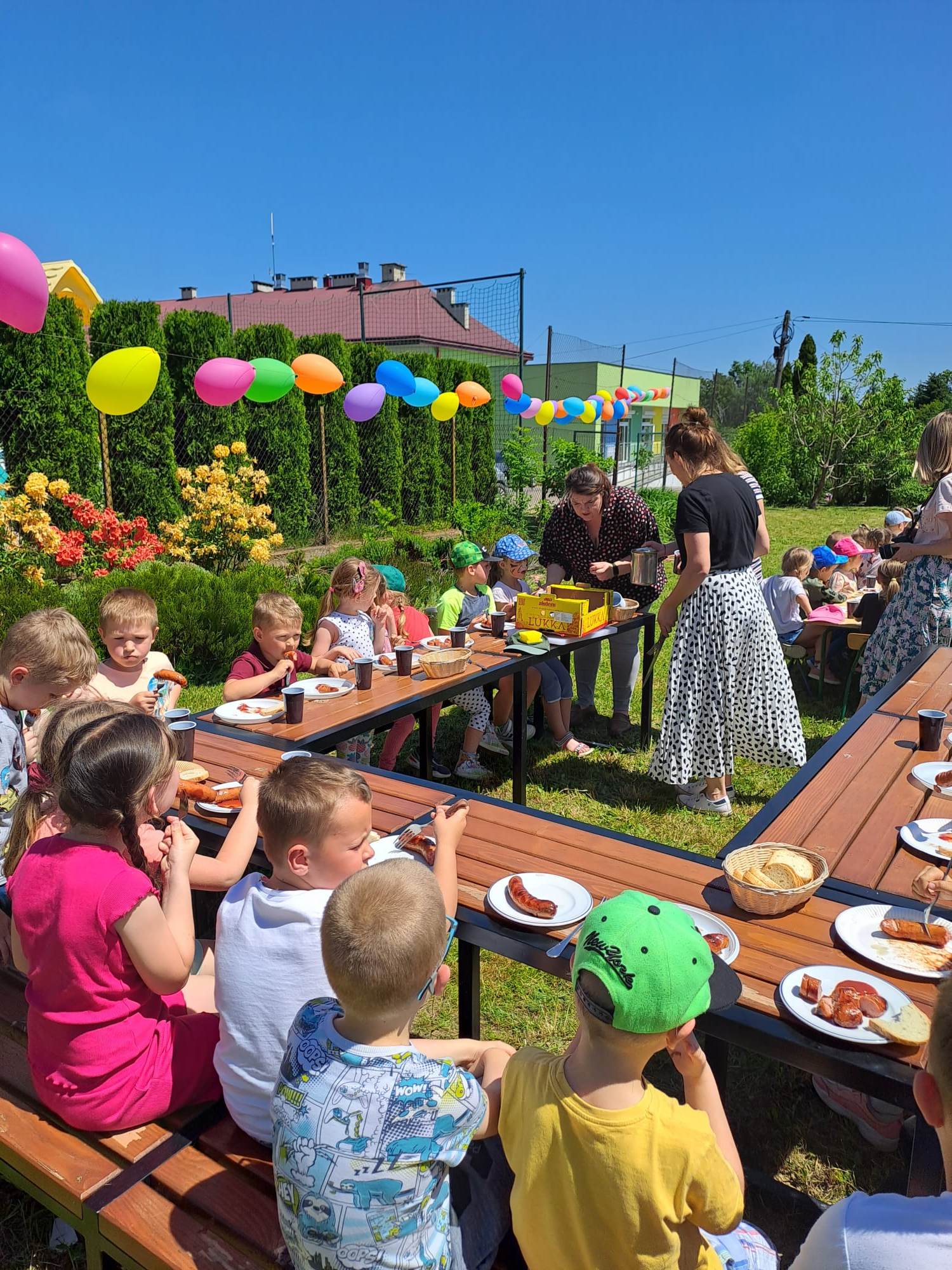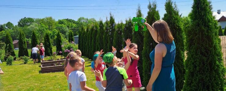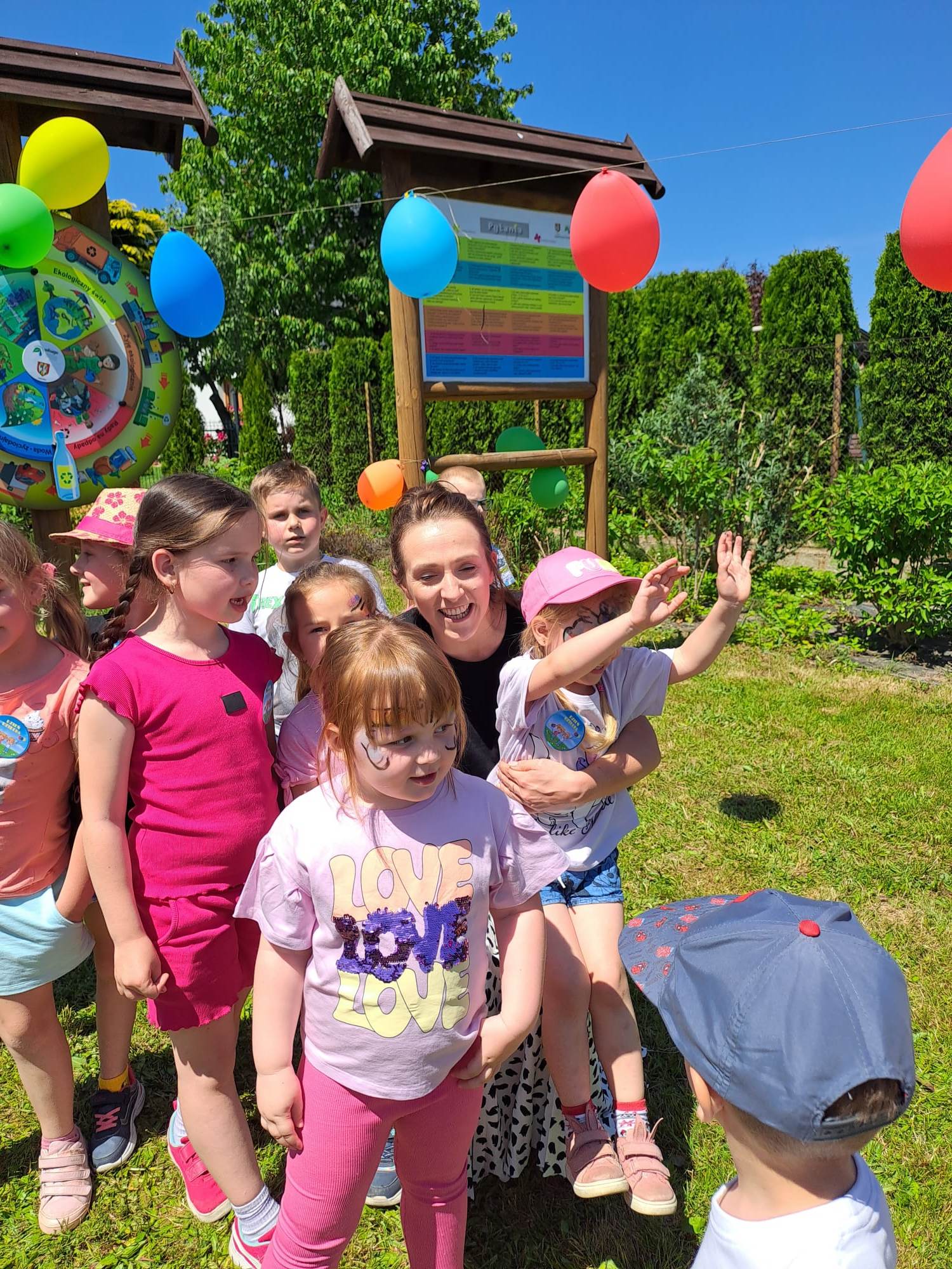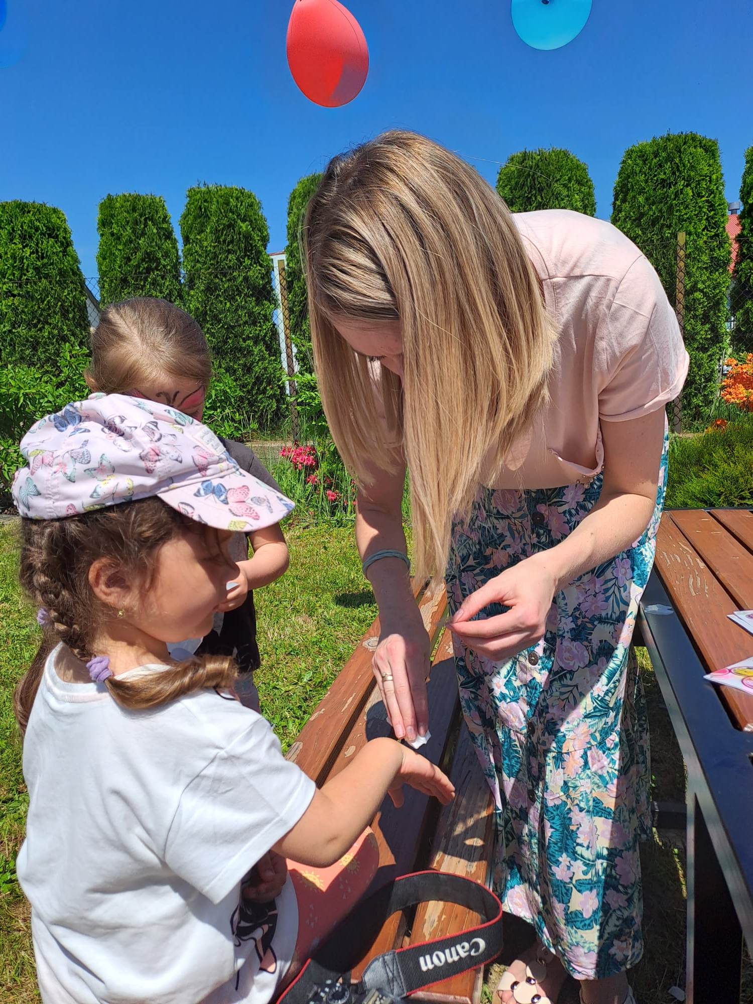 Dzień Dziecka to święto ,które uwielbiają wszystkie dzieci , te małe i te duże. To dzień pełen uśmiechów, zabaw, niespodzianek, radości i wielu niezapomnianych wrażeń. Świętowanie każda grupa rozpoczęła w swojej sali, a później odbyło się wspólne oglądanie bajki na dużym ekranie ,,Żółwik Sammy 2”. Po filmie na dzieci czekał słodki poczęstunek , lody i pięknie przystrojony balonami ogród sensoryczny. Były bańki mydlane, zabawy piłeczkami, malowanie twarzy, robienie tatuaży, zabawy przy muzyce. Nie zabrakło czasu na odpoczynek podczas, którego dzieci miały kiełbaski z grilla i herbatę. Odchodząc do domu otrzymały piękne kolorowe marcepanowe lizaki wykonane przez jedną mamę . Czas upłynął radośnie i beztrosko.