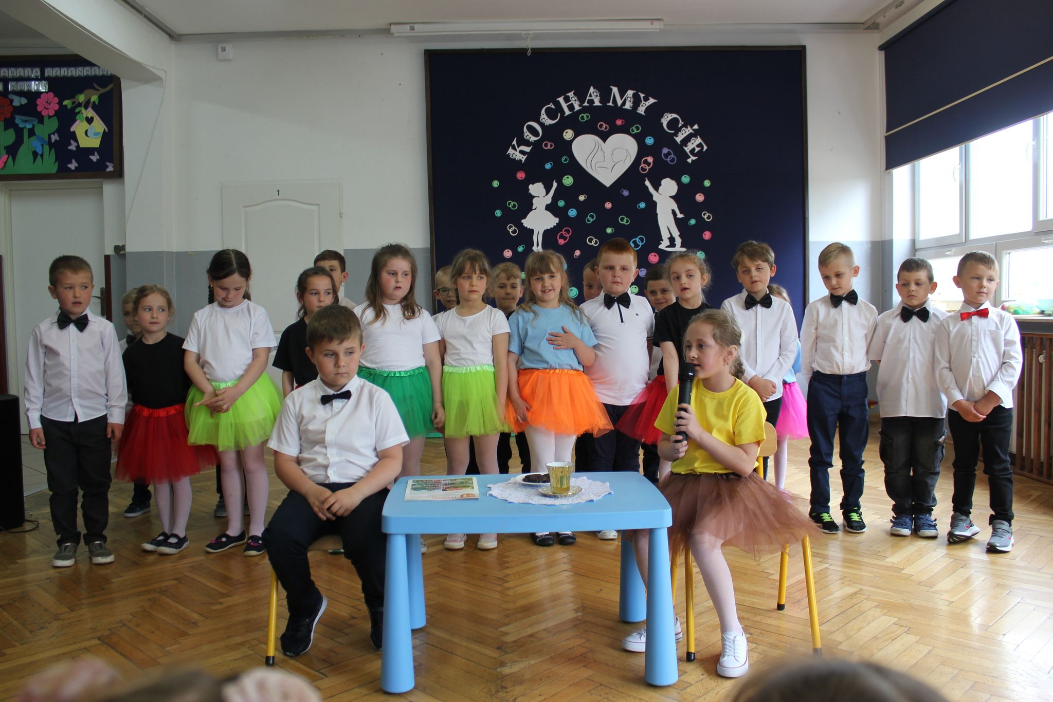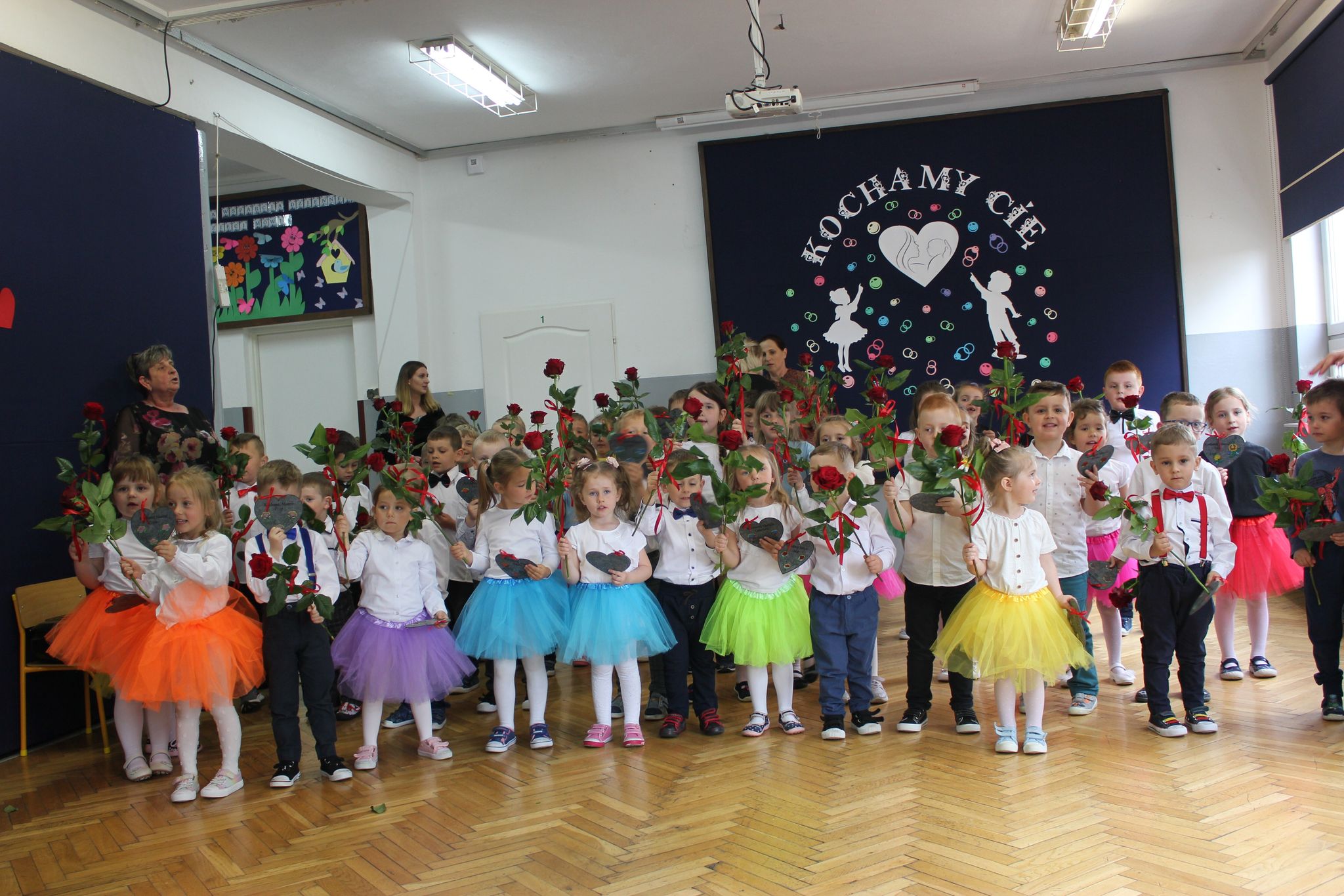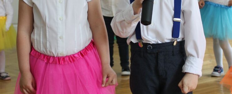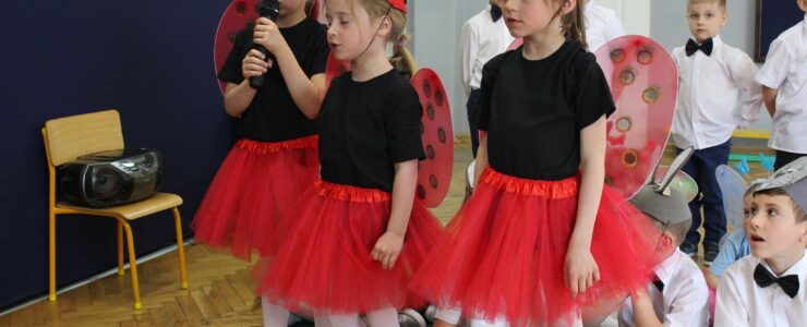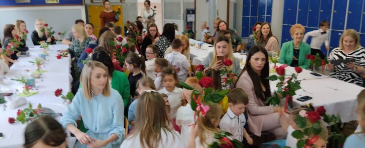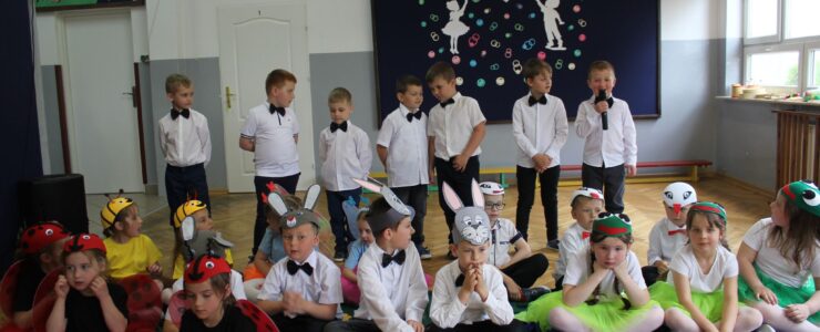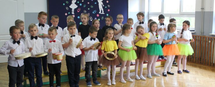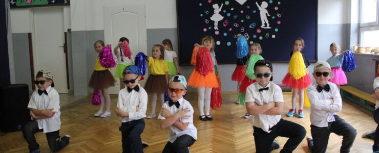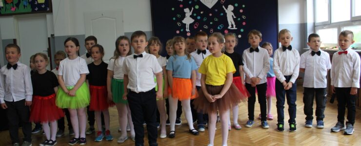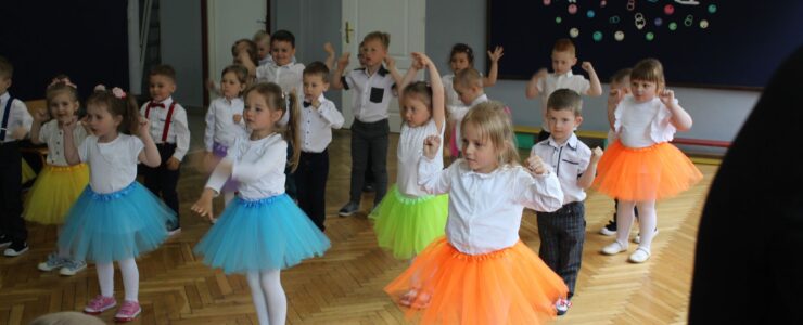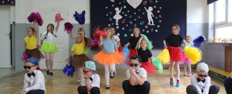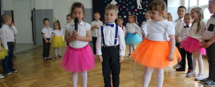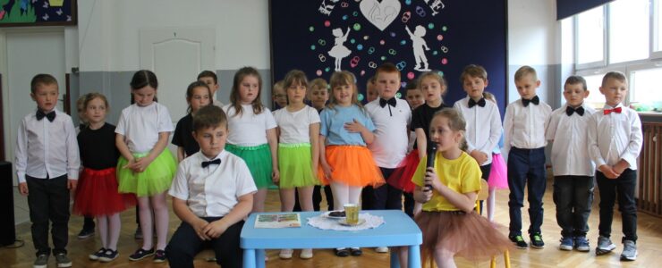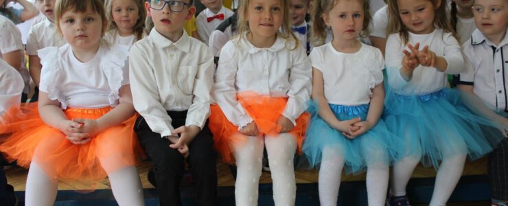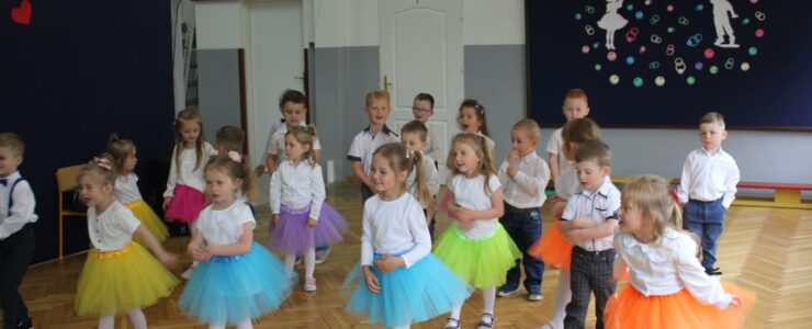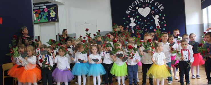 ,,Kocham Cię Mamo ”- słowa te były myślą przewodnią uroczystości, która odbyła się 25 maja 2023r. Dzień ten ważny jest dla każdego człowieka, dlatego dołożyliśmy wszelkich starań , aby stał się wyjątkowy. Mamy z uwagą i wzruszeniem wysłuchały części artystycznej wykonanej przez dzieci . Sala stała się łąką , na której przedszkolaki w pięknych strojach zaprezentowały inscenizację ,,Łąka dla Mamy ”oraz ,,Zawody naszych Mam .”Zaśpiewały piosenki ,,Ich liebe dich ”, ,,Orkiestra dla Mamy ”- wykorzystując przy tym instrumenty perkusyjne. Zachwyt wszystkich zgromadzonych wzbudził układ taneczny ,,Smerfny rap ”w wykonaniu grupy 5-6 latków i ,,Bratnie dusze ”w wykonaniu grupy 3-4 latków. Niespodzianką dla dostojnych gości były piękne serca samodzielnie pomalowane przez dzieci i róże, które zostały wręczone po odśpiewaniu tradycyjnego ,,100 LAT ”. Następnie Mamusie zostały zaproszone na kawę i słodki poczęstunek. Atmosfera była podniosła i niezwykle rodzinna.