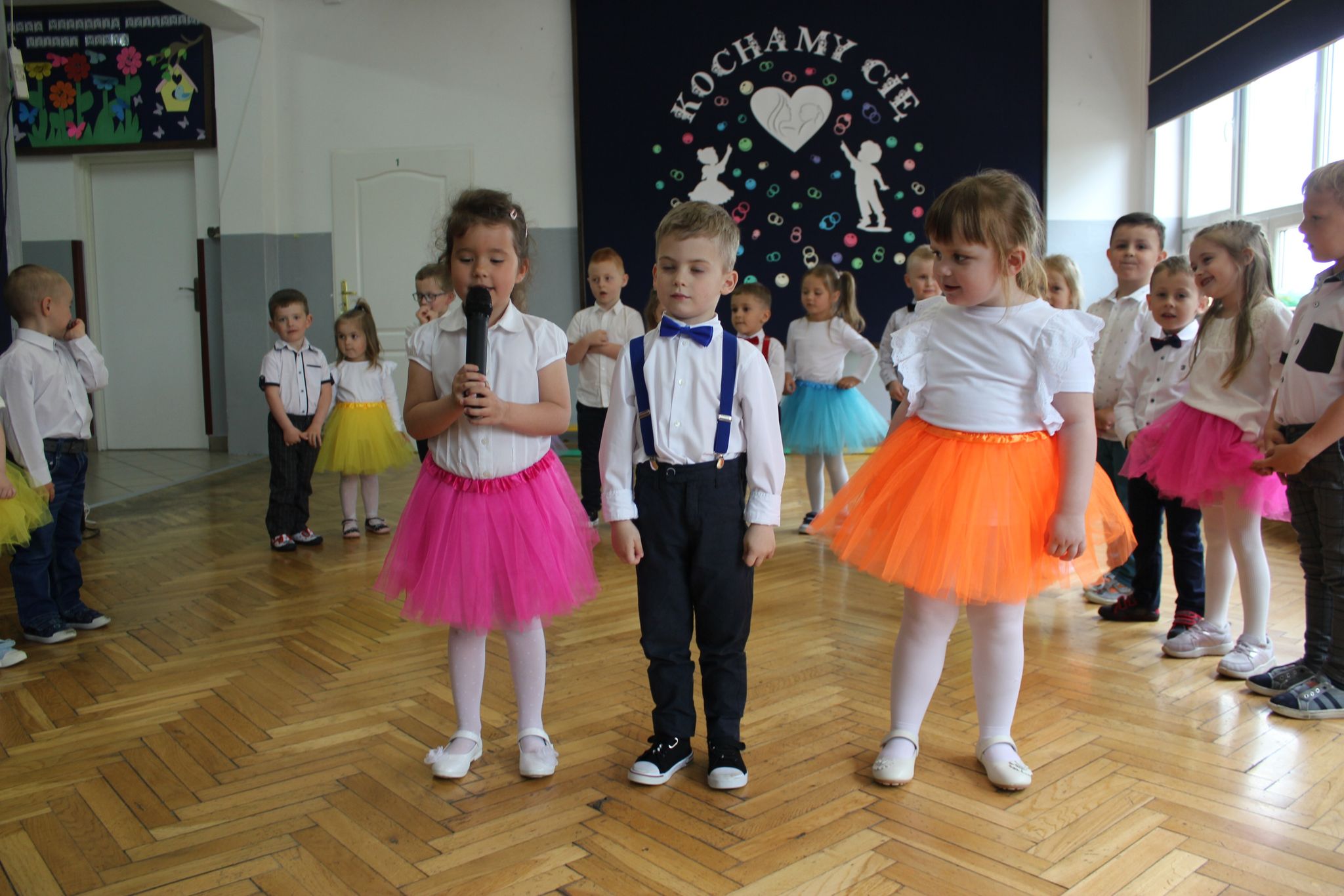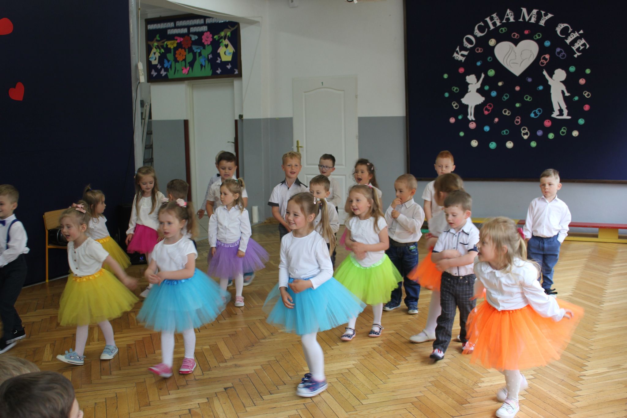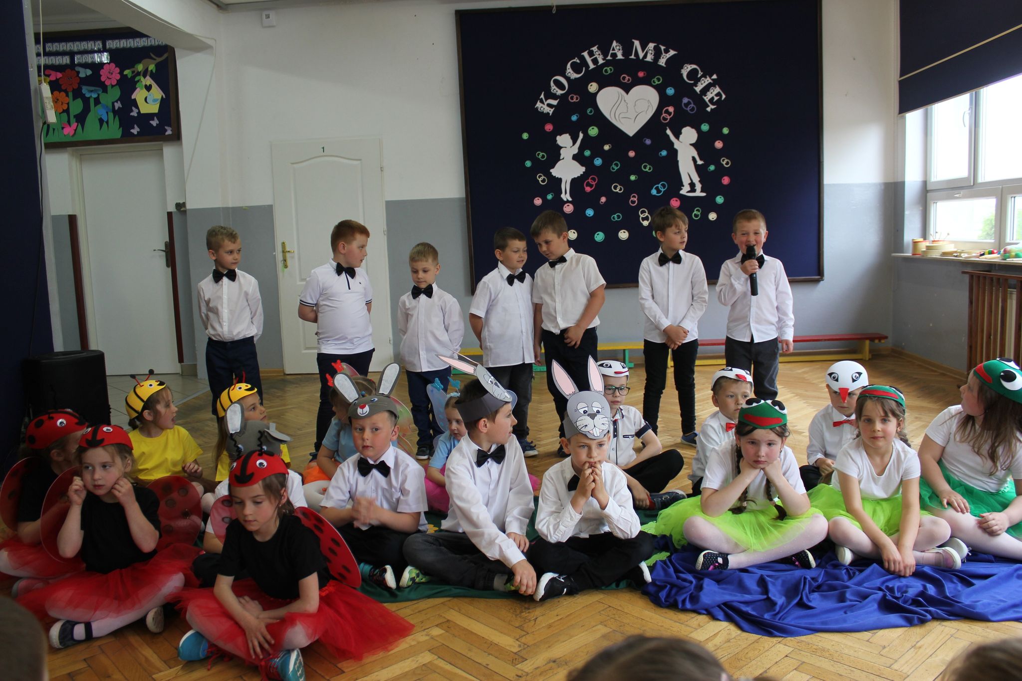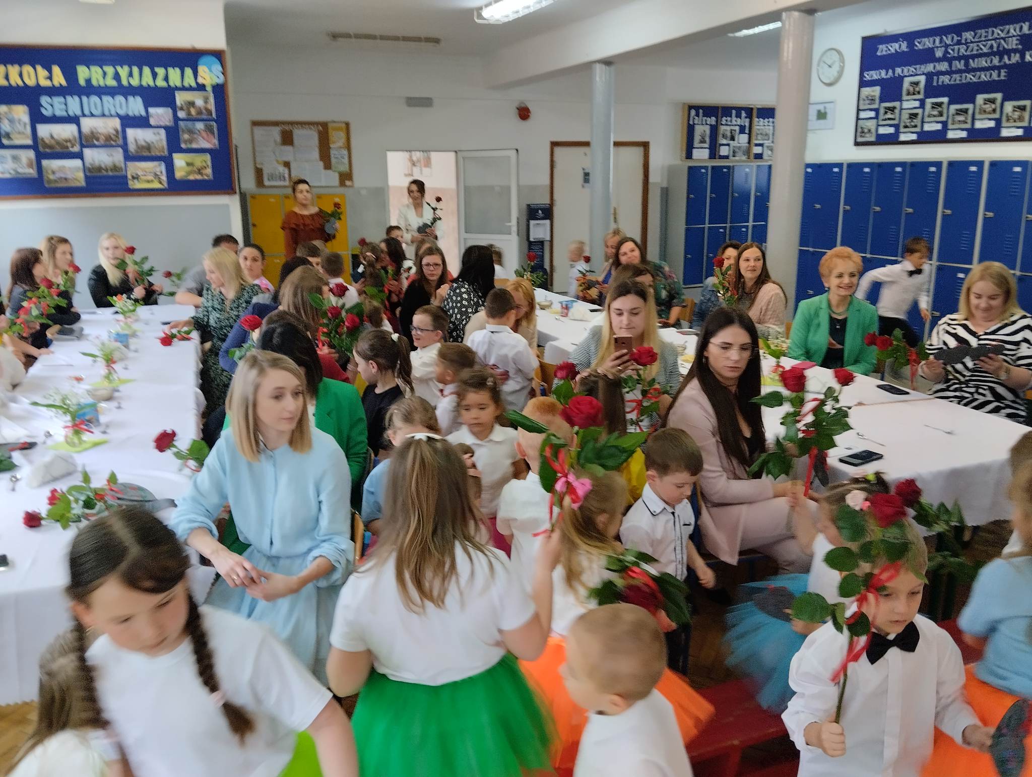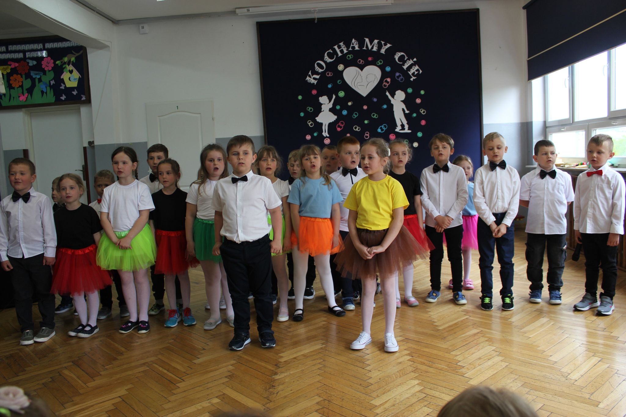 ,,Kocham Cię Mamo ”- słowa te były myślą przewodnią uroczystości, która odbyła się 25 maja 2023r. Dzień ten ważny jest dla każdego człowieka, dlatego dołożyliśmy wszelkich starań , aby stał się wyjątkowy. Mamy z uwagą i wzruszeniem wysłuchały części artystycznej wykonanej przez dzieci . Sala stała się łąką , na której przedszkolaki w pięknych strojach zaprezentowały inscenizację ,,Łąka dla Mamy ”oraz ,,Zawody naszych Mam .”Zaśpiewały piosenki ,,Ich liebe dich ”, ,,Orkiestra dla Mamy ”- wykorzystując przy tym instrumenty perkusyjne. Zachwyt wszystkich zgromadzonych wzbudził układ taneczny ,,Smerfny rap ”w wykonaniu grupy 5-6 latków i ,,Bratnie dusze ”w wykonaniu grupy 3-4 latków. Niespodzianką dla dostojnych gości były piękne serca samodzielnie pomalowane przez dzieci i róże, które zostały wręczone po odśpiewaniu tradycyjnego ,,100 LAT ”. Następnie Mamusie zostały zaproszone na kawę i słodki poczęstunek. Atmosfera była podniosła i niezwykle rodzinna.