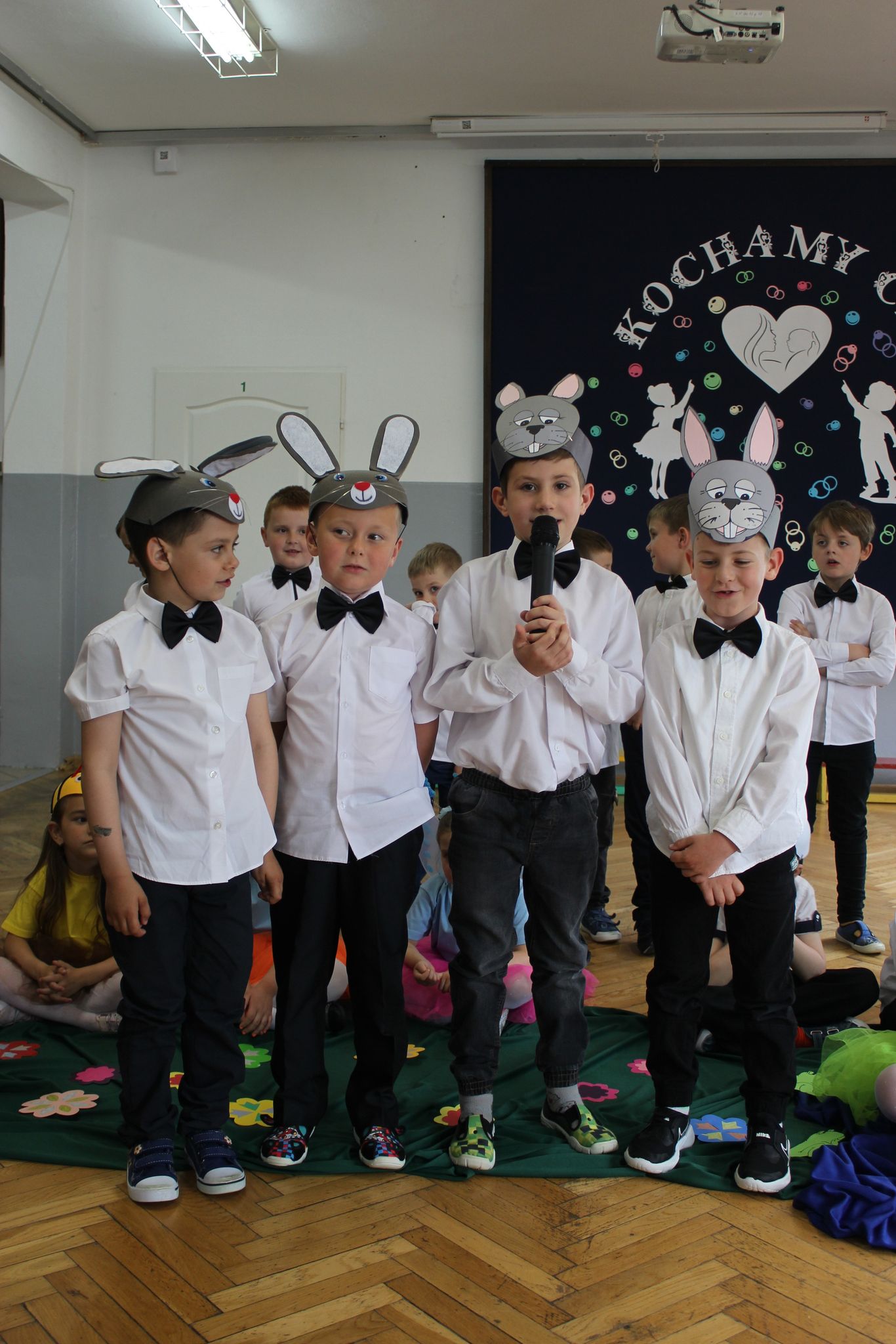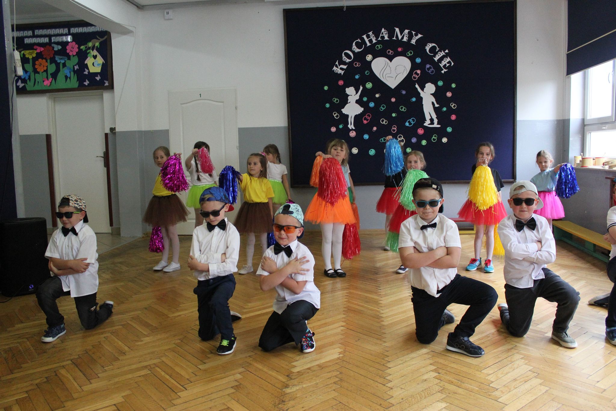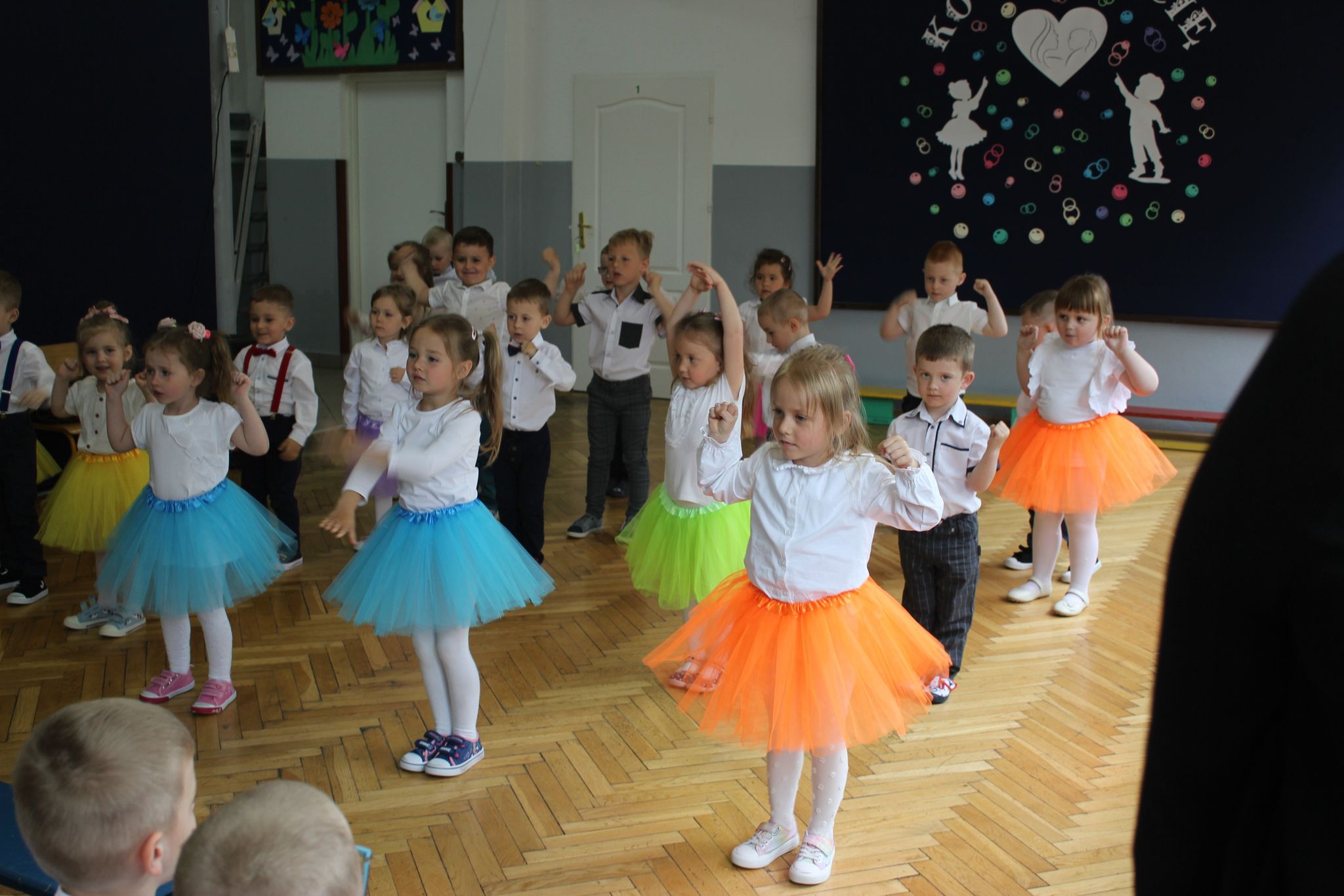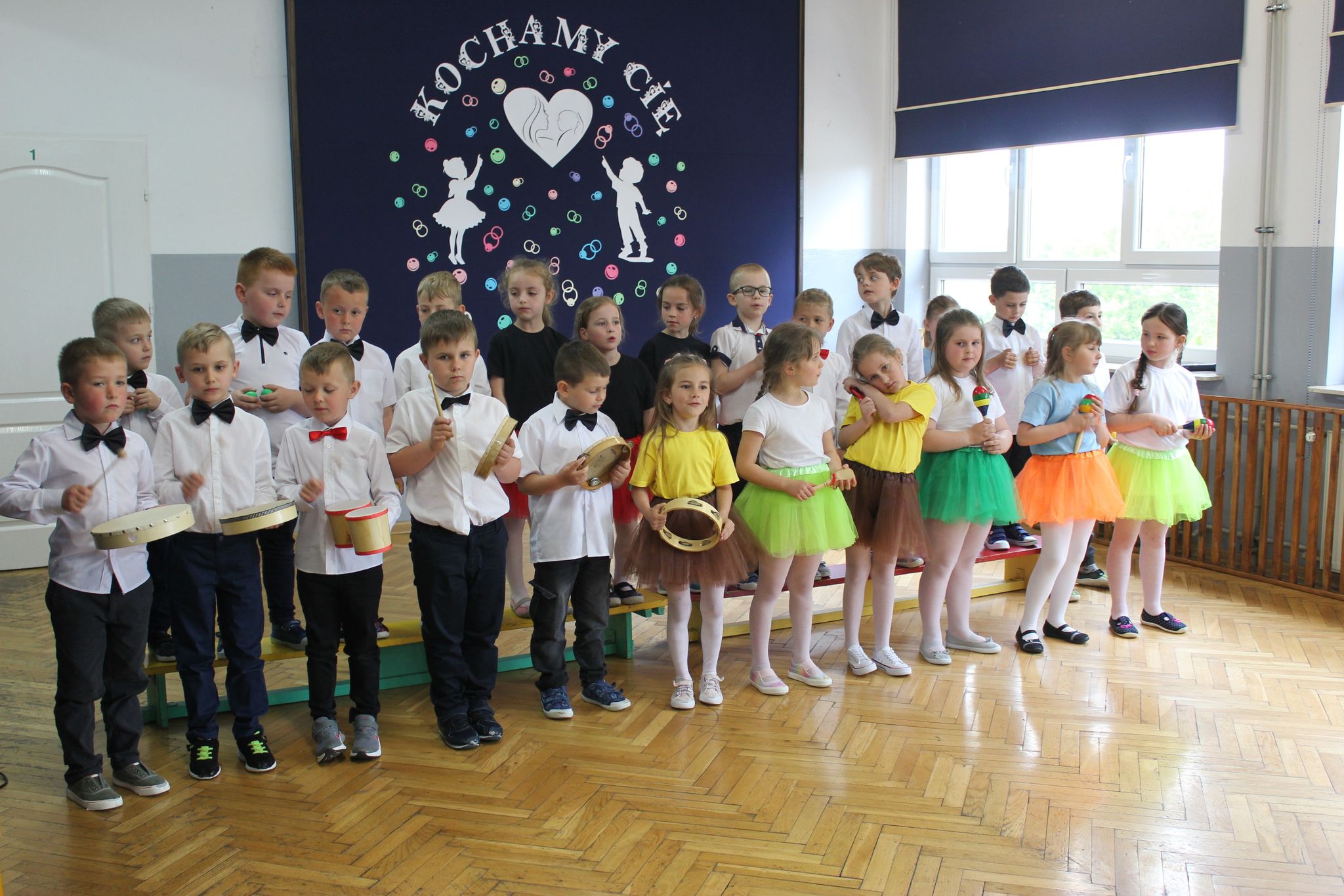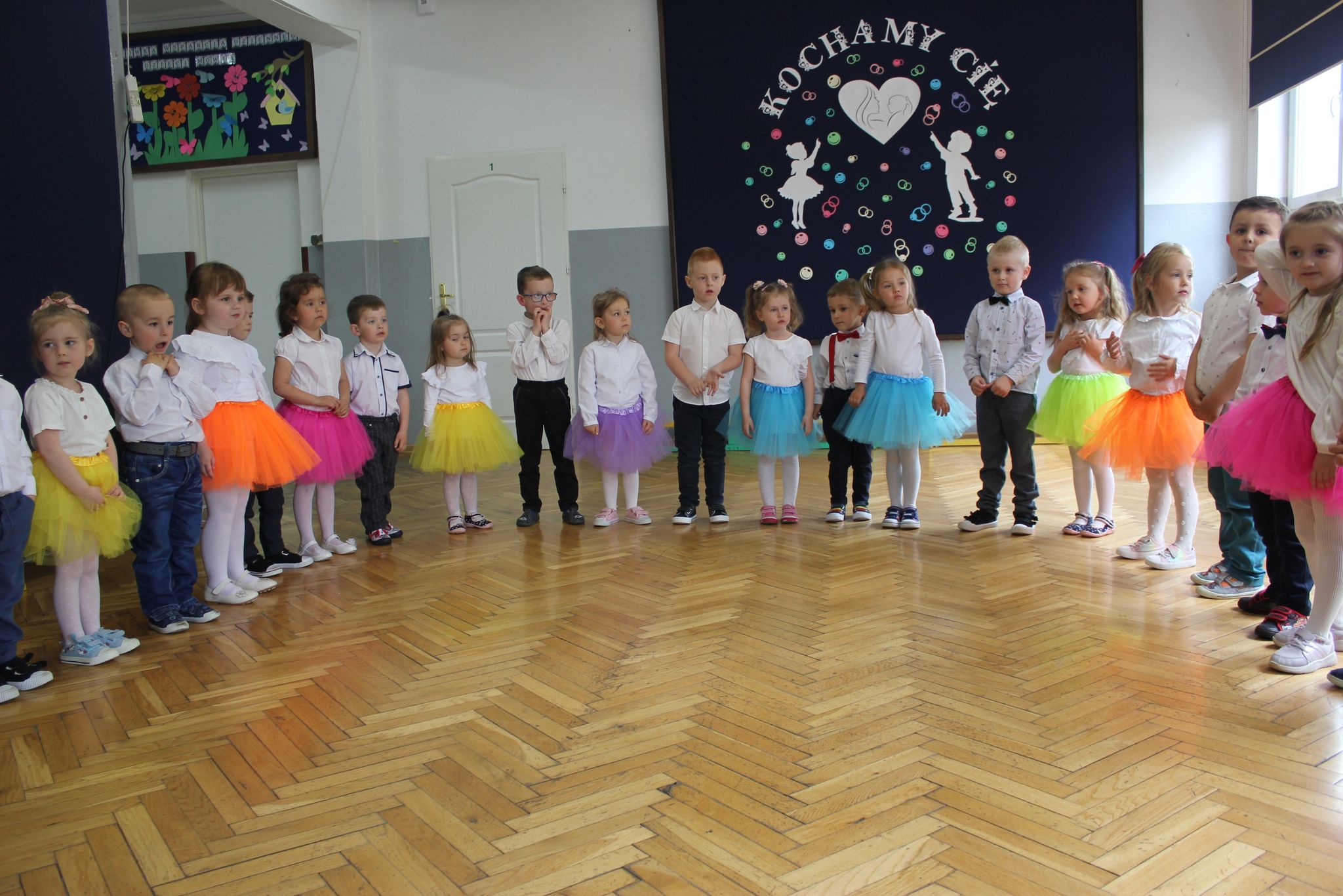 ,,Kocham Cię Mamo ”- słowa te były myślą przewodnią uroczystości, która odbyła się 25 maja 2023r. Dzień ten ważny jest dla każdego człowieka, dlatego dołożyliśmy wszelkich starań , aby stał się wyjątkowy. Mamy z uwagą i wzruszeniem wysłuchały części artystycznej wykonanej przez dzieci . Sala stała się łąką , na której przedszkolaki w pięknych strojach zaprezentowały inscenizację ,,Łąka dla Mamy ”oraz ,,Zawody naszych Mam .”Zaśpiewały piosenki ,,Ich liebe dich ”, ,,Orkiestra dla Mamy ”- wykorzystując przy tym instrumenty perkusyjne. Zachwyt wszystkich zgromadzonych wzbudził układ taneczny ,,Smerfny rap ”w wykonaniu grupy 5-6 latków i ,,Bratnie dusze ”w wykonaniu grupy 3-4 latków. Niespodzianką dla dostojnych gości były piękne serca samodzielnie pomalowane przez dzieci i róże, które zostały wręczone po odśpiewaniu tradycyjnego ,,100 LAT ”. Następnie Mamusie zostały zaproszone na kawę i słodki poczęstunek. Atmosfera była podniosła i niezwykle rodzinna.