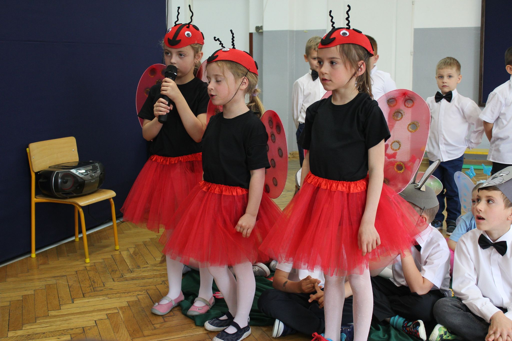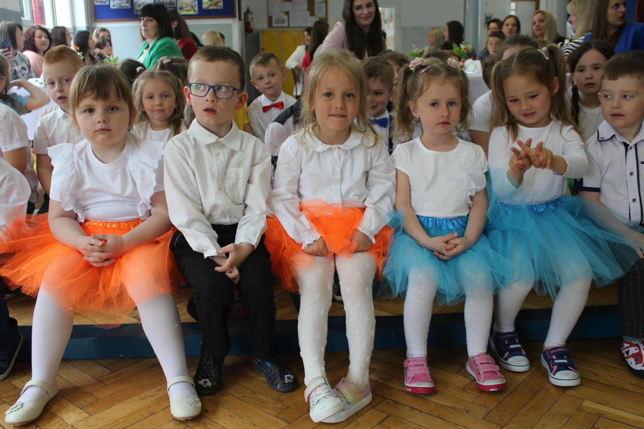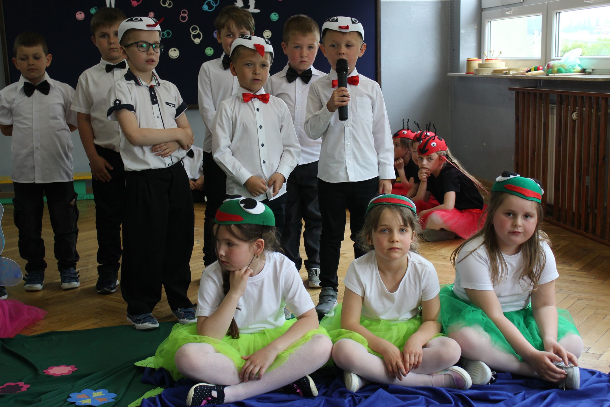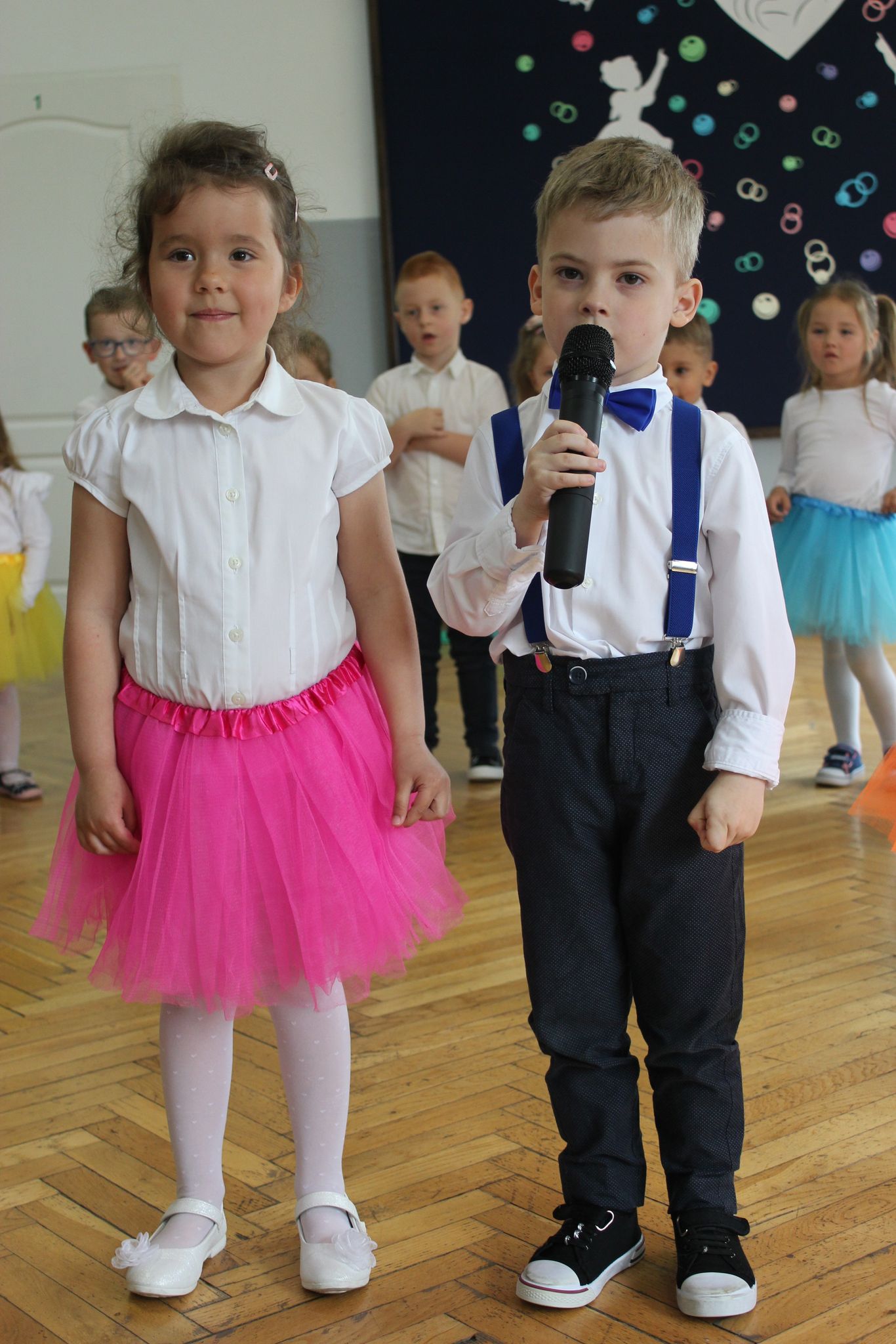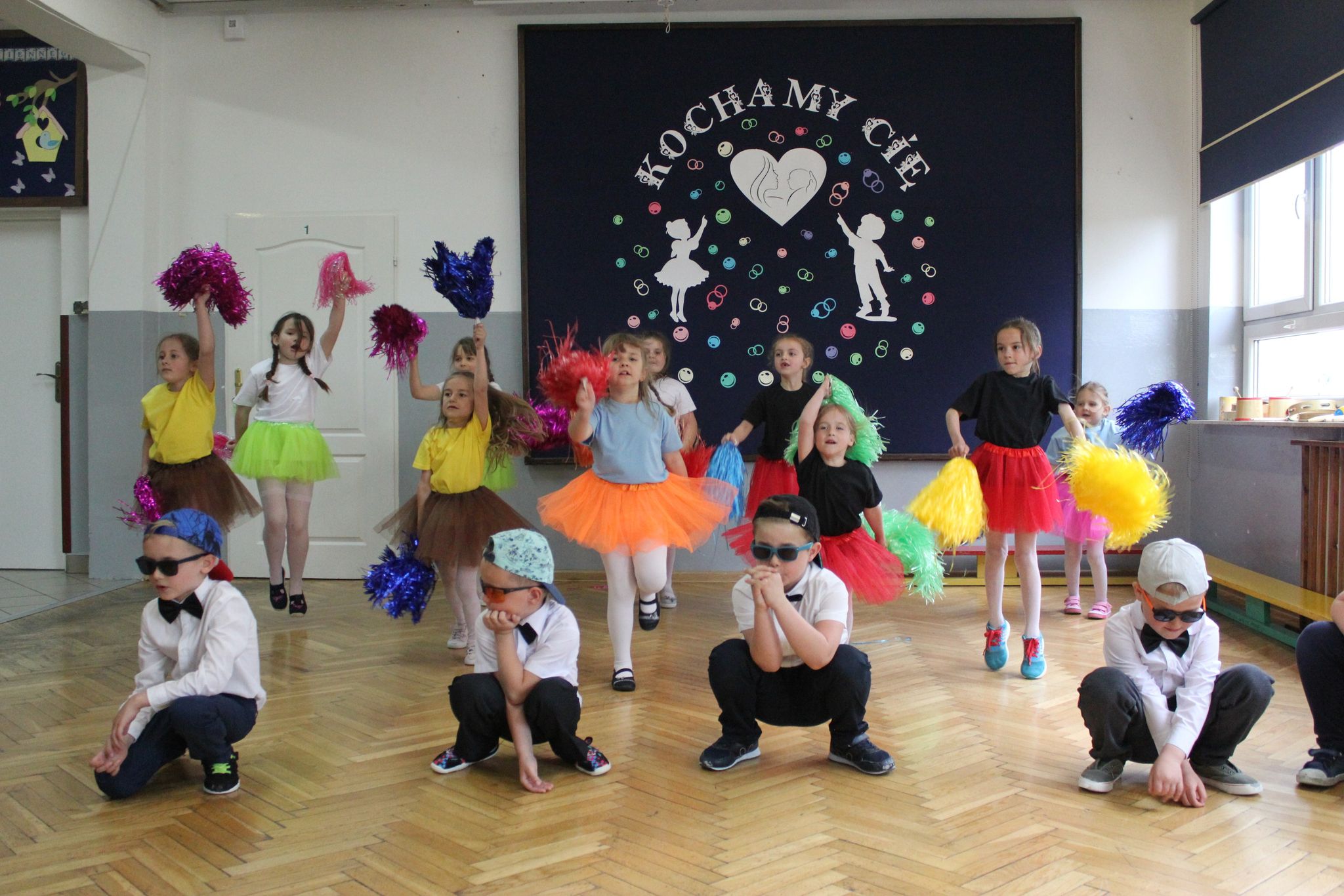 ,,Kocham Cię Mamo ”- słowa te były myślą przewodnią uroczystości, która odbyła się 25 maja 2023r. Dzień ten ważny jest dla każdego człowieka, dlatego dołożyliśmy wszelkich starań , aby stał się wyjątkowy. Mamy z uwagą i wzruszeniem wysłuchały części artystycznej wykonanej przez dzieci . Sala stała się łąką , na której przedszkolaki w pięknych strojach zaprezentowały inscenizację ,,Łąka dla Mamy ”oraz ,,Zawody naszych Mam .”Zaśpiewały piosenki ,,Ich liebe dich ”, ,,Orkiestra dla Mamy ”- wykorzystując przy tym instrumenty perkusyjne. Zachwyt wszystkich zgromadzonych wzbudził układ taneczny ,,Smerfny rap ”w wykonaniu grupy 5-6 latków i ,,Bratnie dusze ”w wykonaniu grupy 3-4 latków. Niespodzianką dla dostojnych gości były piękne serca samodzielnie pomalowane przez dzieci i róże, które zostały wręczone po odśpiewaniu tradycyjnego ,,100 LAT ”. Następnie Mamusie zostały zaproszone na kawę i słodki poczęstunek. Atmosfera była podniosła i niezwykle rodzinna.