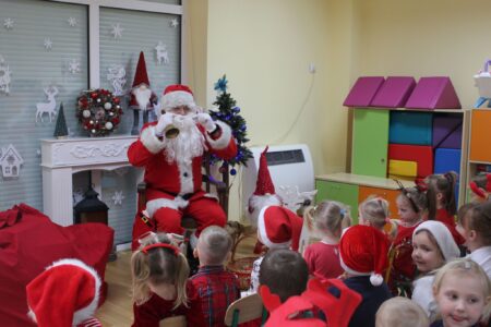 Jak co roku 6 grudnia w naszym przedszkolu odbyło się uroczyste spotkanie ze Świętym Mikołajem. Wszystkie dzieci z niecierpliwością czekały na gościa i od samego rana nasłuchiwały, czy nie słychać dźwięku jego dzwonka. Gdy tylko gość wszedł do sali, na buziach przedszkolaków pojawiły się uśmiechy i radość. Obie grupy nauczyły się piosenek