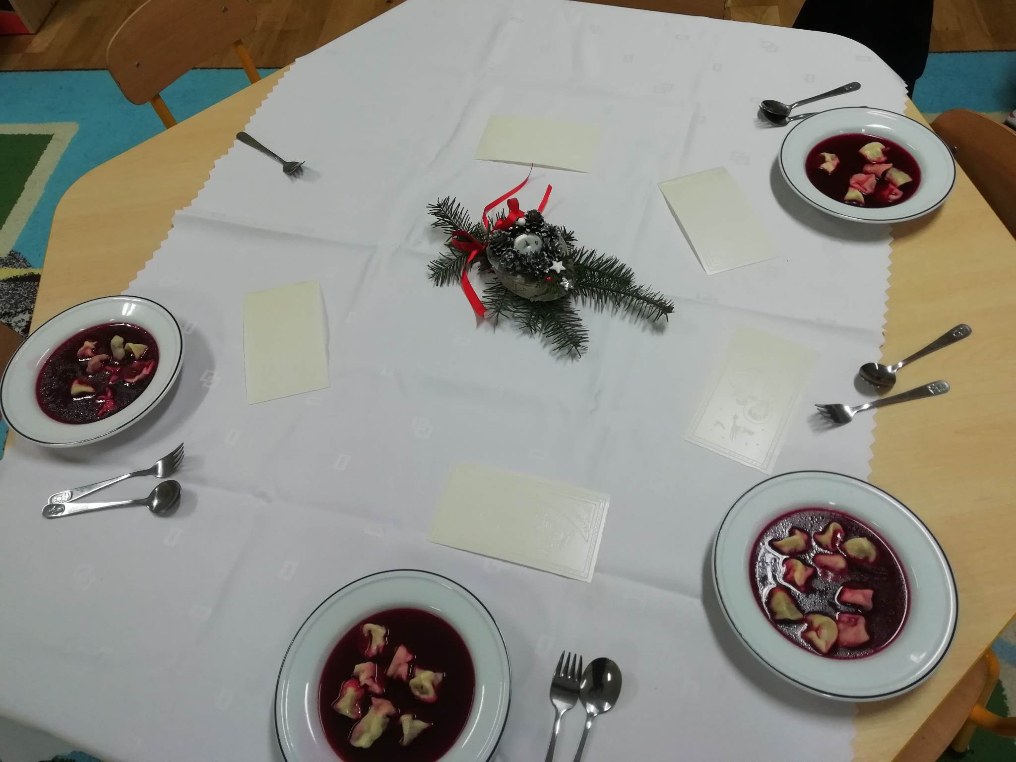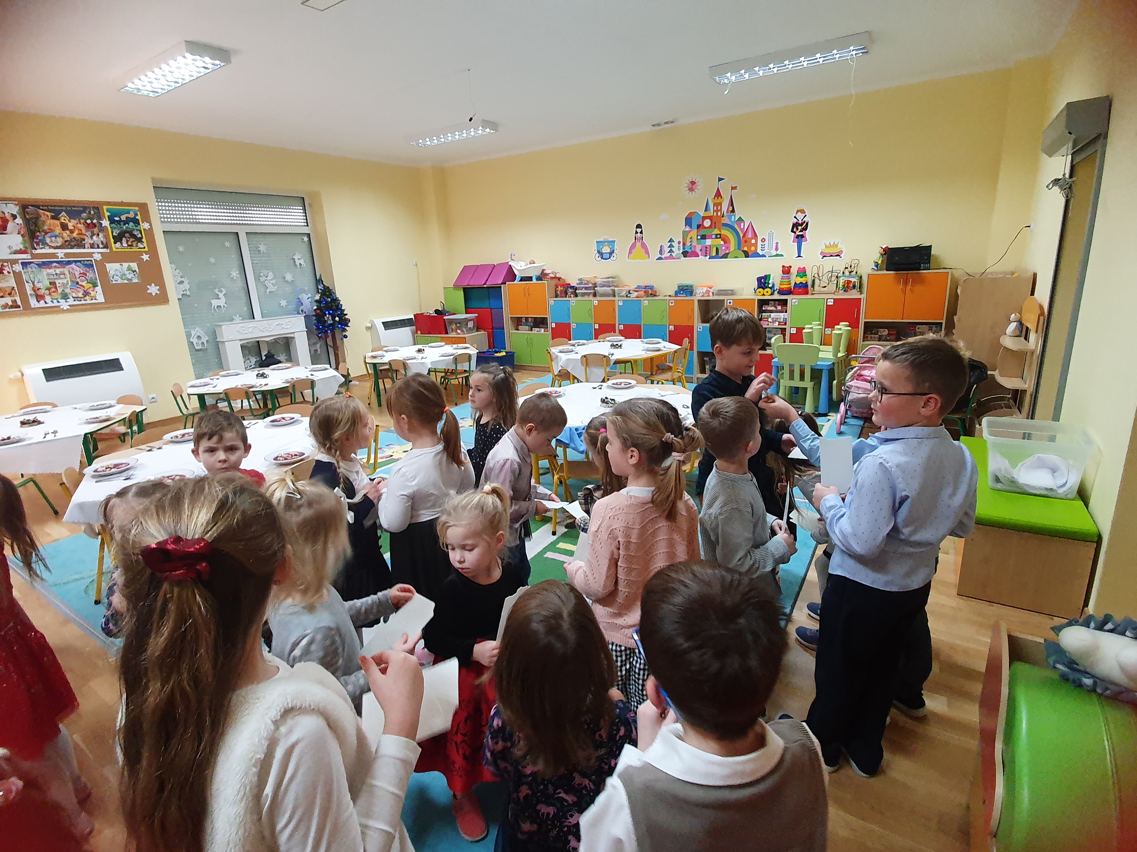 W dzień przedszkolnej wigilii panowała radosna, ożywiona atmosfera. Świąteczne dekoracje oraz dzieci w odświętnych strojach wprowadzały nastrój oczekiwania na wyjątkowe, niecodzienne wydarzenie. Uroczystość rozpoczęła się od wspólnego kolędowania całej społeczności Zespołu Szkolno – Przedszkolnego w Strzeszynie. O wyznaczonej godzinie w jednej sali zebrały się dzieci wraz z całym personelem przedszkola. Wszyscy podzielili się opłatkiem, a następnie wspólnie zjedli barszczyk z uszkami i pierogi. Nie zabrakło również prezentów, które dzieci znalazły pod choinką.