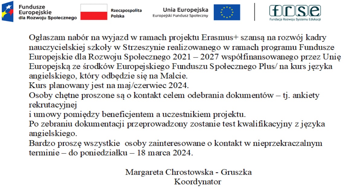 Projekt Erasmus+ szansą na rozwój kadry nauczycielskiej szkoły w Strzeszynie realizowanego w ramach programu Fundusze Europejskie dla Rozwoju Społecznego 2021-2027