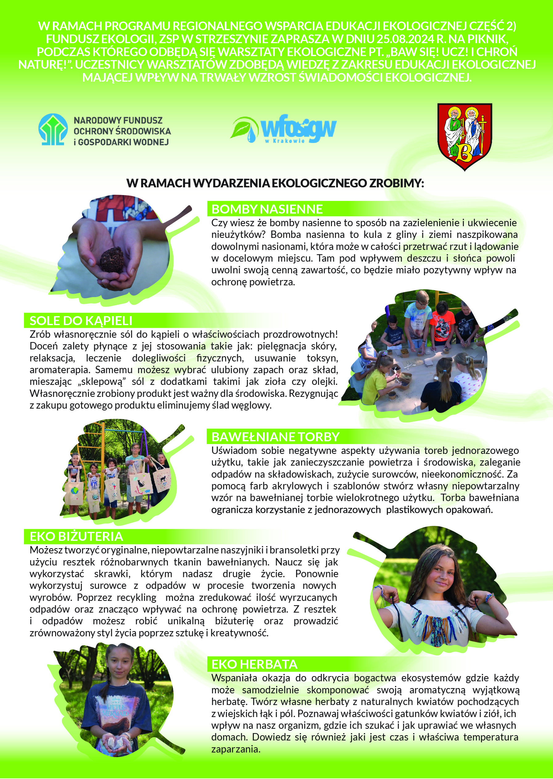 ZSP W STRZESZYNIE ZAPRASZA W DNIU 25.08.2024 R. NA PIKNIK, PODCZAS KTÓREGO ODBĘDĄ SIĘ WARSZTATY EKOLOGICZNE PT. BAW SIE! UCZ! I CHROŃ NATURĘ!”. UCZESTNICY WARSZTATÓW ZDOBĘDĄ WIEDZĘ Z ZAKRESU EDUKACJI EKOLOGICZNEJ MAJĄCEJ WPŁYW NA TRWAŁY WZROST ŚWIADOMOŚCI EKOLOGICZNEJ.