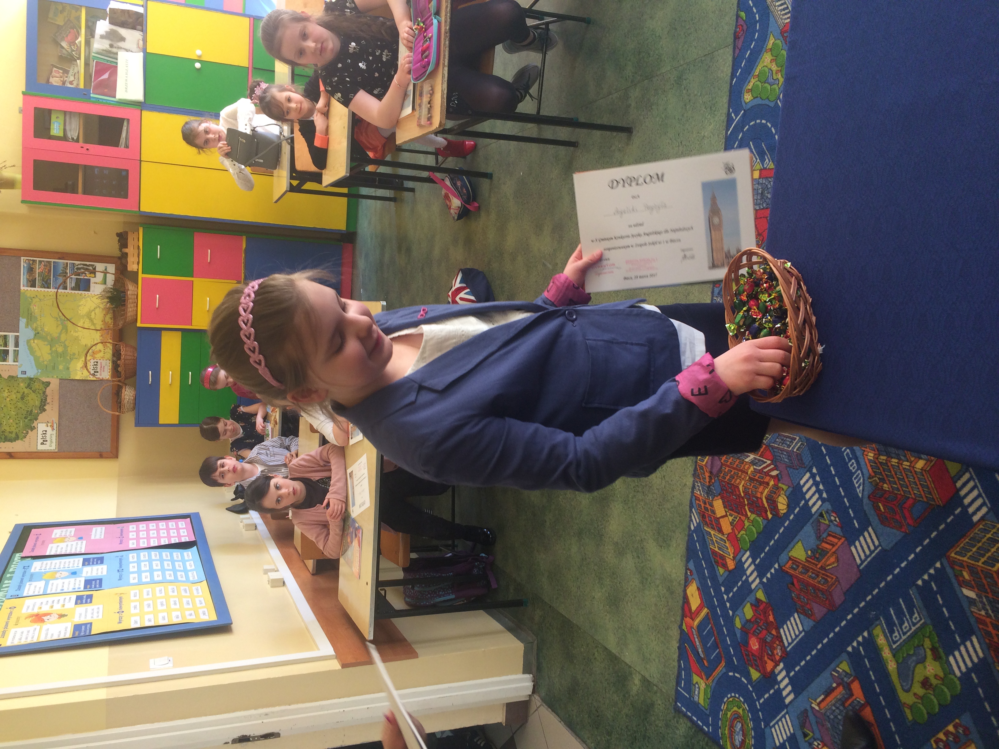 Nasza druga reprezentantka, Angelika Przybyło (30,5p.) zajęła 6 miejsce. Każdy z uczestników otrzymał pamiątkowy dyplom, a zdobywcy I, II i III miejsca dodatkowo otrzymali cenne i pomocne w nauce języka angielskiego nagrody książkowe. Warto wspomnieć, że poziom konkursu był naprawdę wysoki więc oczywistym jest, że każdy uczestnik dołożył wiele wysiłku aby osiągnąć jak najlepszy wynik. Serdecznie gratuluję moim uczennicom zdobycia tak wysokich miejsc oraz życzę im dalszych sukcesów, zwłaszcza w konkursach językowych.