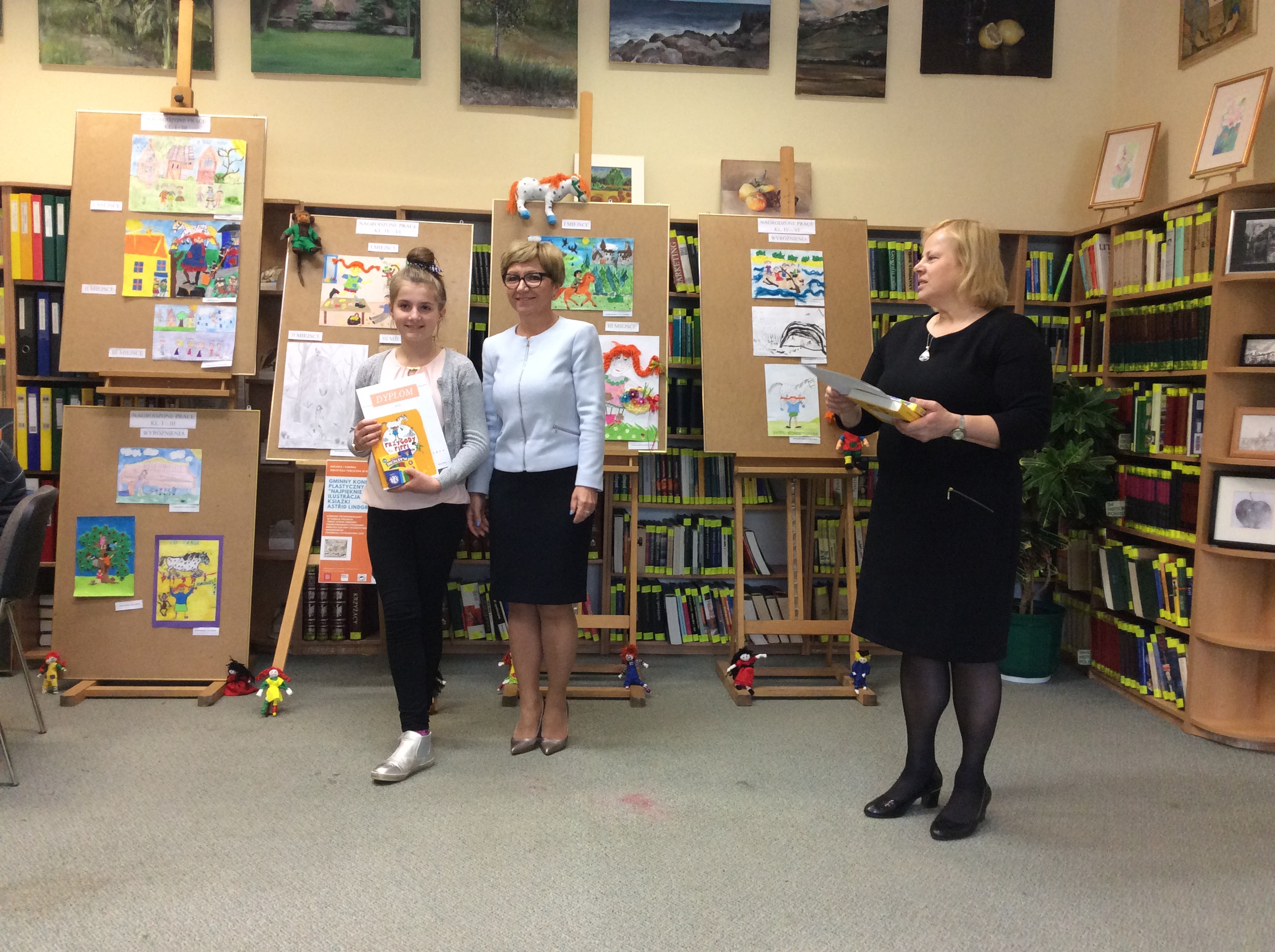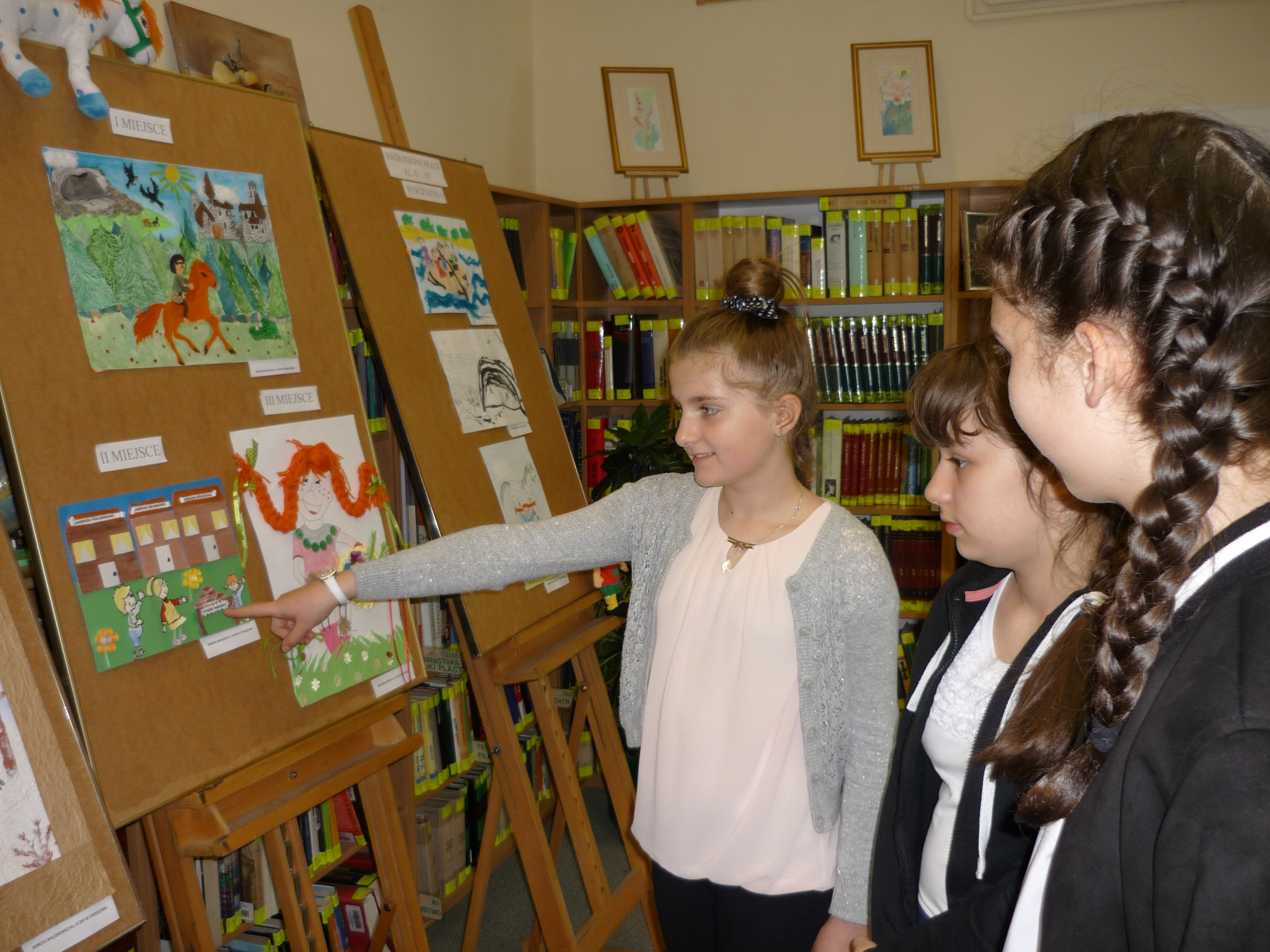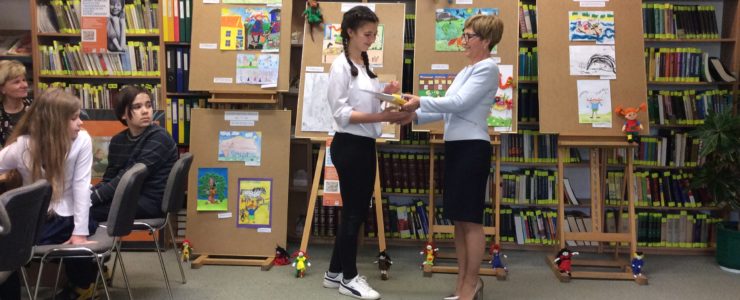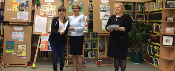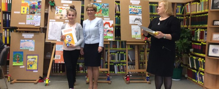 Dziewczynki otrzymały z rąk dyrektora biblioteki pani Elżbiety Knapik atrakcyjne nagrody, dyplomy i gratulacje. Były też wspólne zdjęcia, oglądanie wystawy pokonkursowej i słodki poczęstunek.