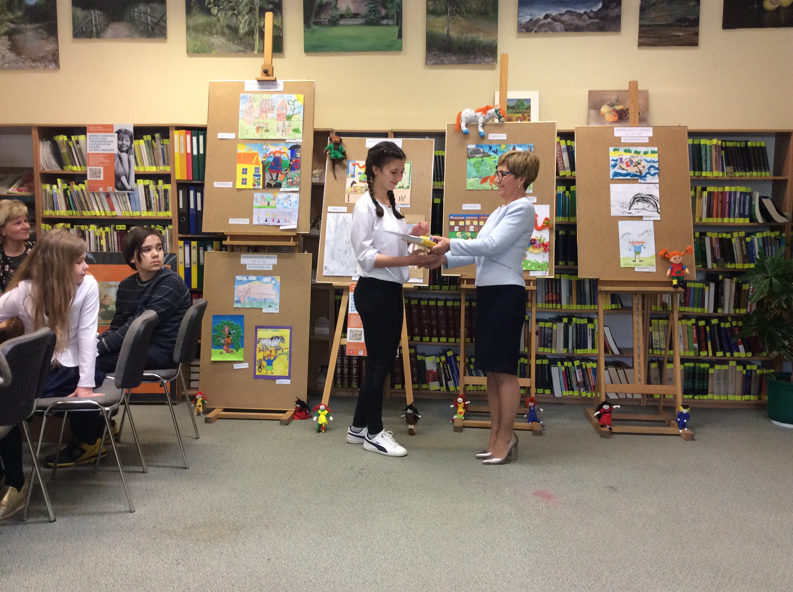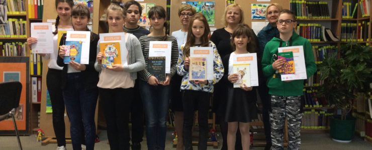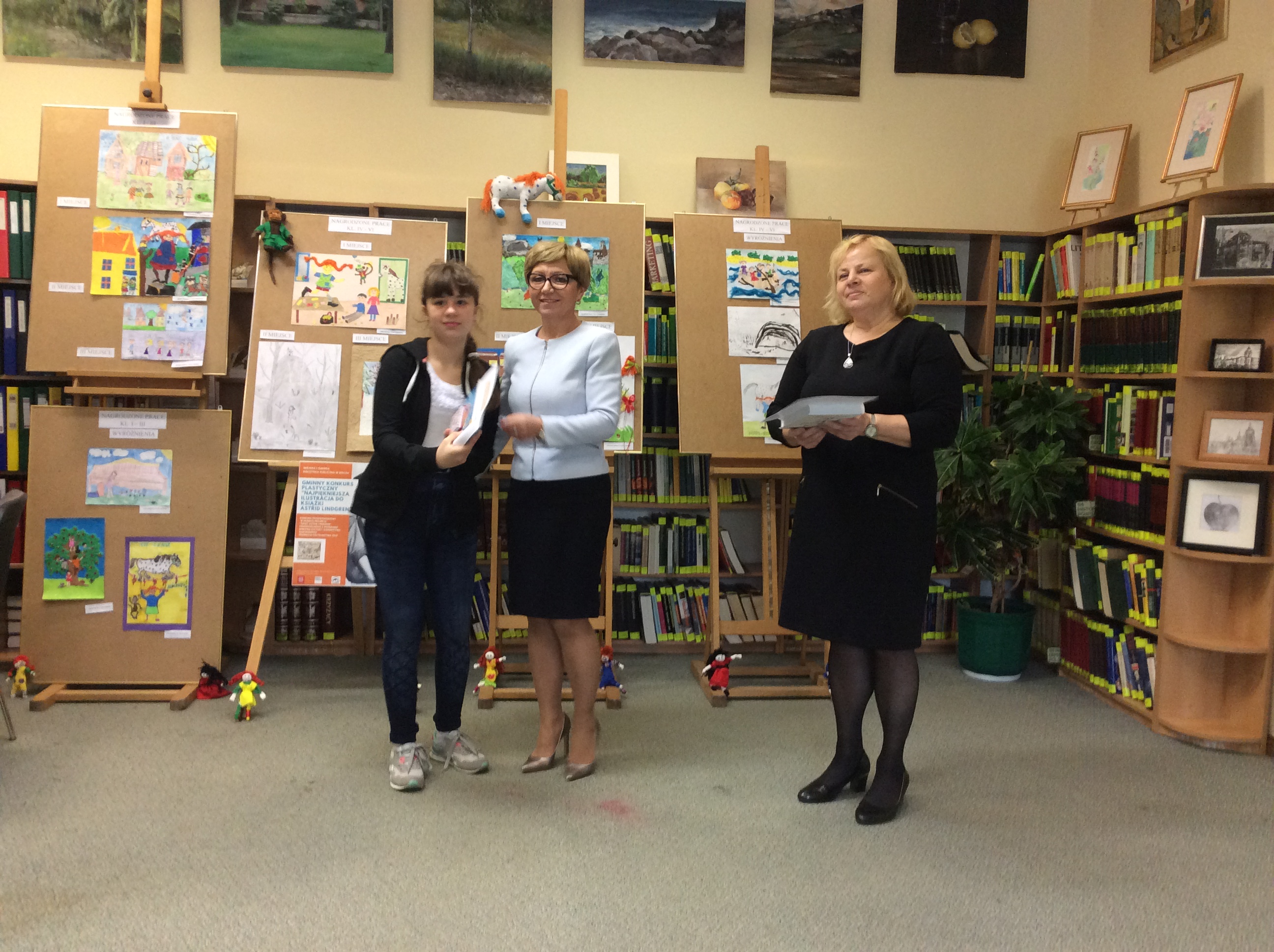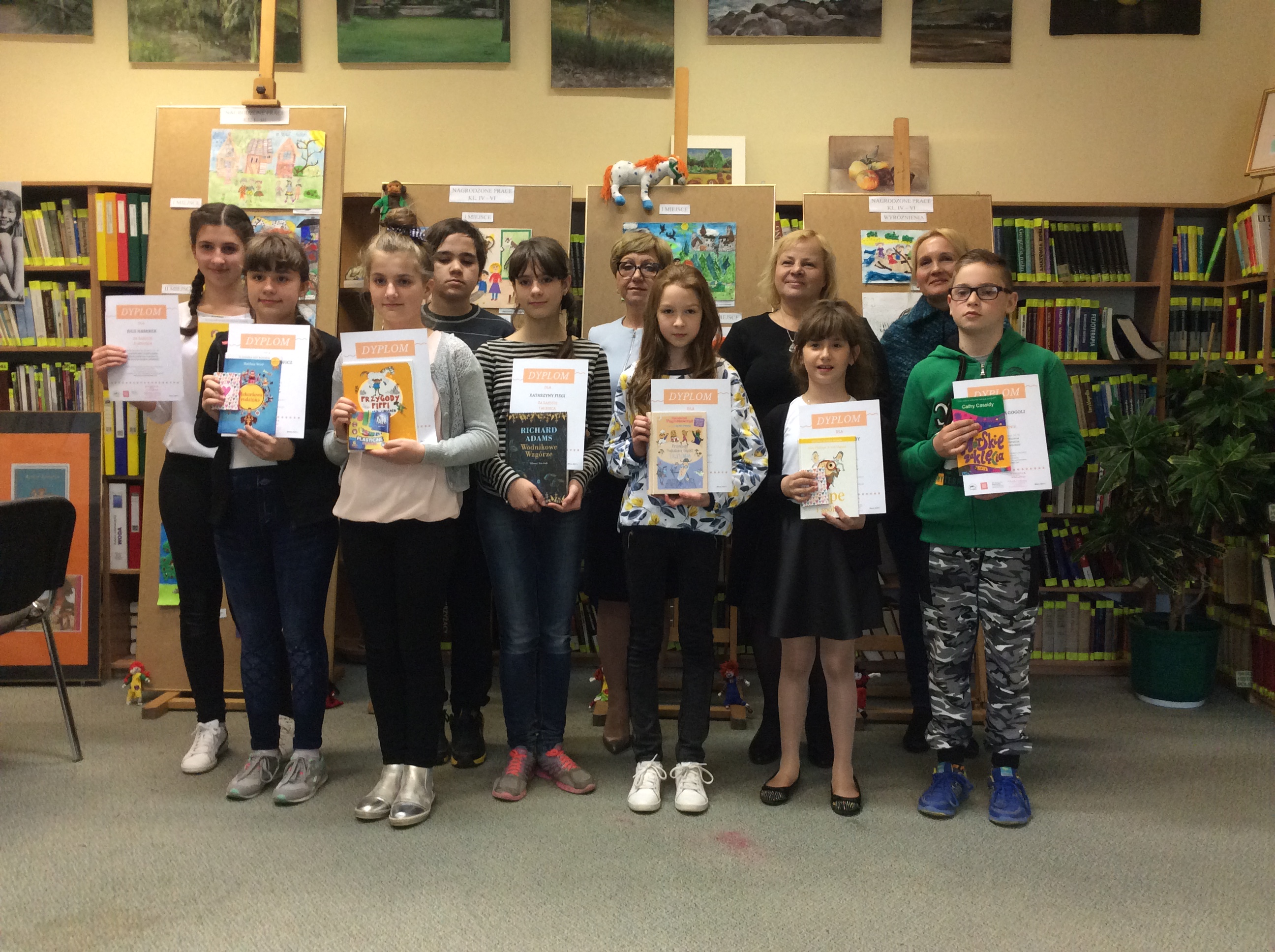 Dziewczynki otrzymały z rąk dyrektora biblioteki pani Elżbiety Knapik atrakcyjne nagrody, dyplomy i gratulacje. Były też wspólne zdjęcia, oglądanie wystawy pokonkursowej i słodki poczęstunek.