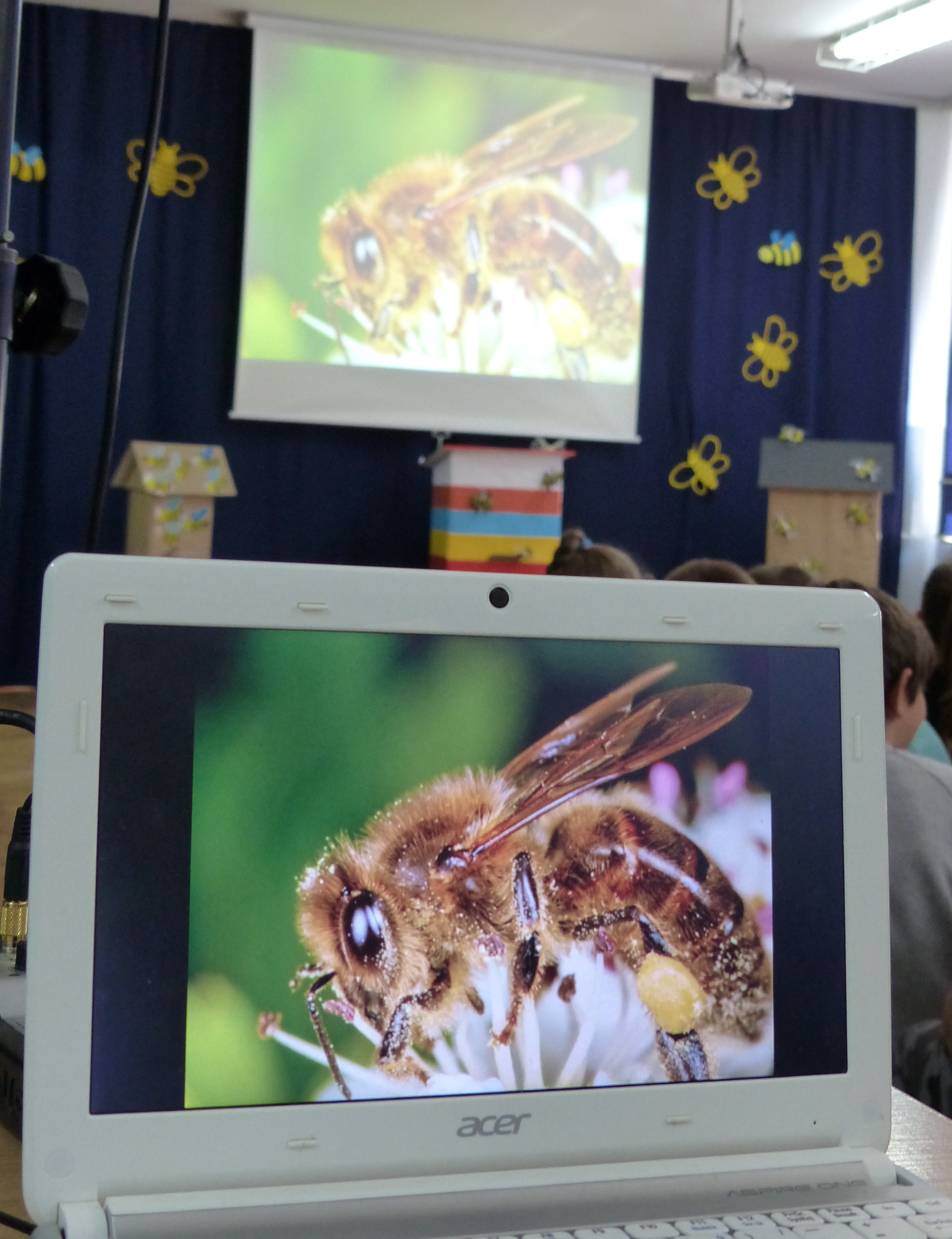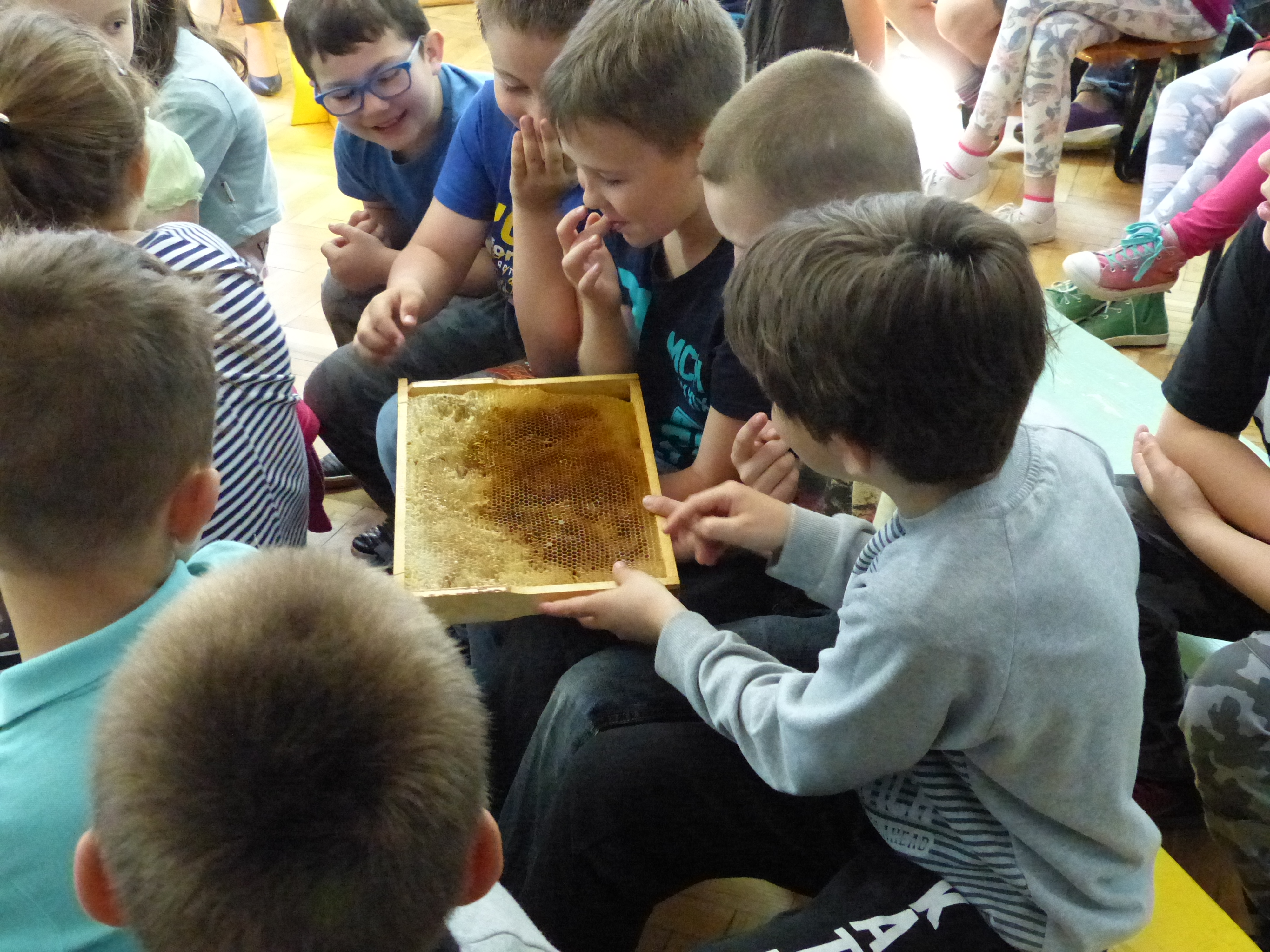 Dzieci mogły z bliska obejrzeć sprzęt, którego używa w swojej codziennej pracy: dymkę- zwaną podkurzaczen, ramkę, kapelusz, dłuto i odsklepiacz widelcowy. Dowiedziały się kiedy i dlaczego pszczoły żądlą, i jak tego unikać.